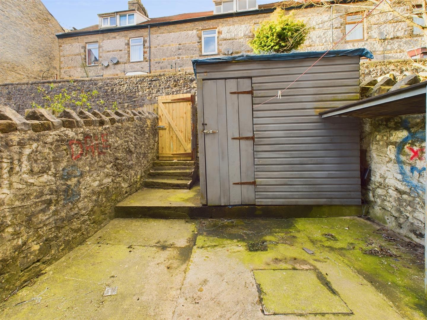 Outside - To the rear of the property there is a good sized flagged yard and storage shed.