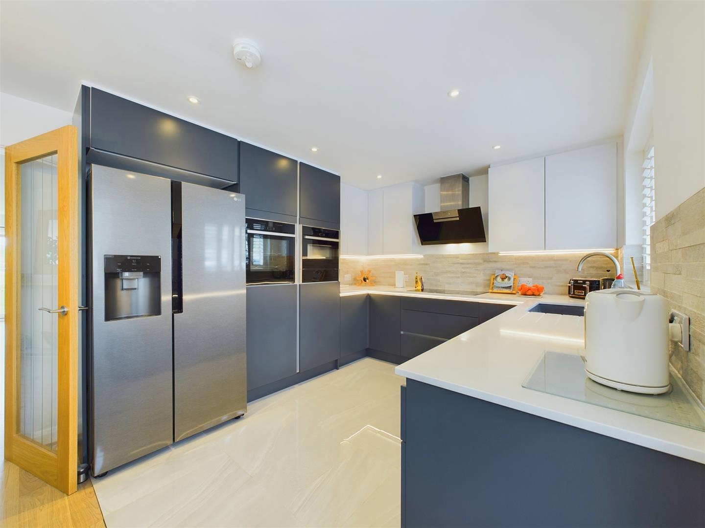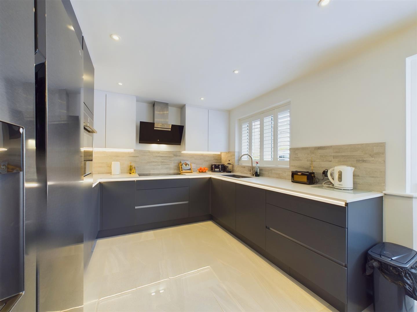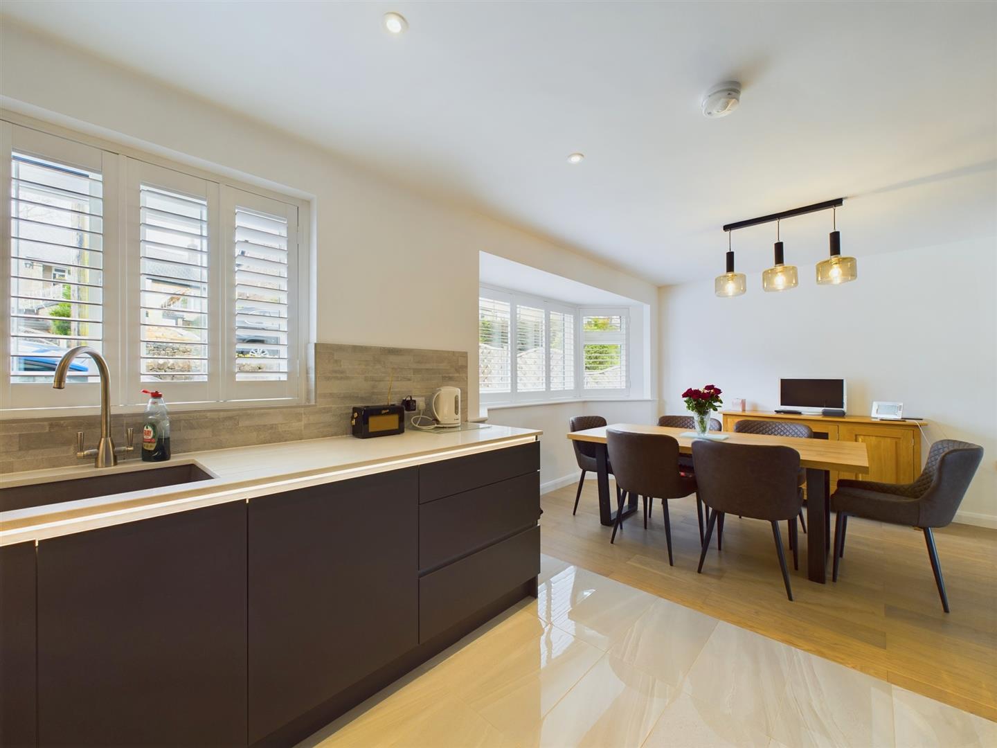 Dining/Kitchen - 6.15m x 3.58m (20'2" x 11'9") - Fitted with an excellent quality range of base and eye level units and working surfaces, incorporating a one and a half bowl single drainer sink unit with tiled splashbacks. With integrated Neff oven, with integrated Neff microwave and warming drawer below and five ring Neff induction hob with extractor over. With integrated Neff dishwasher and space and fitting for an American style fridge/freezer. Tiled flooring with under floor heating. With uPVC sealed unit double glazed window to front with privacy shutters.