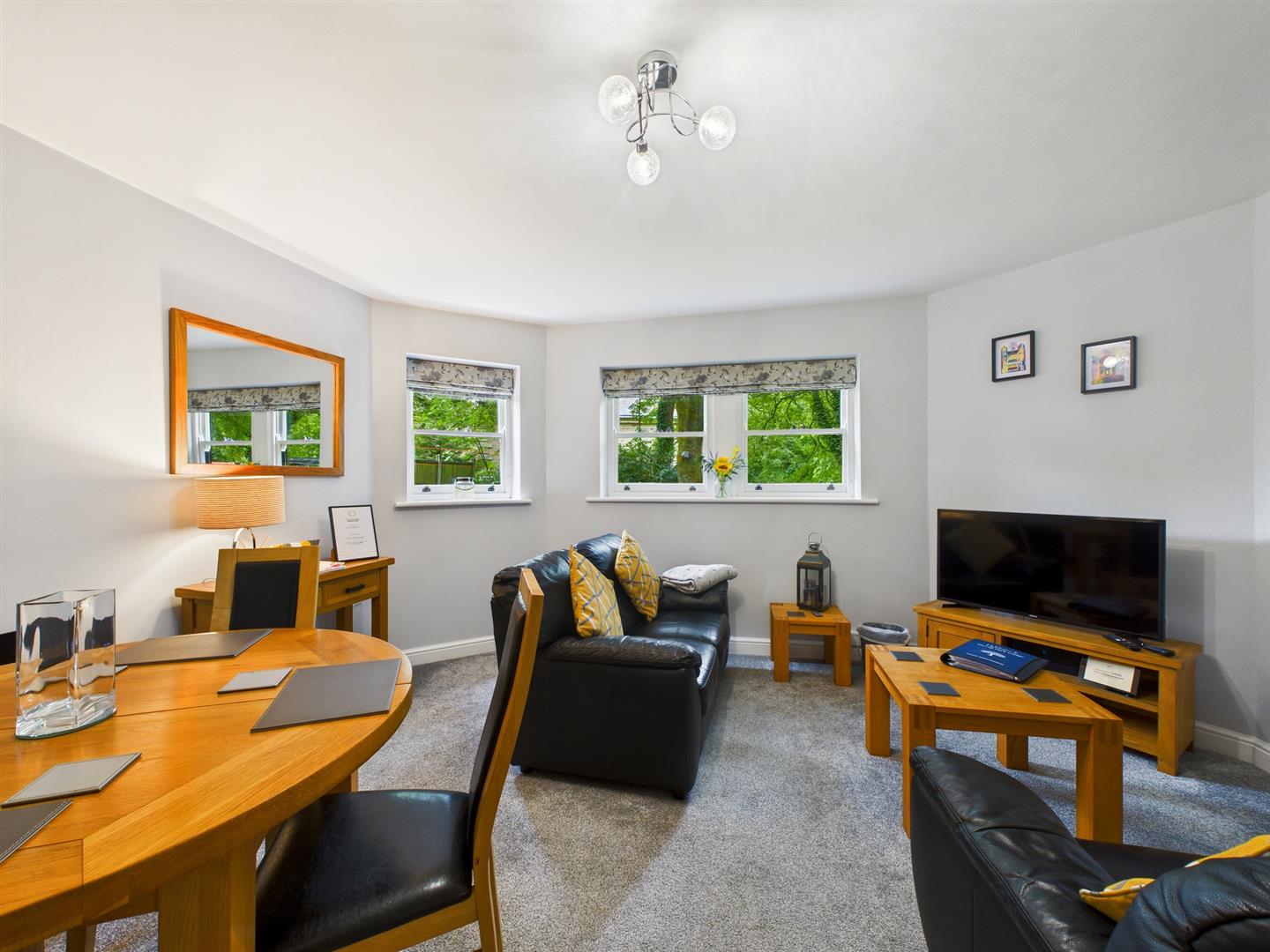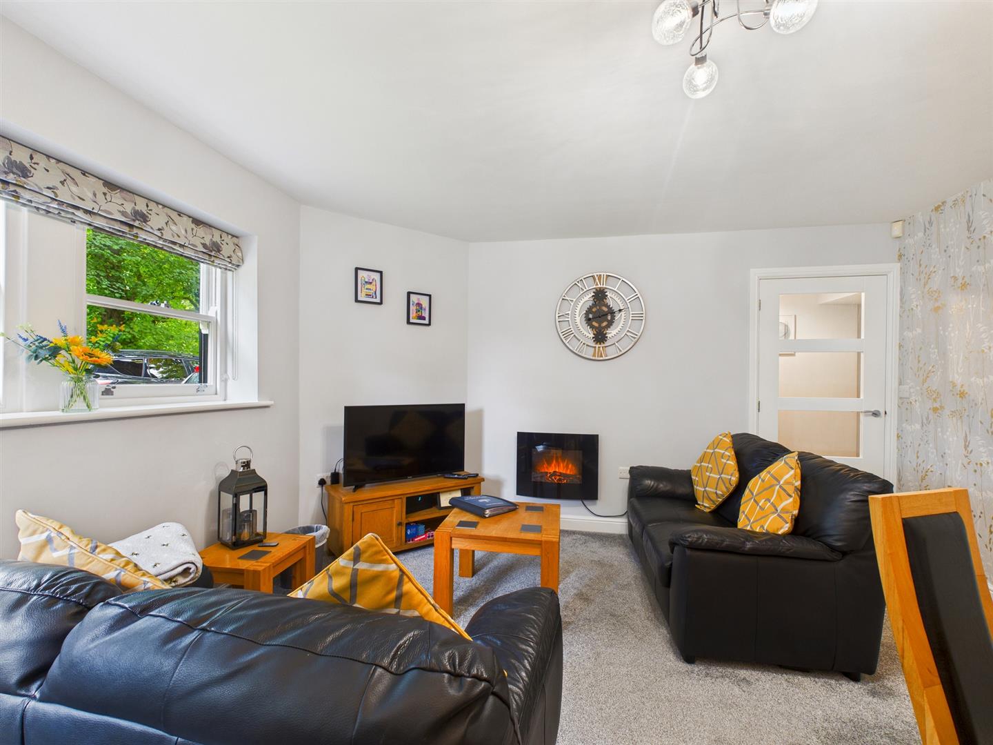 Lounge/Dining Room - 4.34m x 4.06m (14'3" x 13'4") - With a wall mounted electric log-effect fire, three sealed unit double glazed sash windows to front, T.V., aerial point and wall mounted convection radiator.