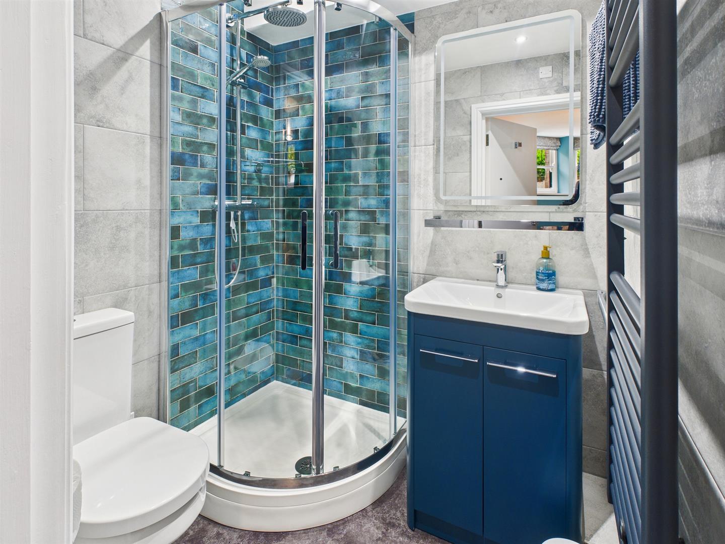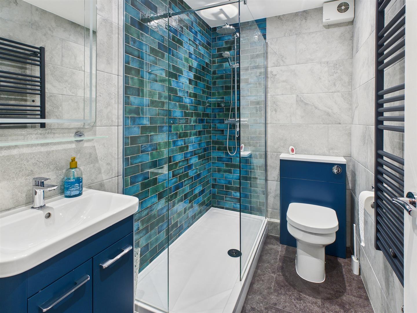 En-Suite Shower Room - 1.70m x 1.52m (5'7" x 5'0") - With a fully glazed and fully tiled , shower cubicle and rainfall shower, vanity wash basin with cupboard below and low-level W.C. With heated towel rail and extractor fan.