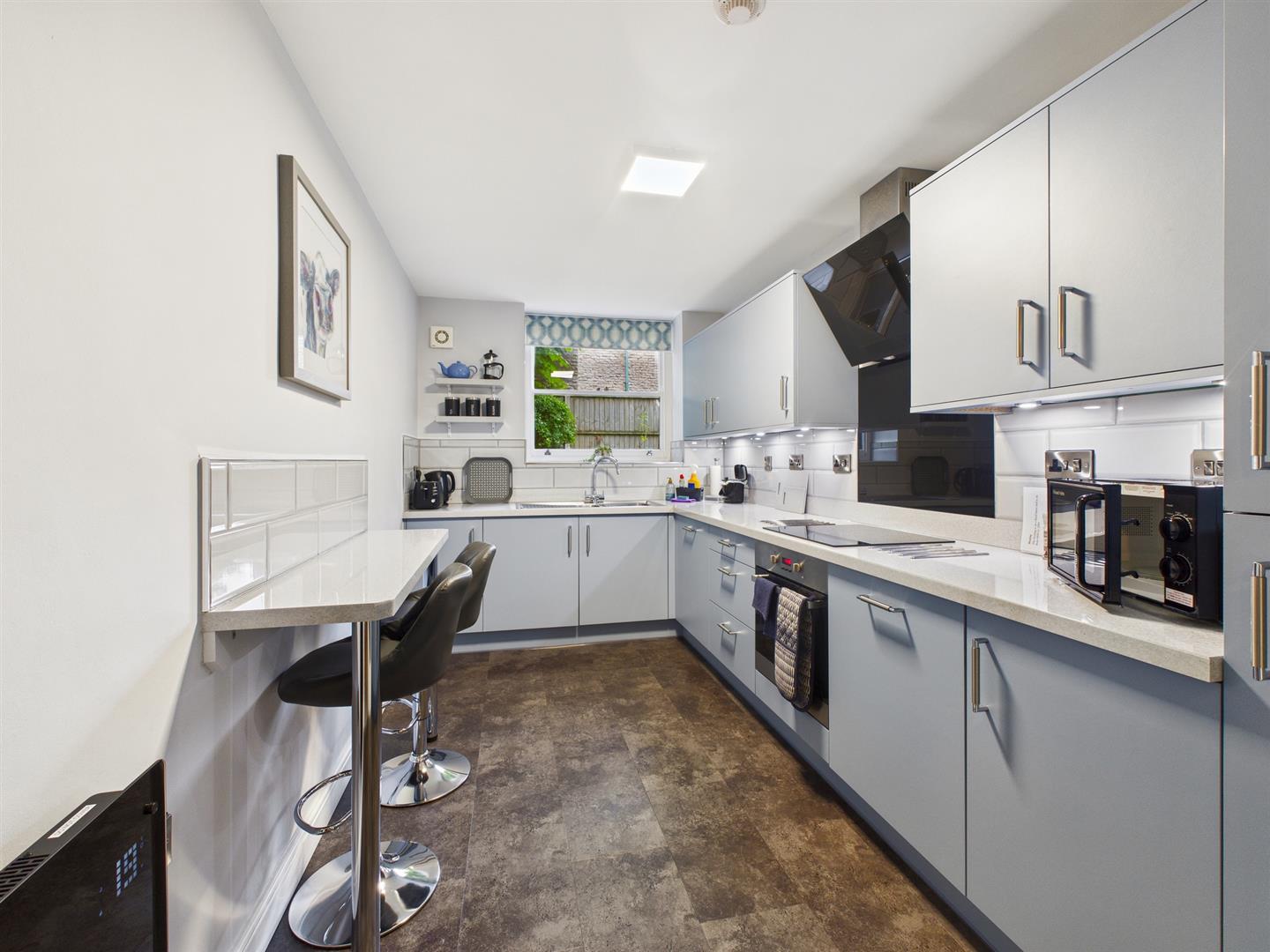 Kitchen - 4.27m x 2.31m (14'0" x 7'7") - Fitted with an excellent quality range of base and eye level units and working surfaces, incorporating a one and a half bowl stainless steel single drainer sink unit with tiled splash backs. With integrated stainless steel oven with four ring ceramic hob and extractor over, integrated fridge/freezer, integrated dishwasher and integrated washer /dryer machine. With sealed unit double glazed sash window to side, wall mounted convection radiator and breakfast bar. Extractor fan.