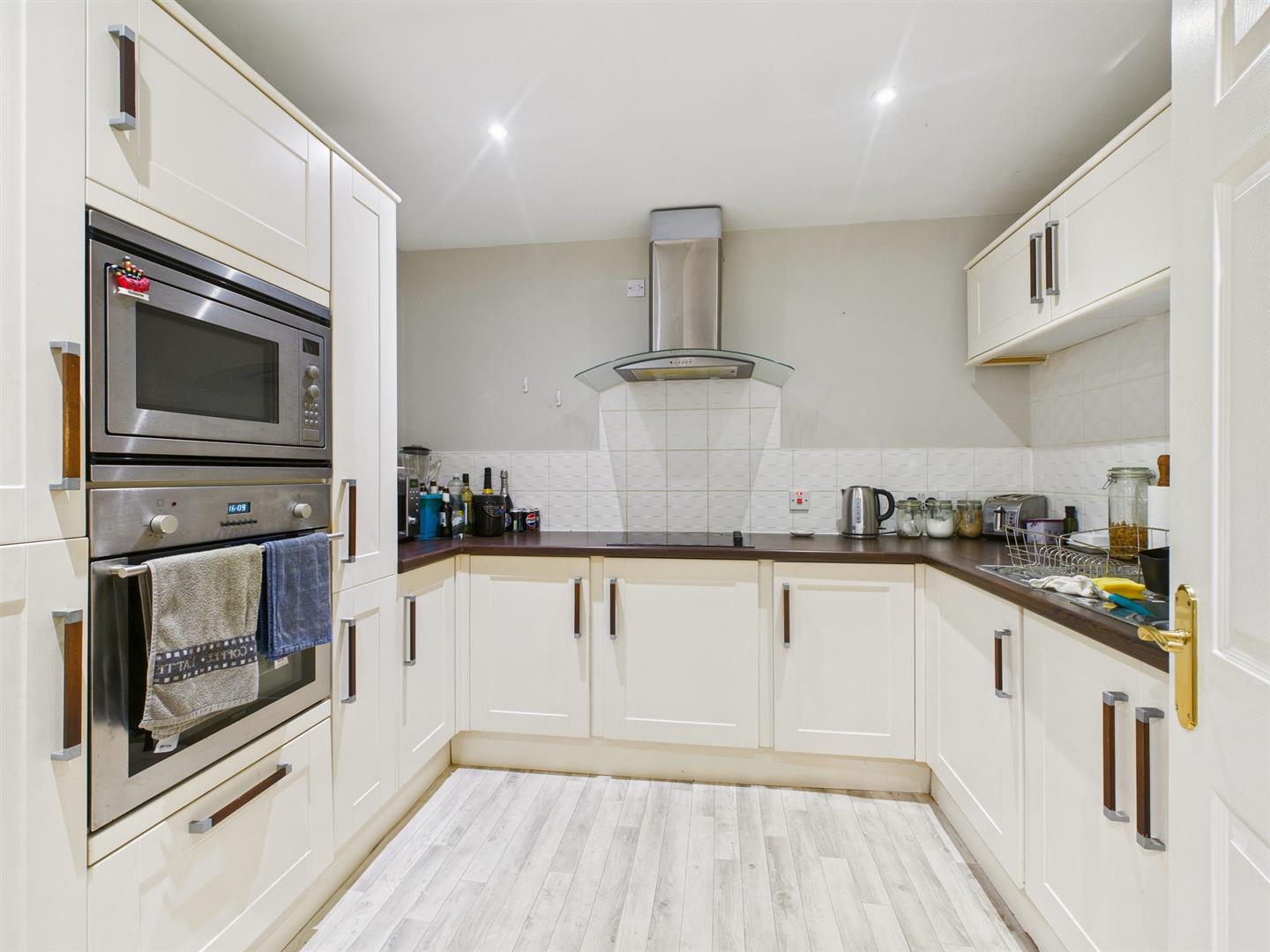 Kitchen - 2.74m x 2.64m (9'22" x 8'8") - Fitted with an excellent quality range of base and eye level units and working surfaces, incorportaing a one-and-half bowl stainless steel single drainer sink unit with tiled splashbacks. With integrated four ring ceramic hob with stainless steel extractor over; integrated oven; integrated microwave; integrated fridge/freezer; integrated dishwasher and integrated washing machine.