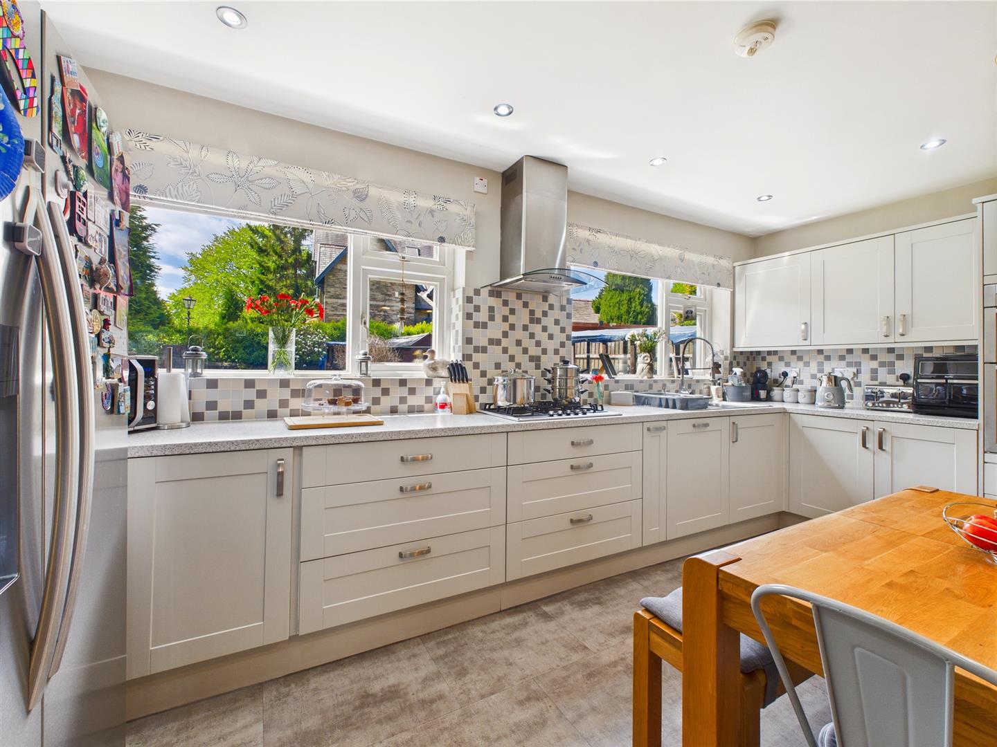 Dining/Kitchen - 4.98m x 2.95m (16'4" x 9'8") - Fitted with an excellent quality range of base and eye level units and working surfaces, incorporating a one and a half bowl stainless steel single drainer sink unit with tiled splash back. With five ring stainless steel gas hob with stainless steel extractor over, integrated Neff oven and integrated dishwasher. With space for an American style fridge/freezer, single radiator, T.V. aerial point and two uPVC sealed unit double glazed windows to rear. Ceiling downlighters and frosted uPVC sealed unit double glazed door to side.