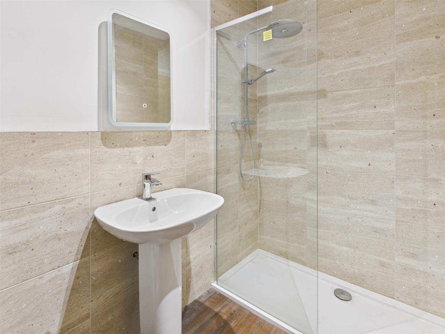 Shower Room - 2.39m x 1.57m (7'10" x 5'2") - Fitted with an excellent quality suite comprising pedestal washbasin and low-level w.c.. Fully tiled and glazed double shower unit with rainfall shower, extractor fan and stainless steel heated towel rail.
