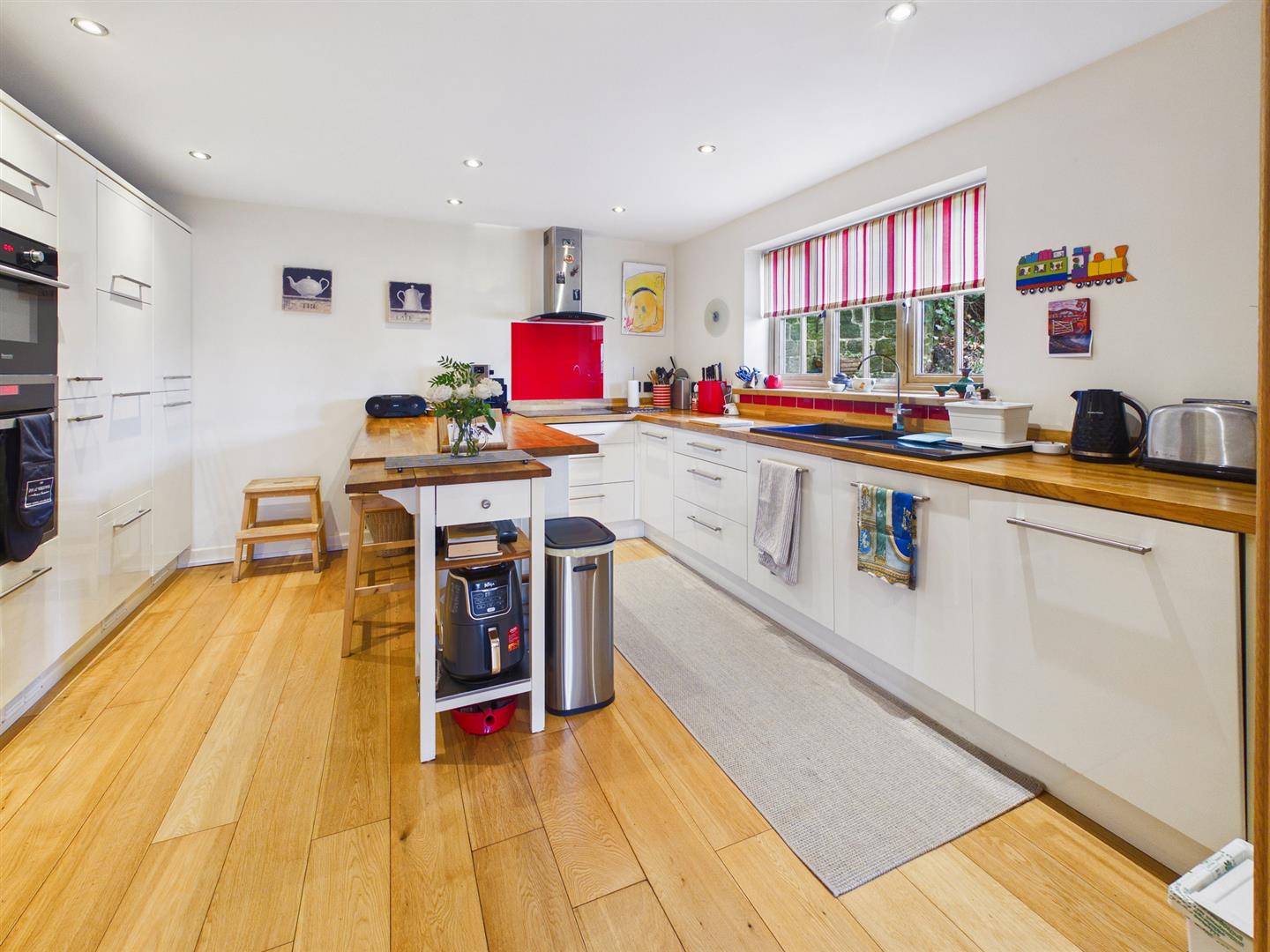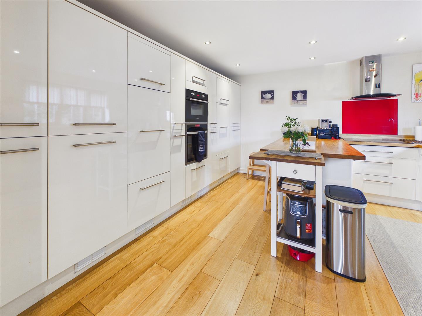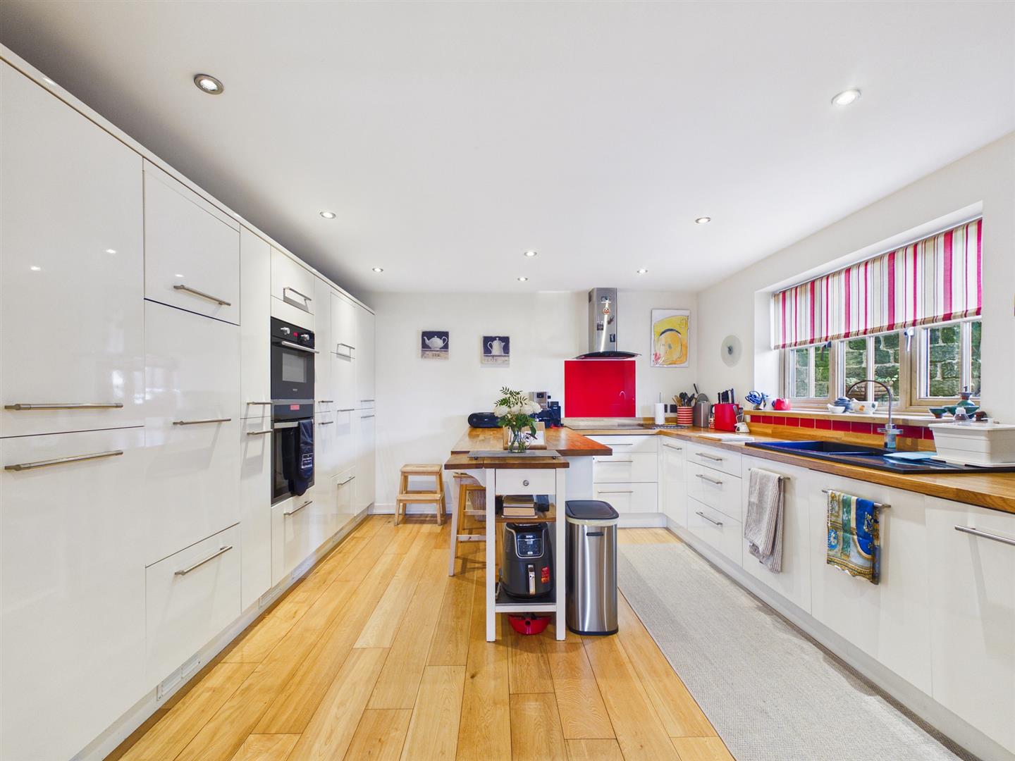 Kitchen - 3.96m x 3.91m (13'0" x 12'10") - Extensive range of quality units and breakfast bar with wooden work surfaces inset one and a half bow sink unit with mixer tap. Built in Electric oven and microwave/grill oven. Ceramic electric hob with extractor over. Integrated dishwasher, fridge and freezer. Spot lighting. Engineered wood flooring with underfloor heating. Double glazed window to front.