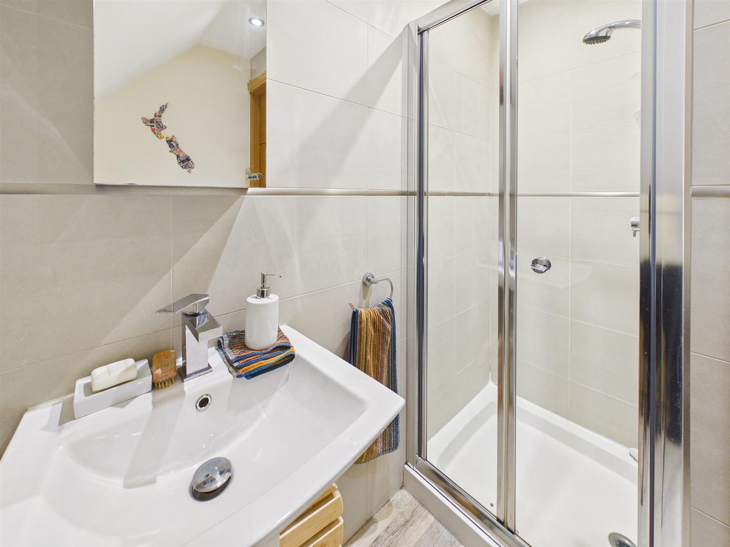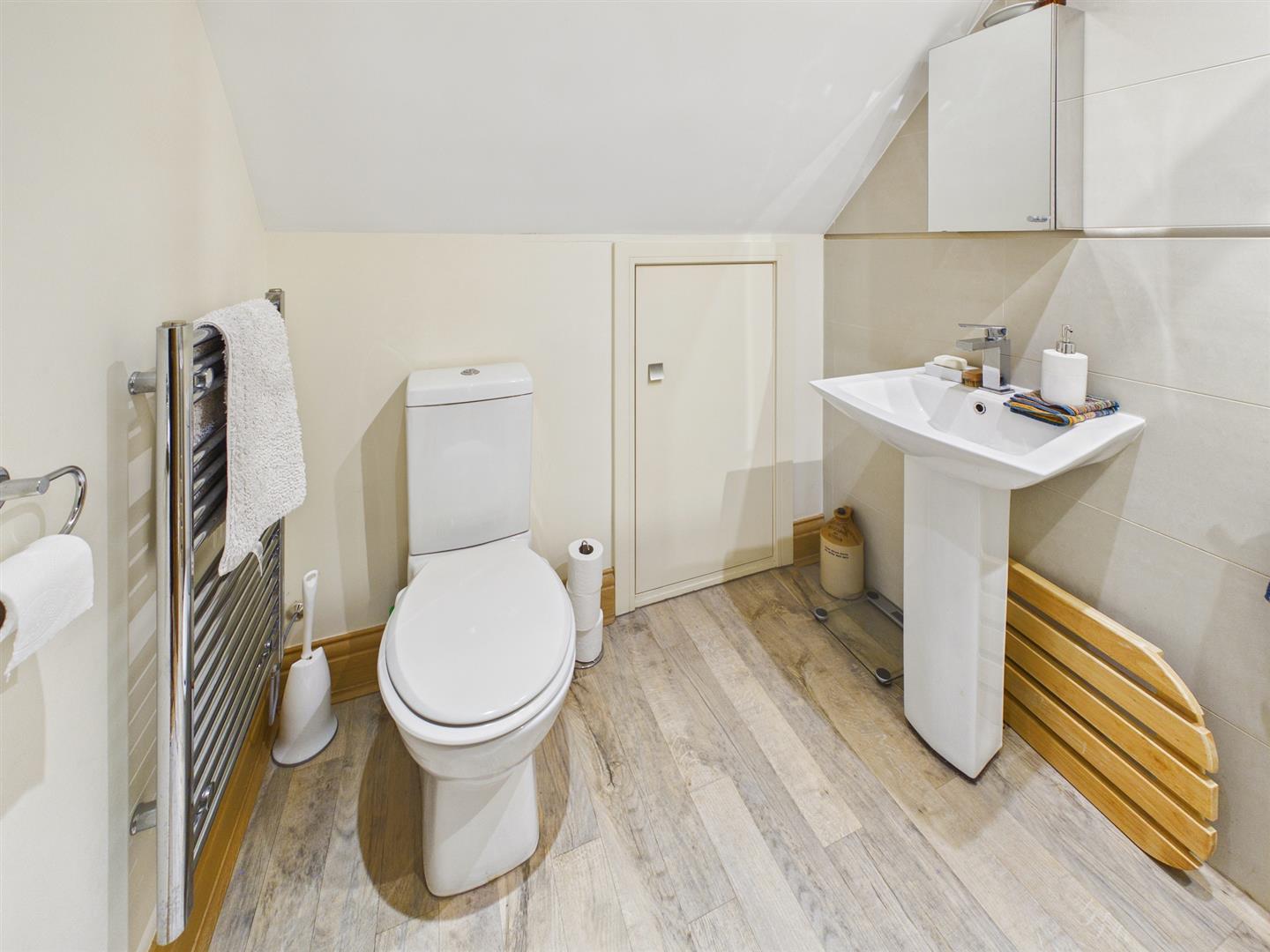 Shower Room - 1.78m x 1.40m (5'10" x 4'7") - Low level W.C. Pedestal hand wash basin. Tiled walls. Heated towel rail. Storage cupboard with underfloor heating controls.