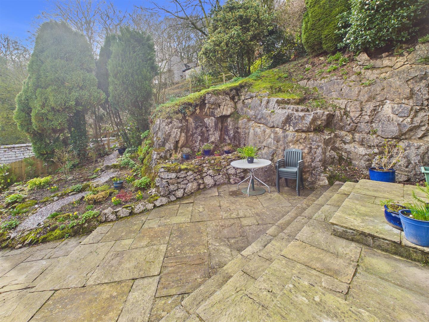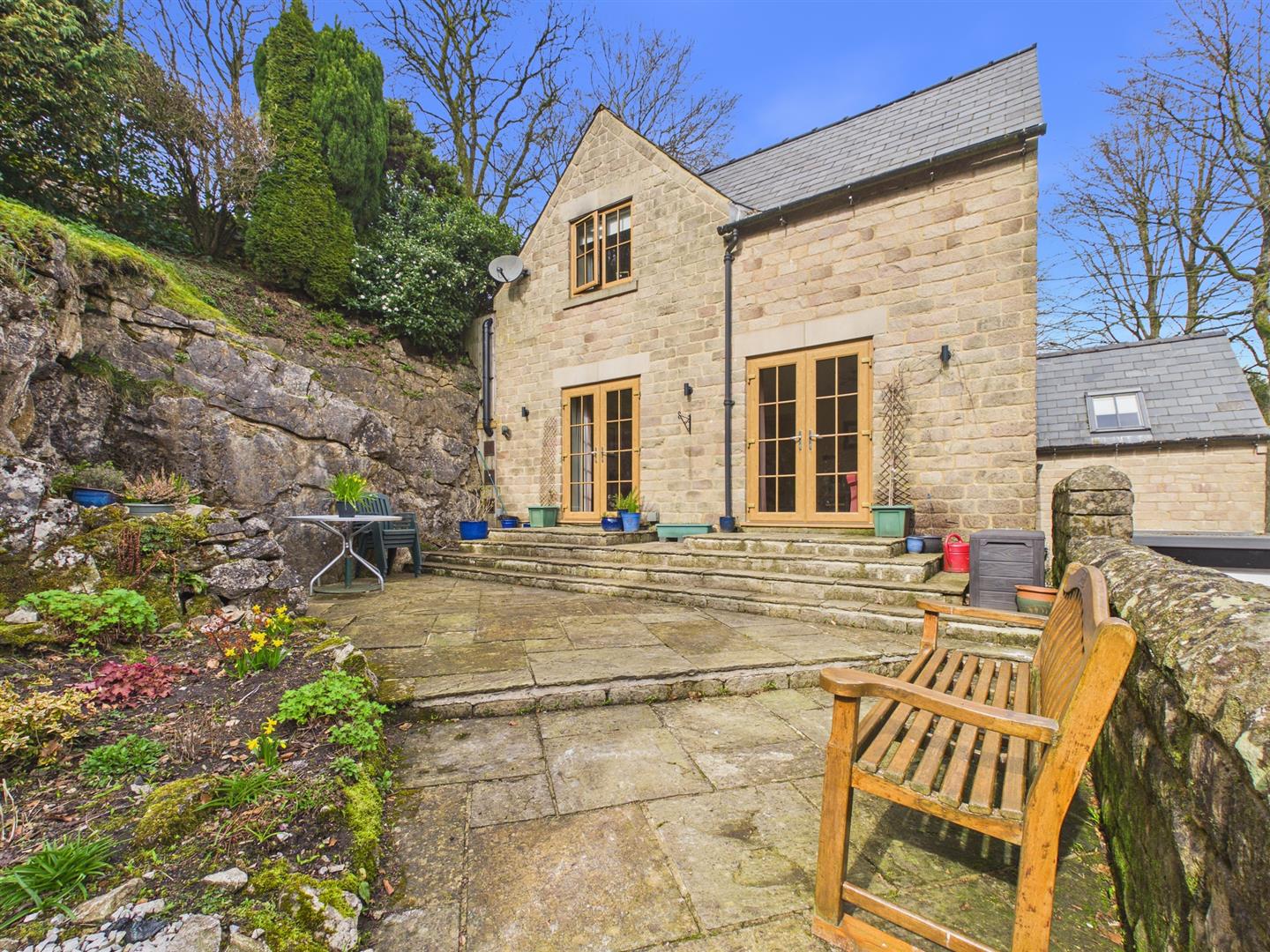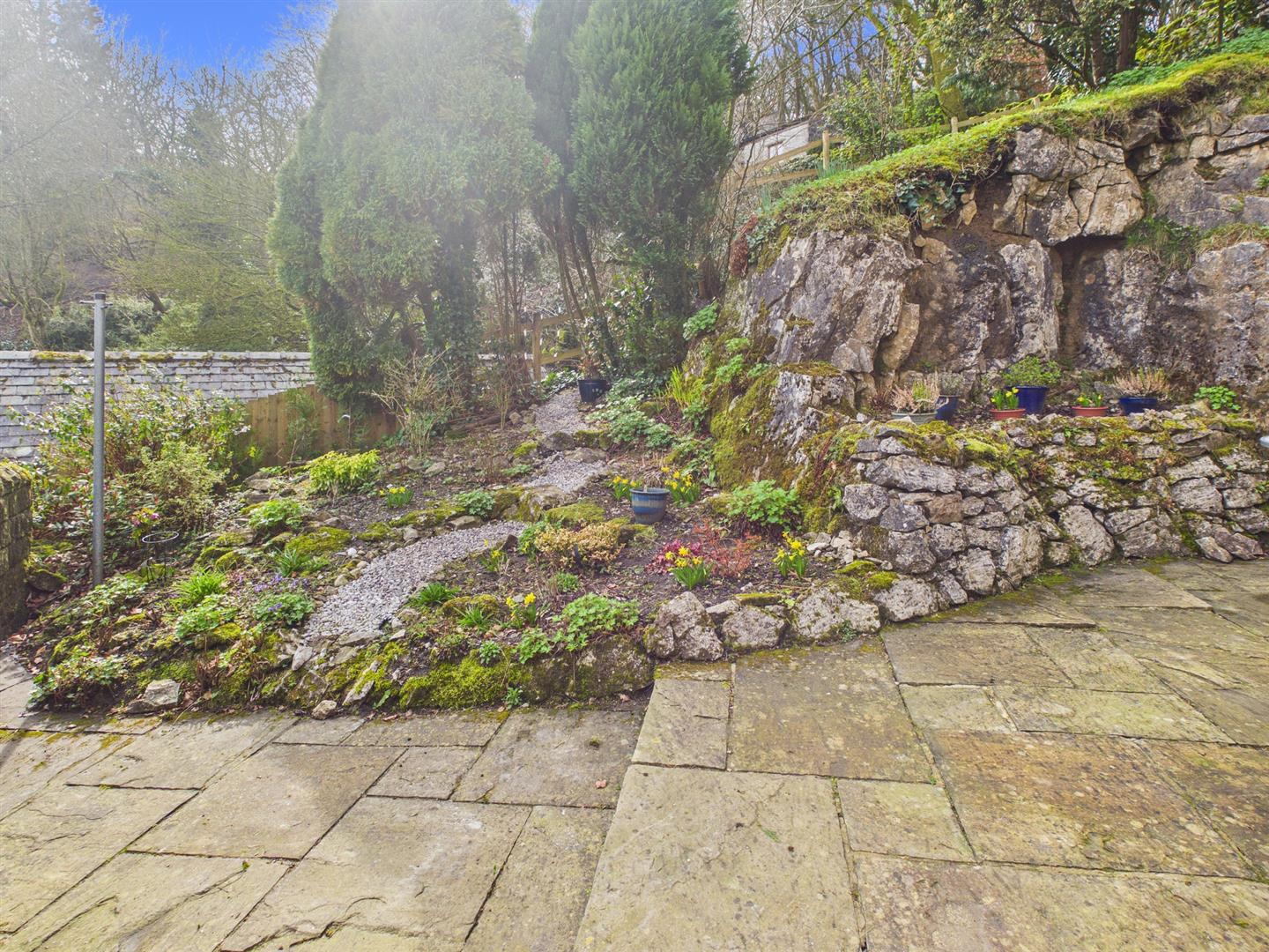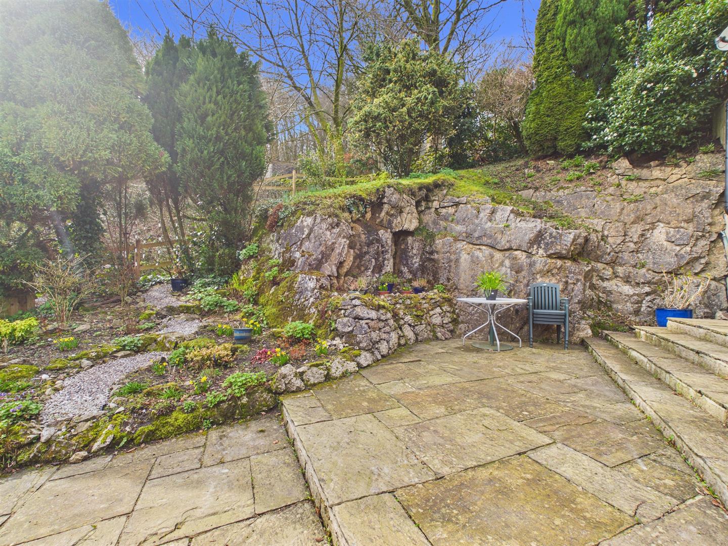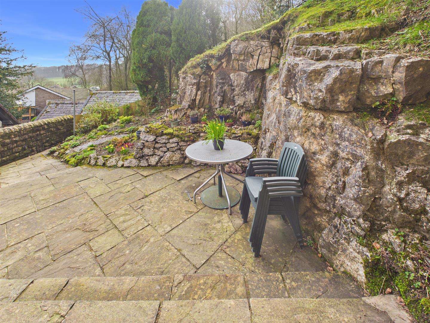 Garden - Steps down to patio area. Rockery with various flowers and shrubs. Mature trees and fencing and hedging borders. Open views to Grinlow Woods.