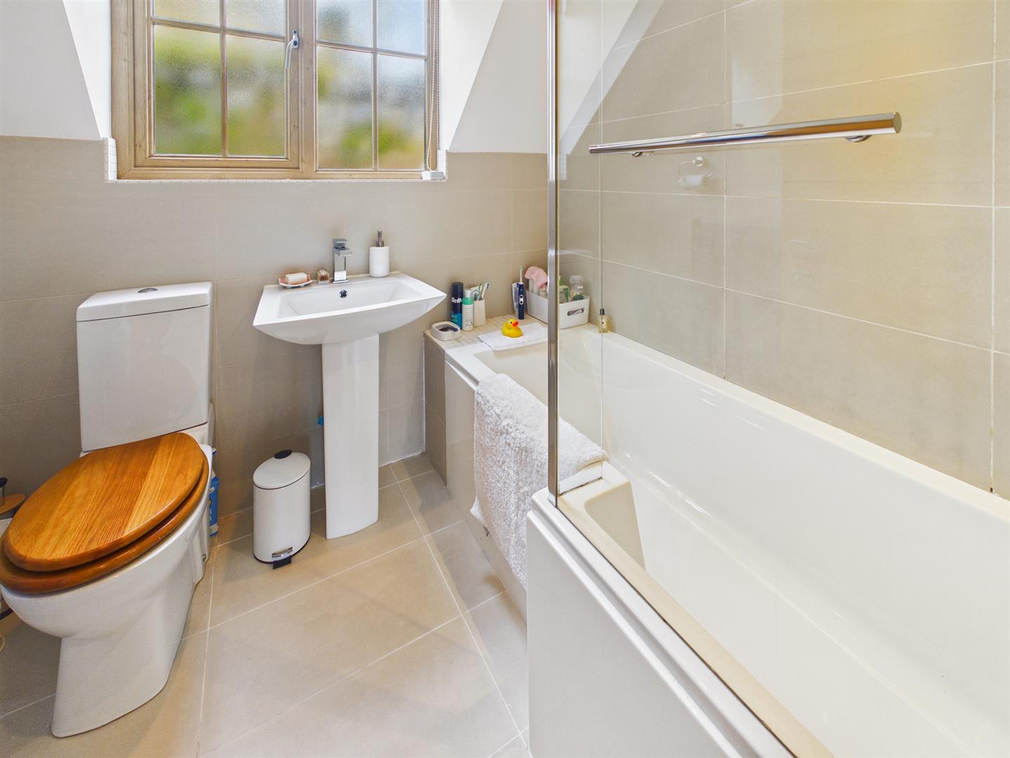 Bathroom - 2.03m x 1.91m (6'8" x 6'3") - Low level W.C, pedestal wash hand basin. Panel enclosed bath with shower. Heated towel rail. Double glazed window to rear.