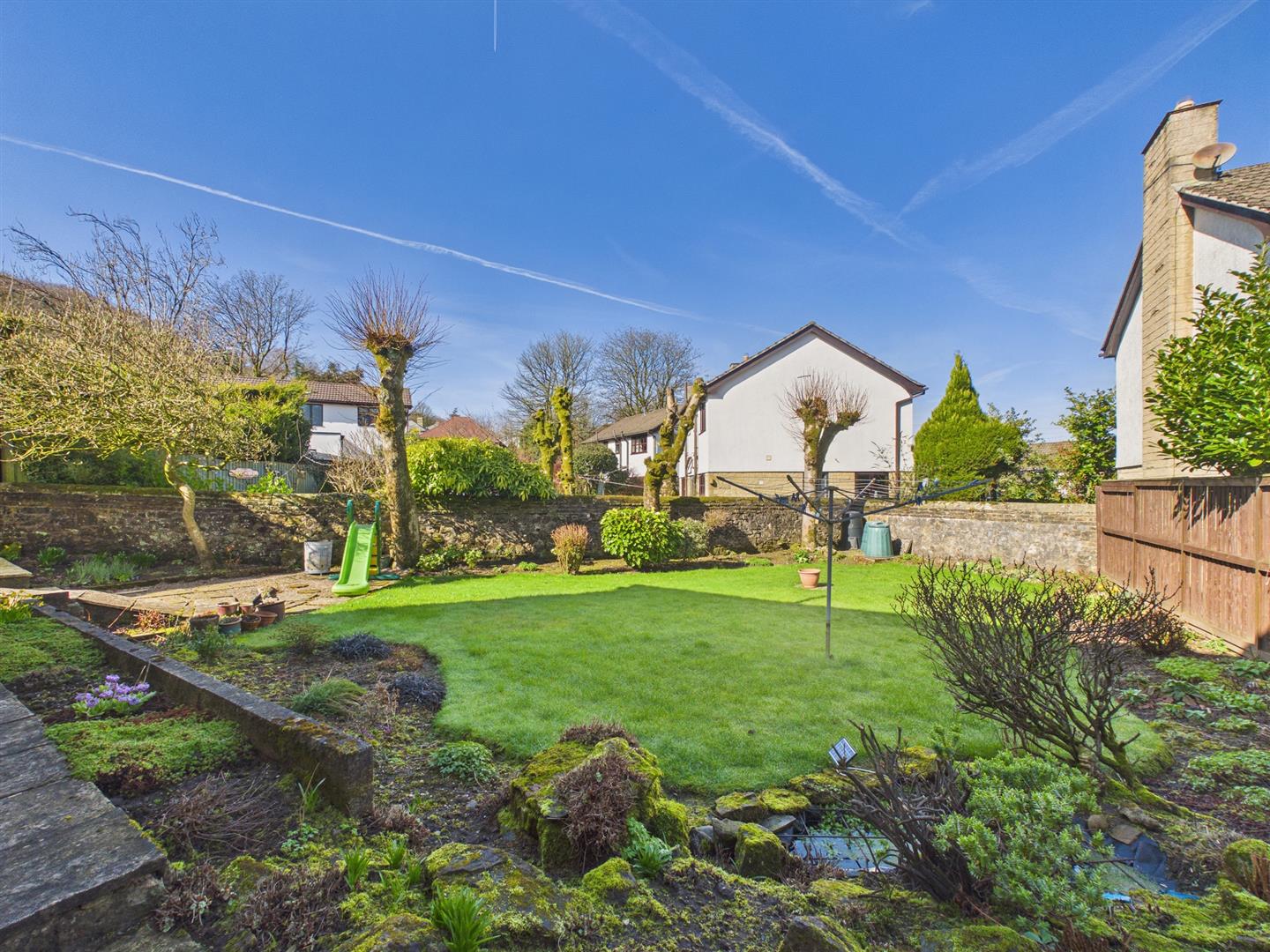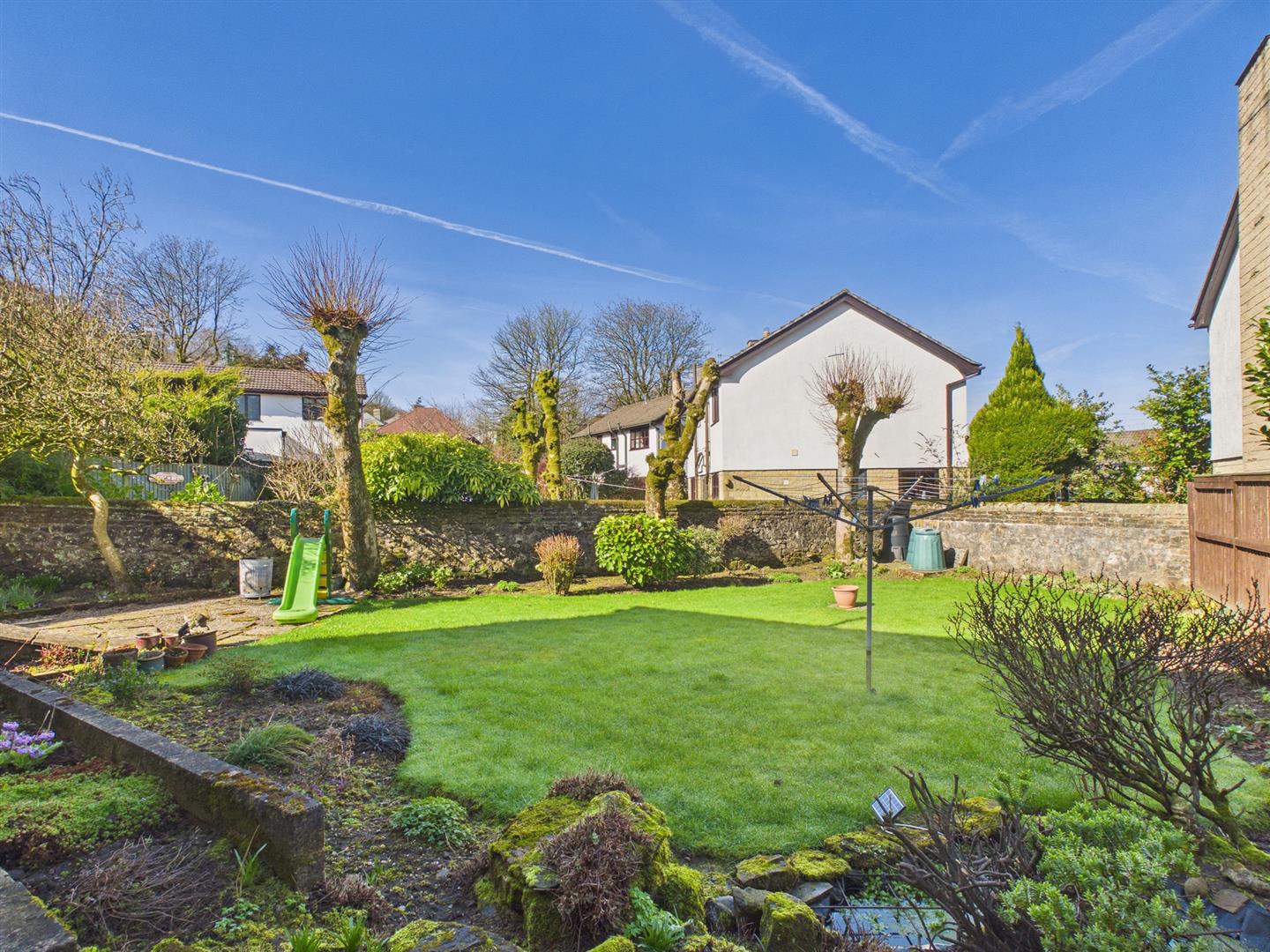 Garden - Mainly laid to lawn with flower, shrub and mature tree borders. Attractive stone wall and fence boundaries. Shed. Side gate.
