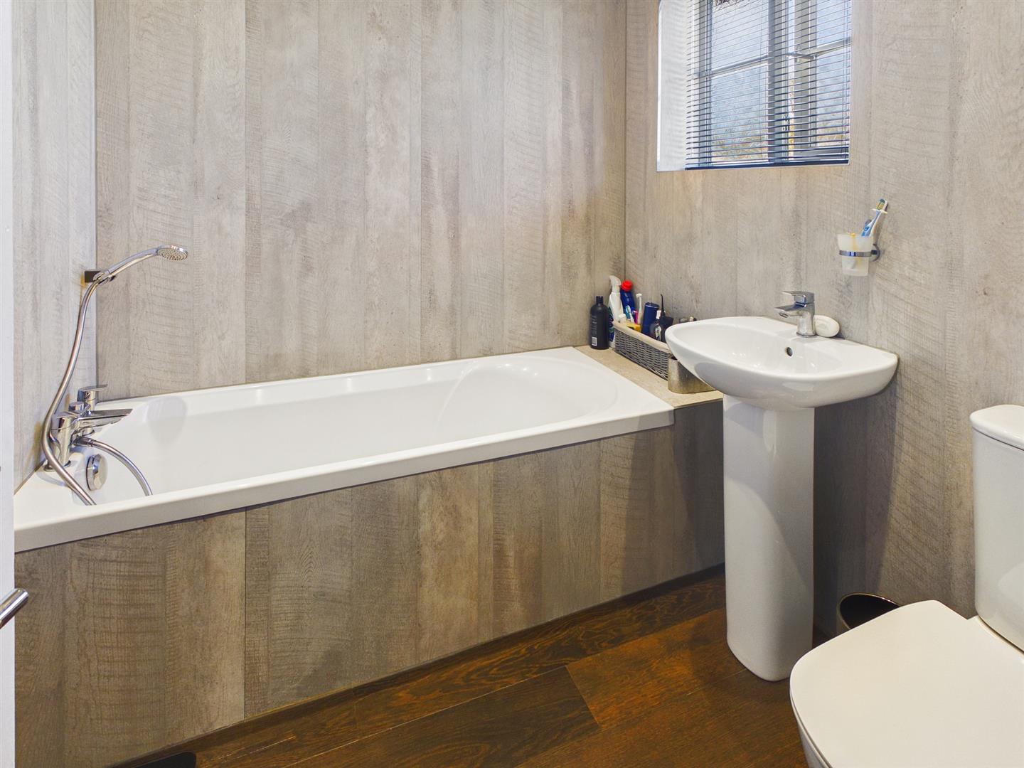 En-Suite - 1.93m x 1.91m (6'4" x 6'3") - uPVC window to rear. Panel enclosed bath with shower attachment. Wash hand basin. low level W.C. Decorative wood effect panelling to walls and flooring. Towel rail.