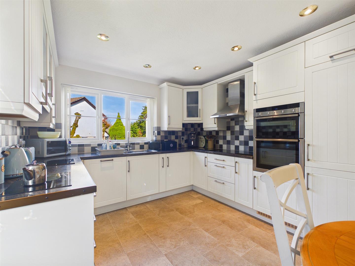 Kitchen - 4.85m x 3.23m (15'11" x 10'7") - uPVC windows to front and side. uPVC door to side. Radiator. Range of base and wall units. Worksurfaces with one and a half bowl sink unit with mixer tap. Electric hob with extractor over. Electric double oven. Integrated dishwasher and fridge/freezer. Tiled splashbacks. Internal door to garage.