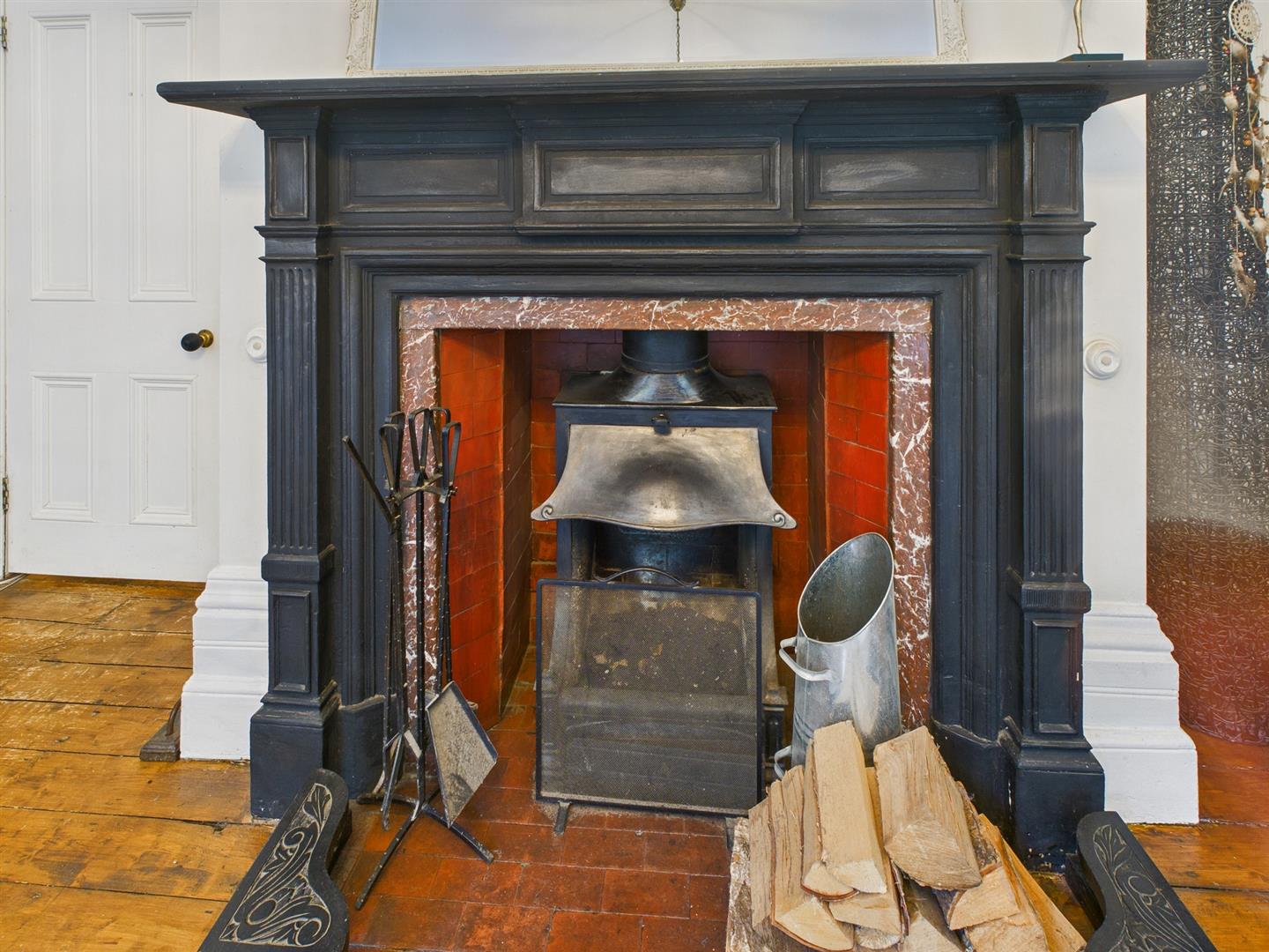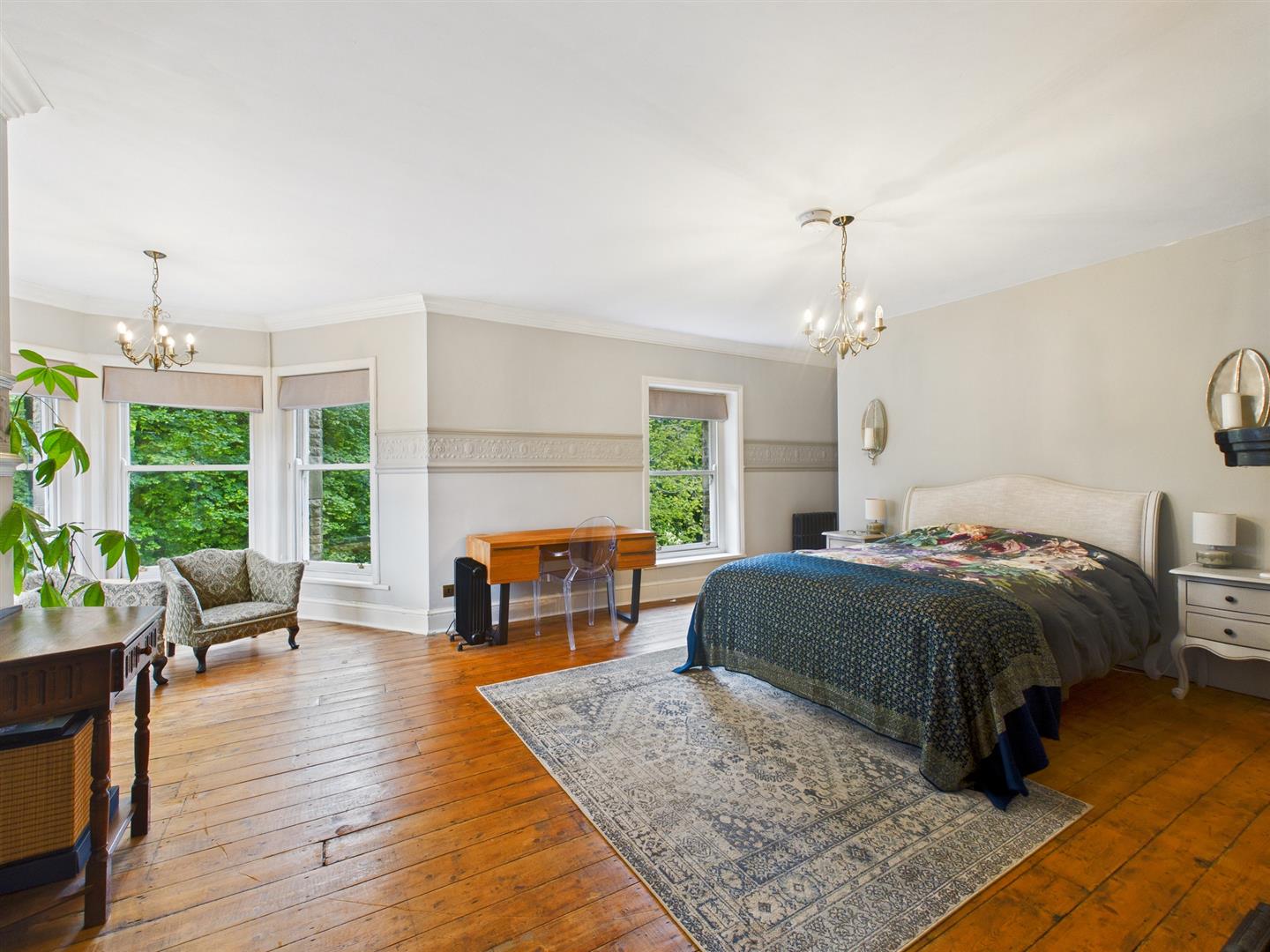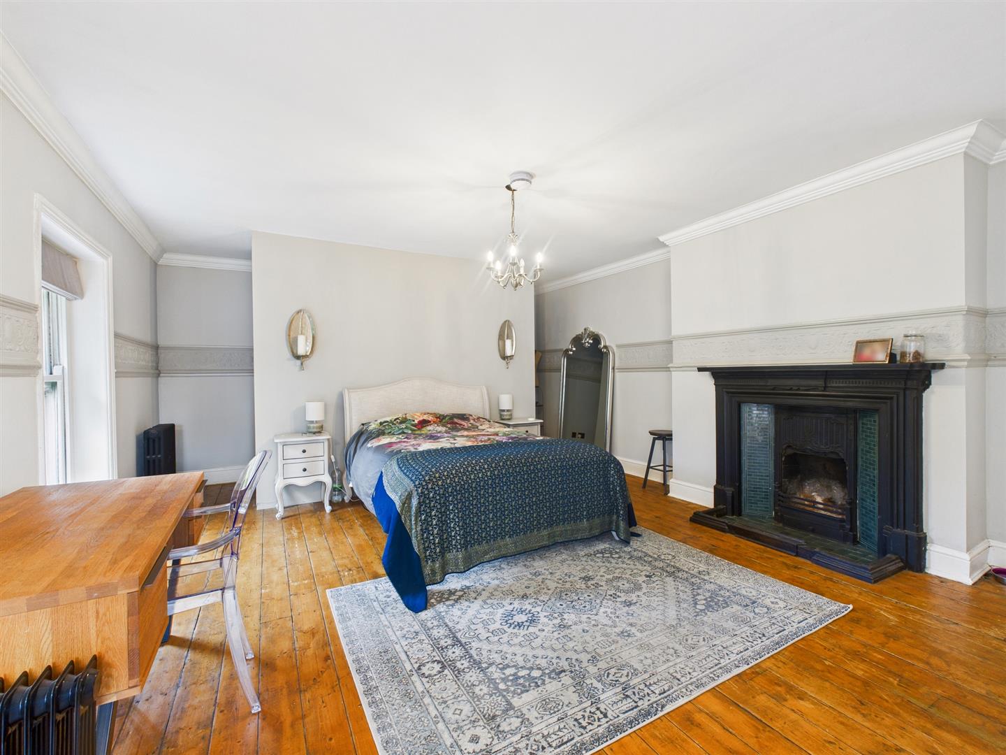 Bedroom One - 6.63m x 4.88m plus bay (21'9" x 16'0" plus bay) - With stripped wooden flooring, two Victorian-style radiators, a feature cast iron fireplace with mantlepiece over, tiled inset and hearth with open grate. Sash window to side and feature bay window/turret. Built-in hidden range of wardrobes, shelving and hanging spaces.