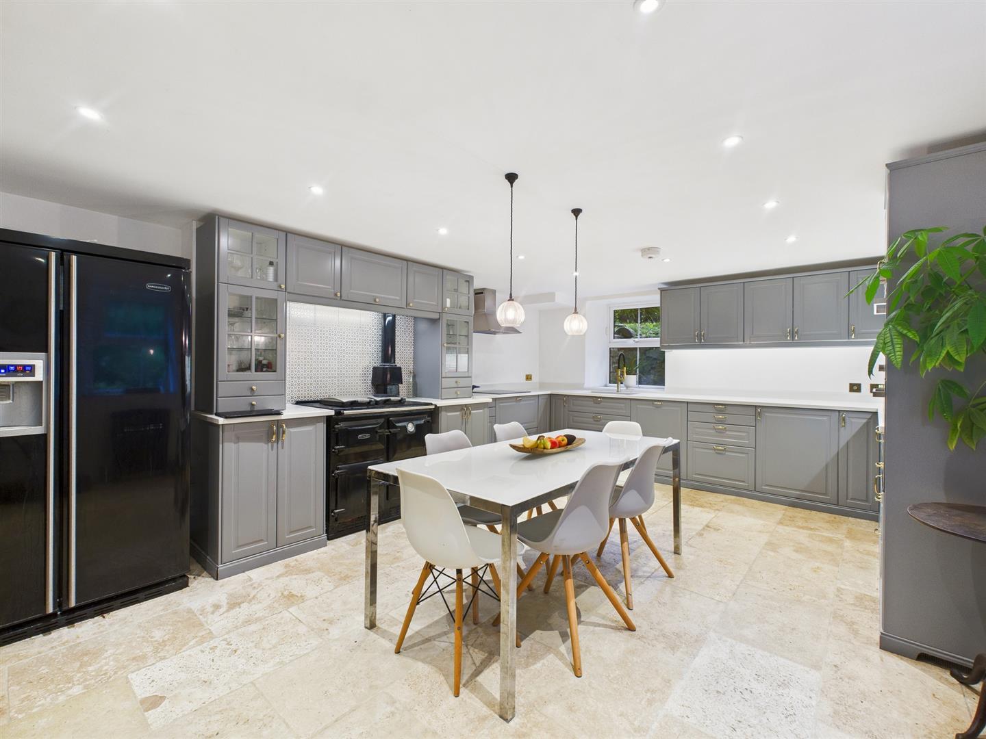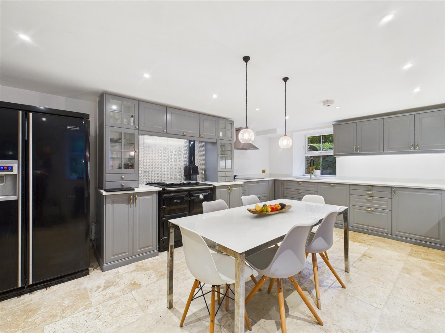 Dining/Kitchen - 6.40m x 4.34m (21'0" x 14'3") - Fitted with an high quality range of base and eye level units topped with solid quartz work surfaces, incorporating a stainless steel sink and induction hob with extractor above. Includes integrated dishwasher, fan oven and microwave, complemented by a gas-fired Rayburn and American-style fridge/freezer. Finished with a Victorian-style radiator, travertine stone tiled flooring and two uPVC double-glazed windows with door opening into the garden.