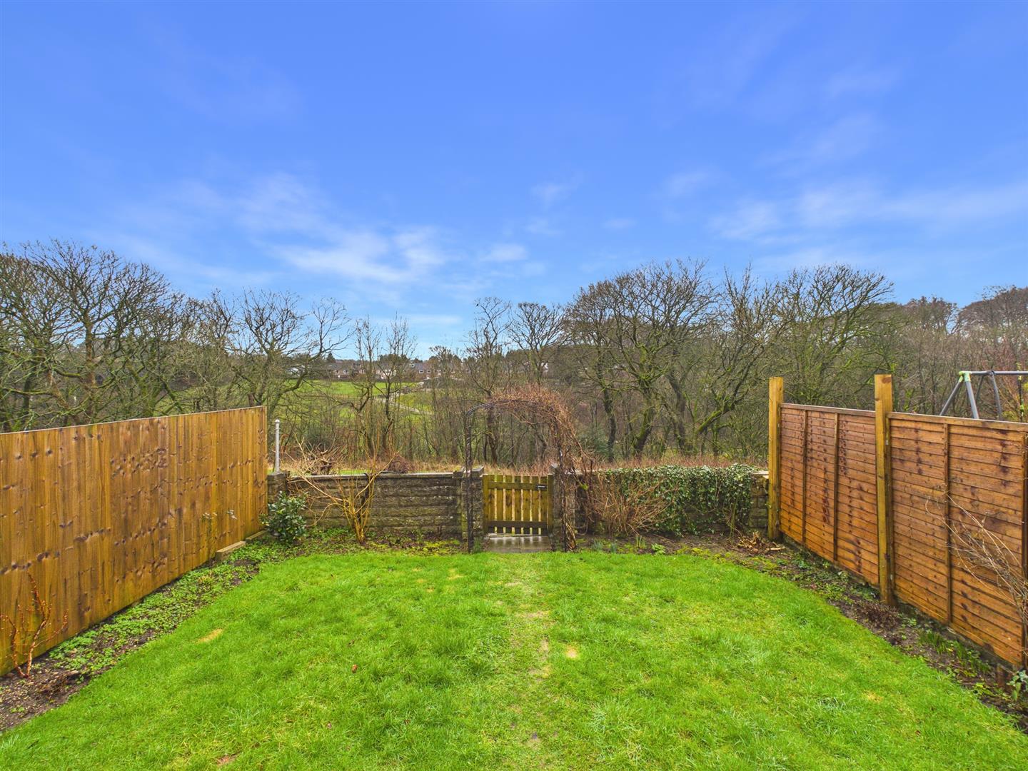 Outside - To the rear of the property there is a split level garden with patio area, shed and green house and gate providing side access. Steps lead down to a lawned area with flower beds and shrubs enclosed by panel fencing and stone wall with low level gate giving access to open green space and woodland.