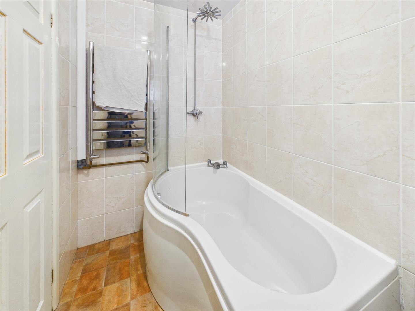 Bathroom - 2.29m x 1.42m (7'6" x 4'8") - Fitted with a good quality suite comprising of panelled bath with shower over and shower screen, low level W.C., and pedestal wash hand basin. With frosted uPVC sealed unit double glazed window to outside, stainless steel heated towel rail and fully tiled throughout.