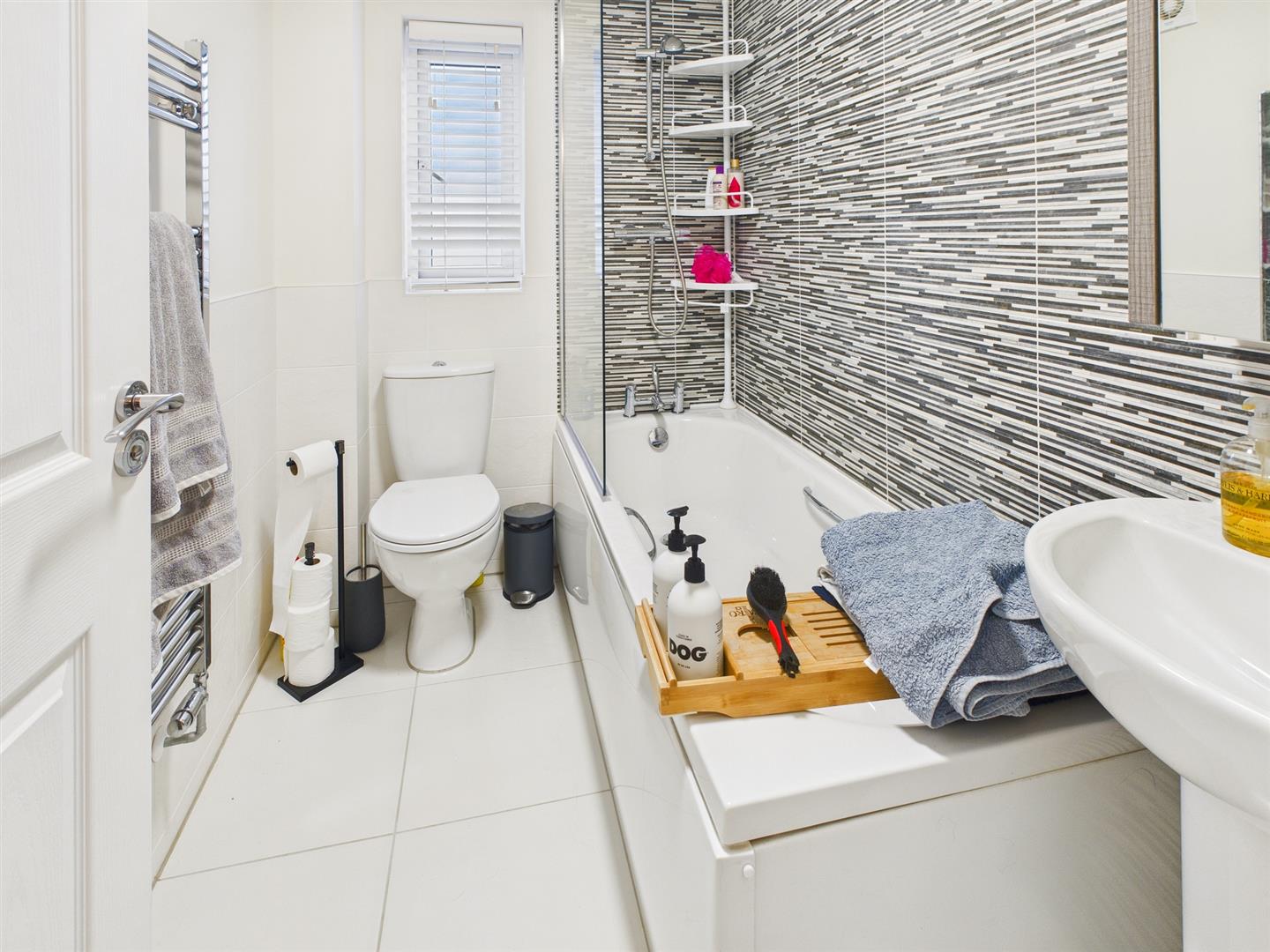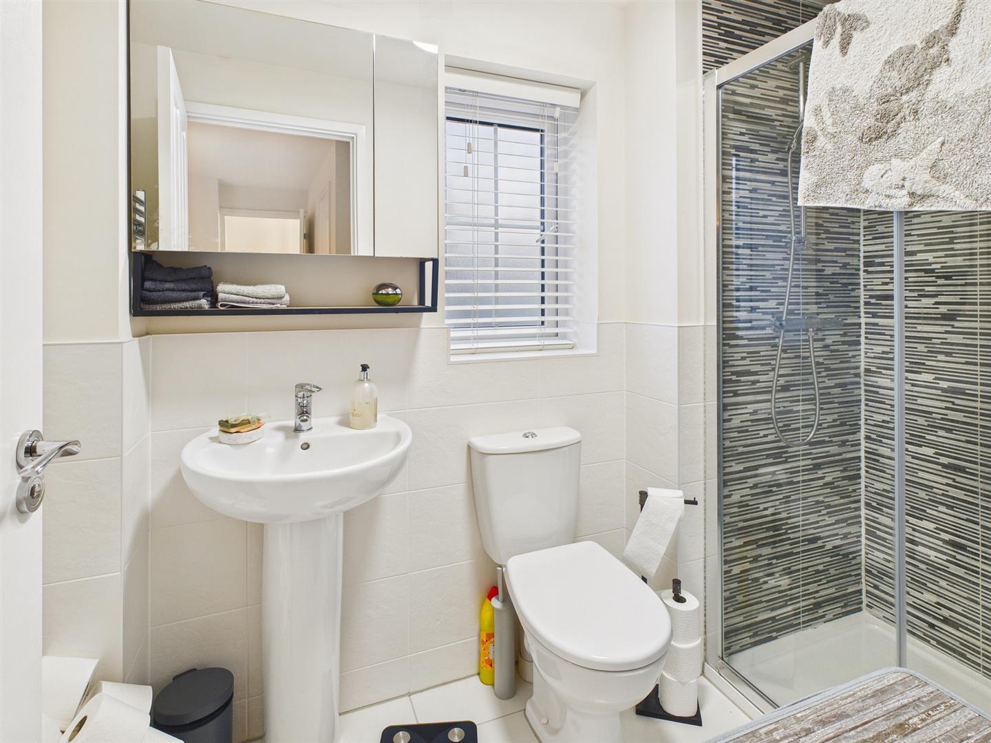 Bathroom - 2.24m x 1.55m (7'4" x 5'1") - Fitted with an excellent quality suite comprising of panelled bath with shower over and shower screen, low-level W.C. and pedestal washbasin. Tiled flooring, stainless steel heated towel rail, extractor fan, half-tiled walls and frosted uPVC sealed unit double glazed window.