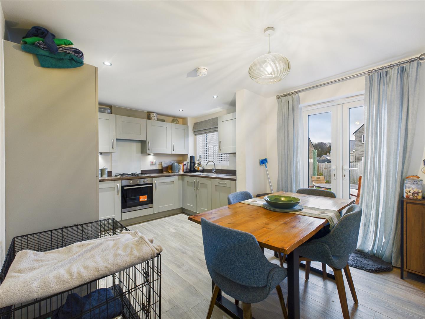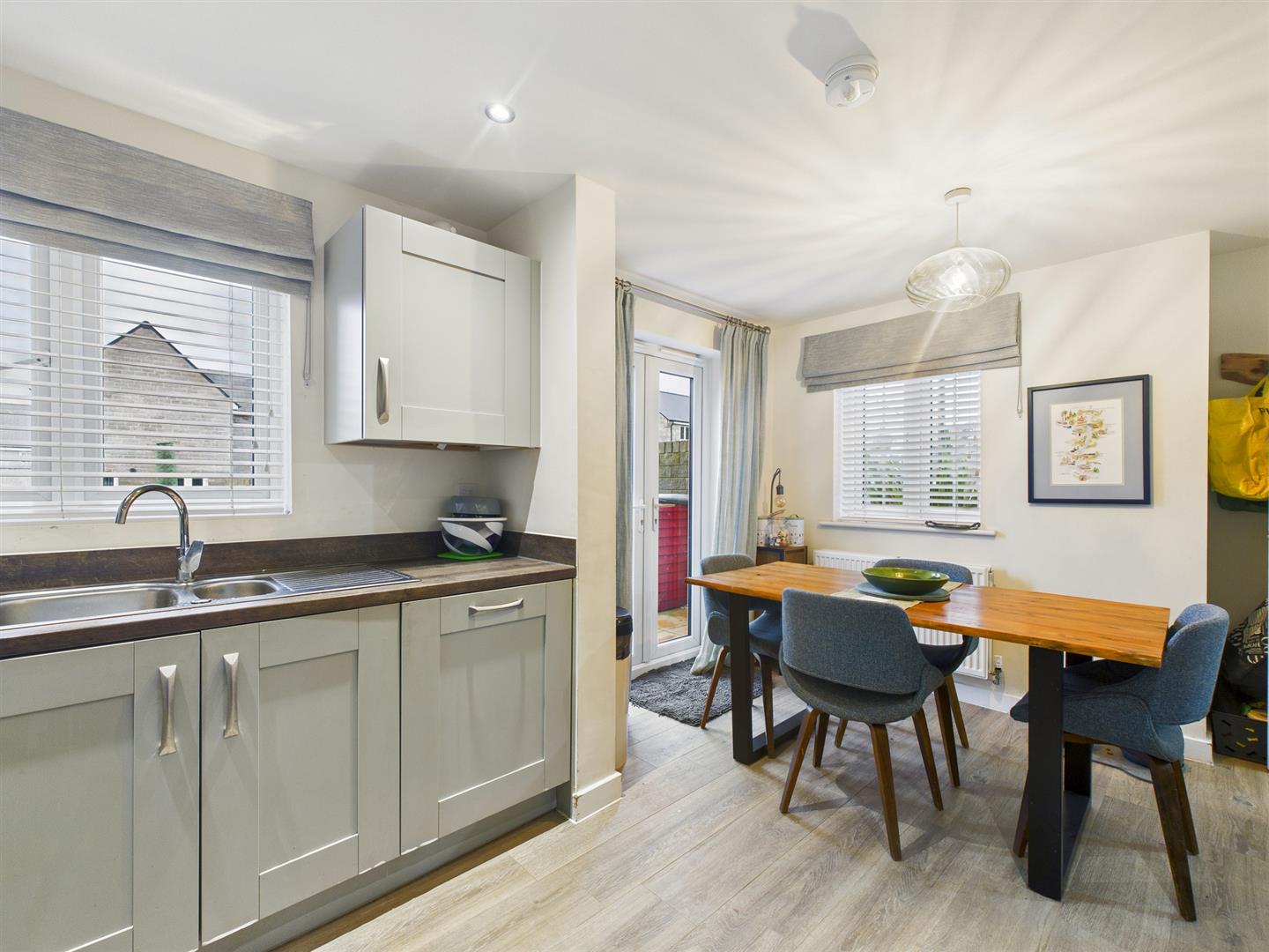 Dining/Kitchen - 4.47m x 3.15m (14'8" x 10'4") - Fitted with an excellent quality range of base and eye level units and working surfaces, incorporating a stainless steel oven with four ring gas hob and extractor over. With a one-and-a-half bowl stainless steel single drainer sink unit with splash back, integrated fridge/freezer, integrated dishwasher and integrated washing machine. With uPVC sealed unit double glazed window to front and side and uPVC sealed unit double glazed French doors leading out to the patio and garden beyond.