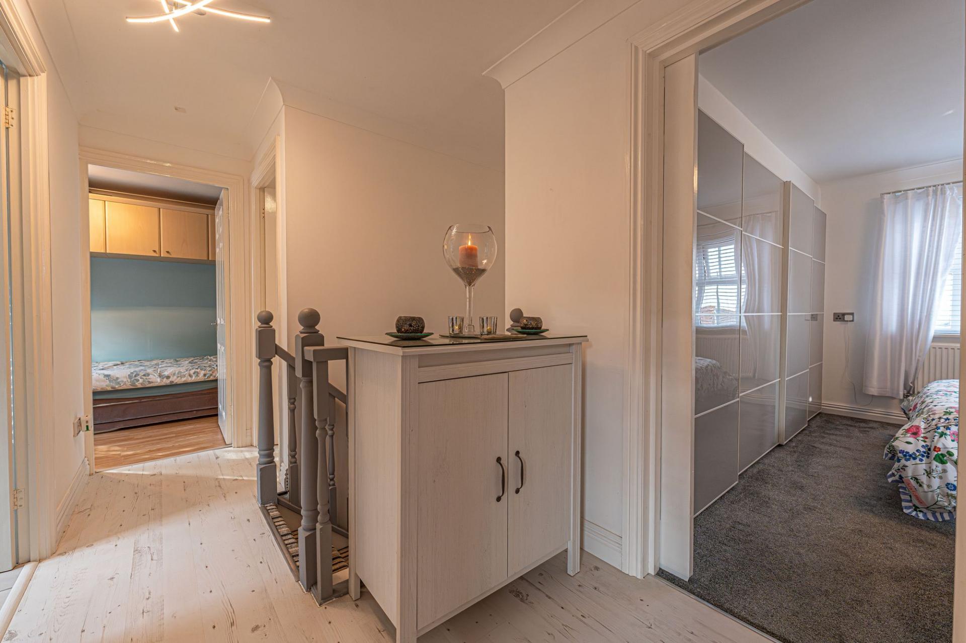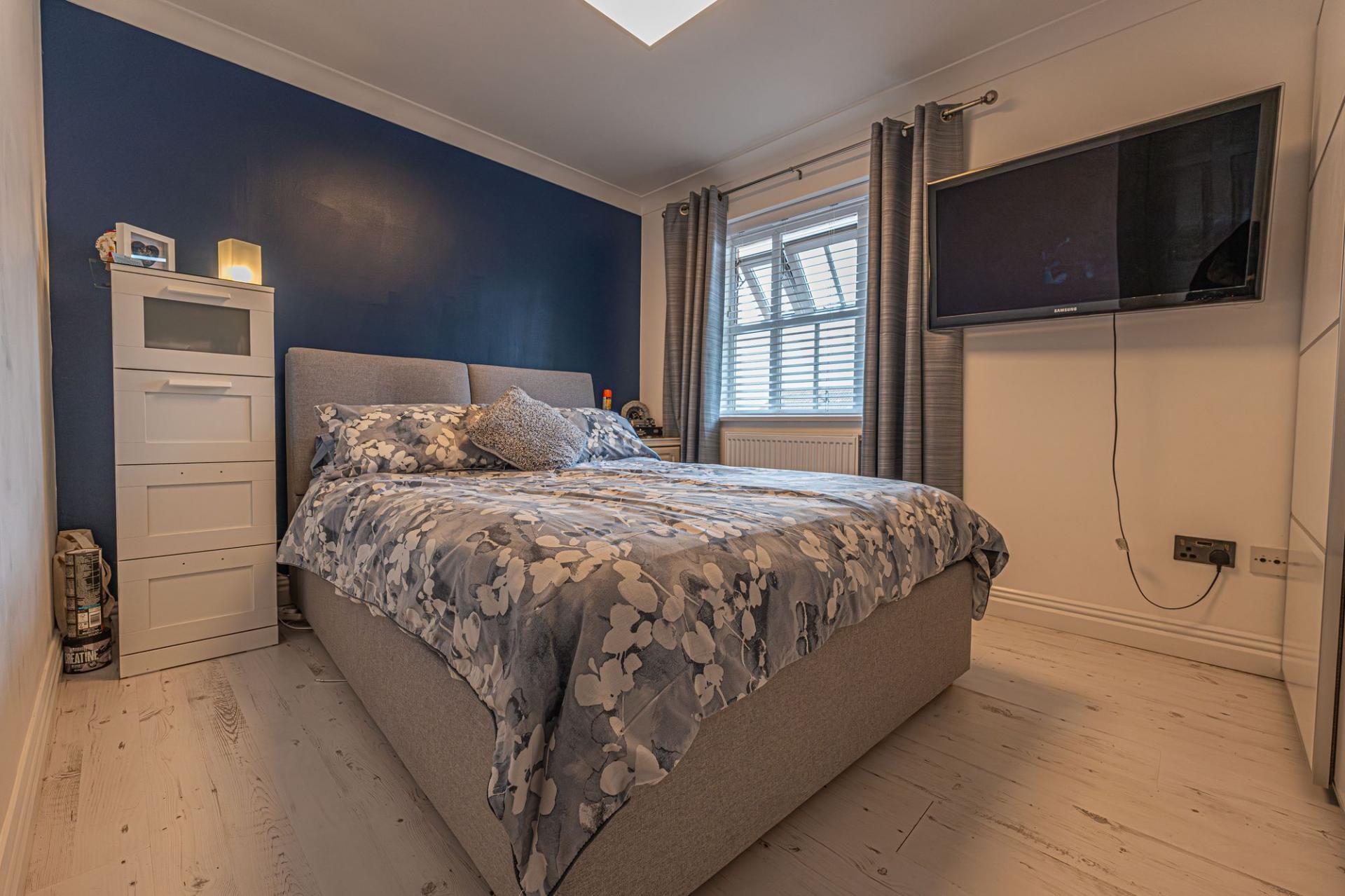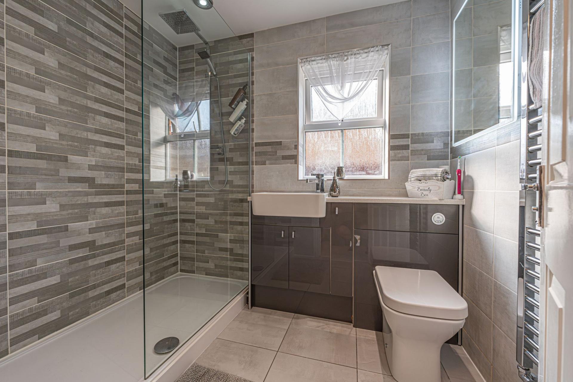 Upstairs are three generous doubles with fitted wardrobes, a versatile single, and a sleek family bathroom. The main bedroom enjoys its own en-suite shower room.