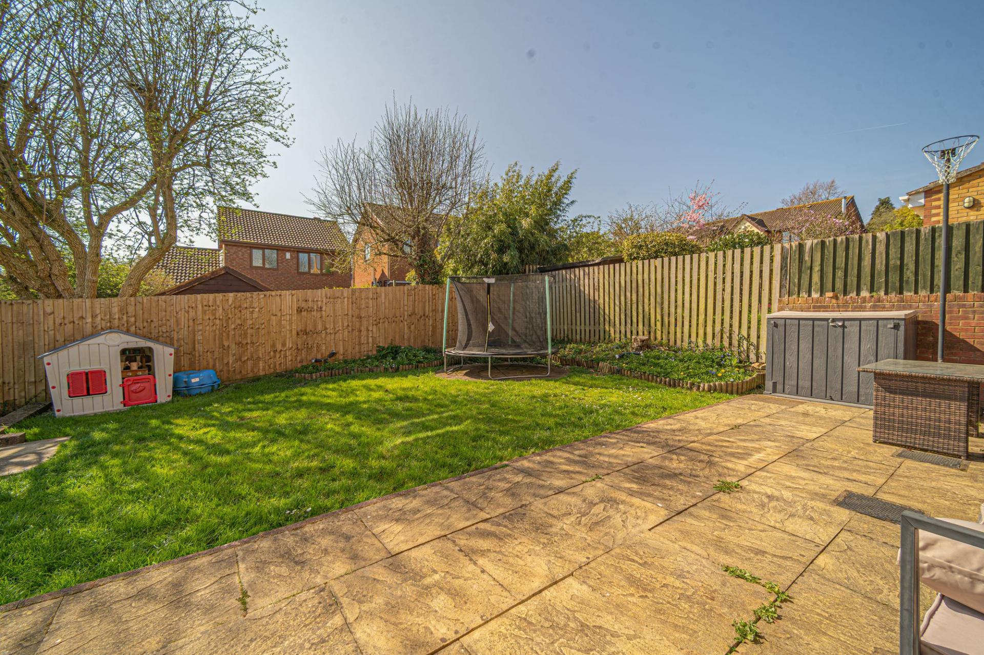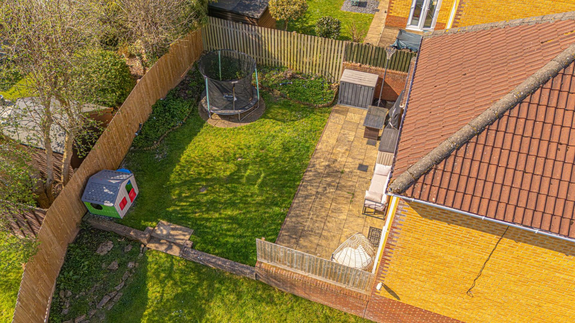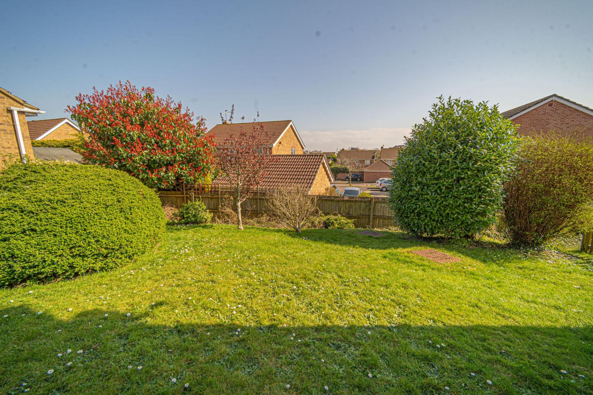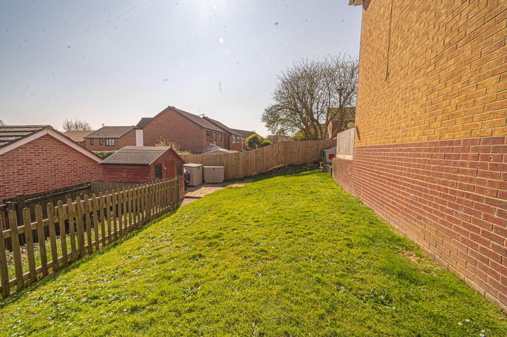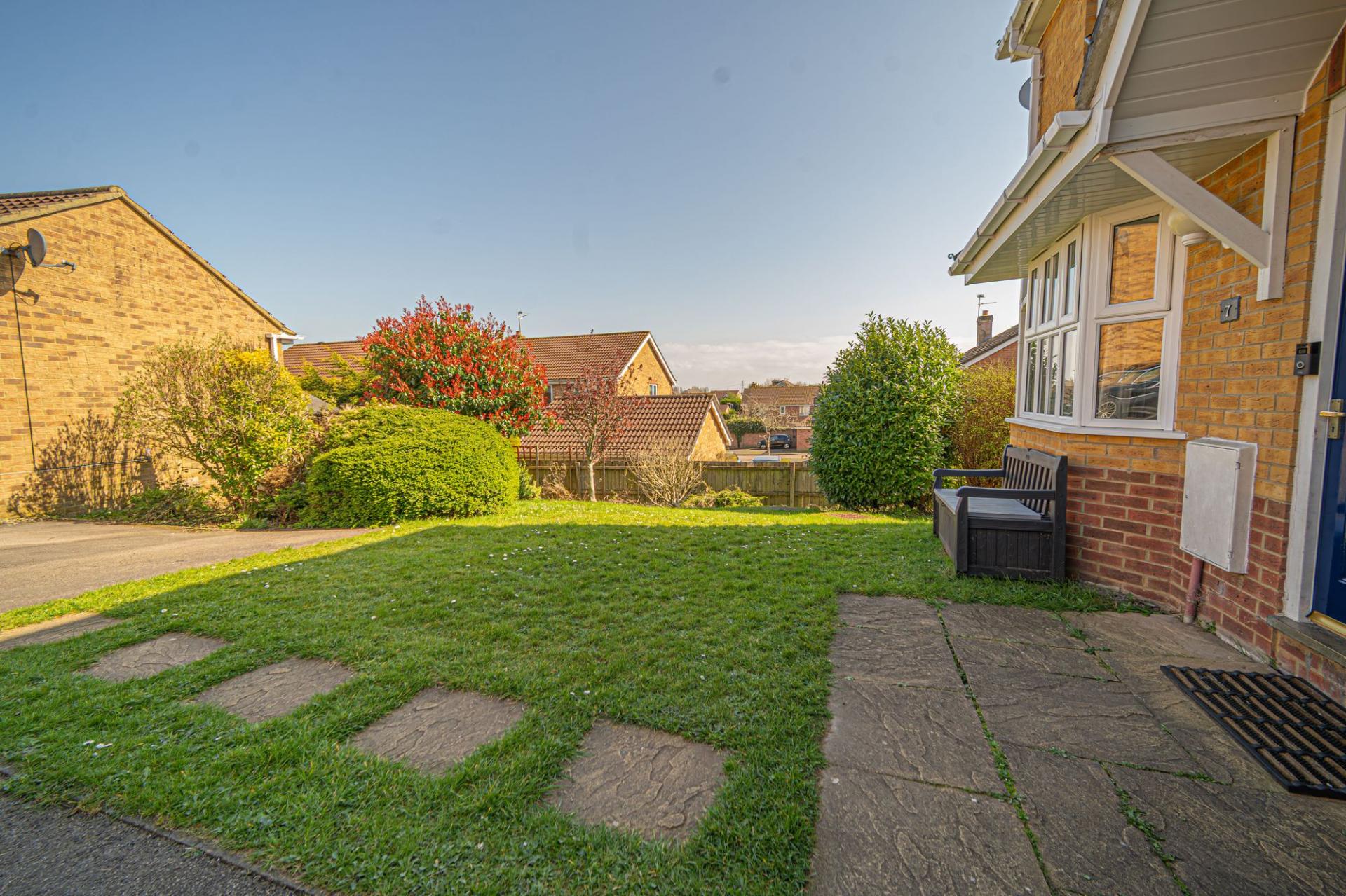 Stepping outside we arrive at the magnificent garden, which has a generous corner plot that is the true highlight of this property. To the rear of the house there is a large patio space with a grass lawn beyond, which wraps around the house and expands to offer an abundance of outdoor space, perfect for entertaining a large host of guests, as well as being ideally suited for children and pets. The colossal size of the garden also allows residents to maximise on sunlight coverage throughout the day. This extravagant lawn space continues towards the front of the house, where we can find a beautiful array of flowers and shrubs to welcome us on approach to the property, giving residents the chance to experience an impressive outdoor paradise right on their doorstep. Off-road parking is also readily available, with space for at least 3 cars to be conveniently parked in front of the property.