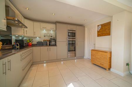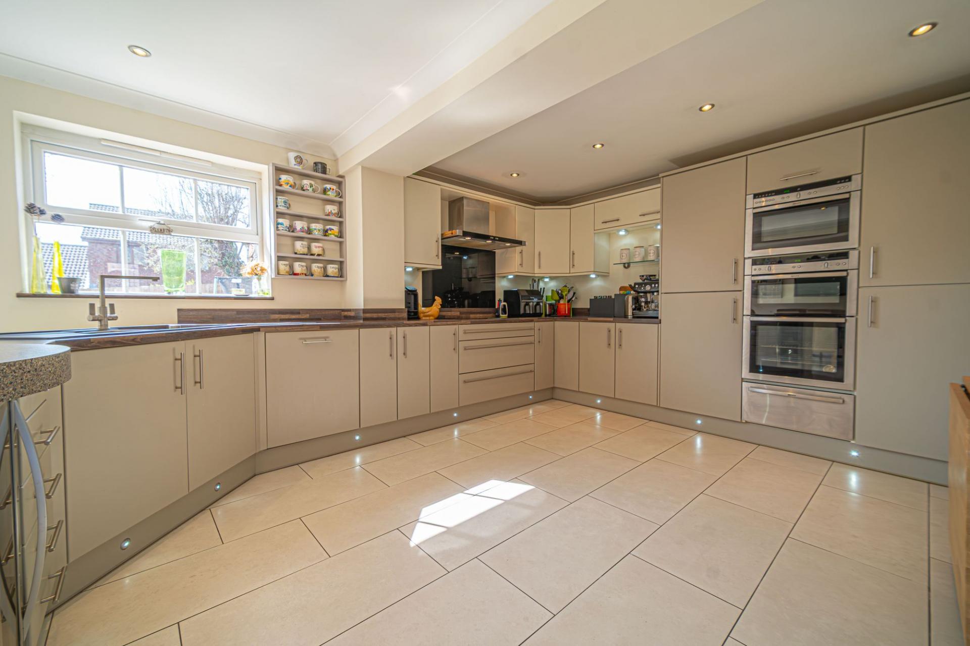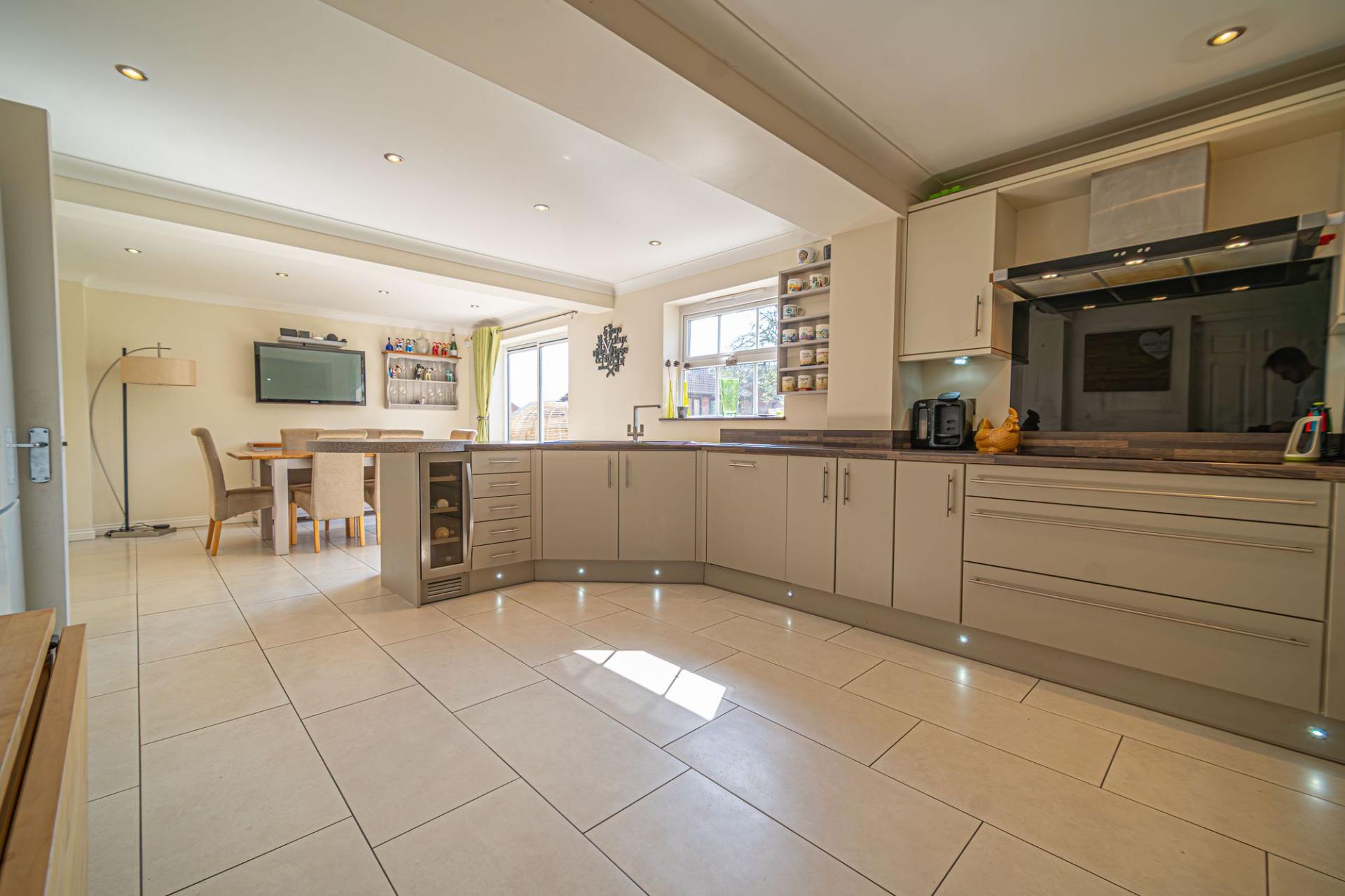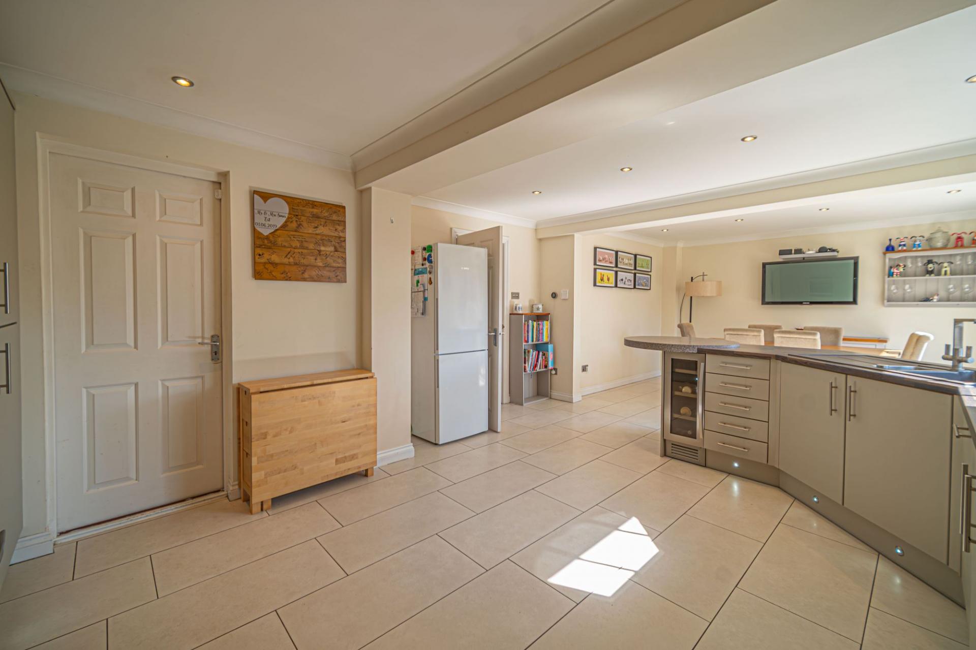 We enter this incredible family home to the front, where we can find the hallway with a guest W.C and a fitted under stairs cupboard, before being welcomed into the spacious living room, which features a charming fireplace at the centre, as well as plenty of light from the front facing bay windows. At the rear of the house we have the marvellous kitchen, which benefits from a large open plan design, with plenty of space for a dining area, as well as a breakfast bar fitted into the worktop. This gorgeous space is also flooded by natural light through multiple windows including sliding doors that open to the garden, providing a bright and airy atmosphere that is perfect for cooking and enjoying meals with friends and family. The kitchen offers an incredible amount of fitted storage found alongside a wealth of integrated appliances, with a doorway that provides interior access to the garage, which can be used as sheltered parking or a plentiful storage space.
