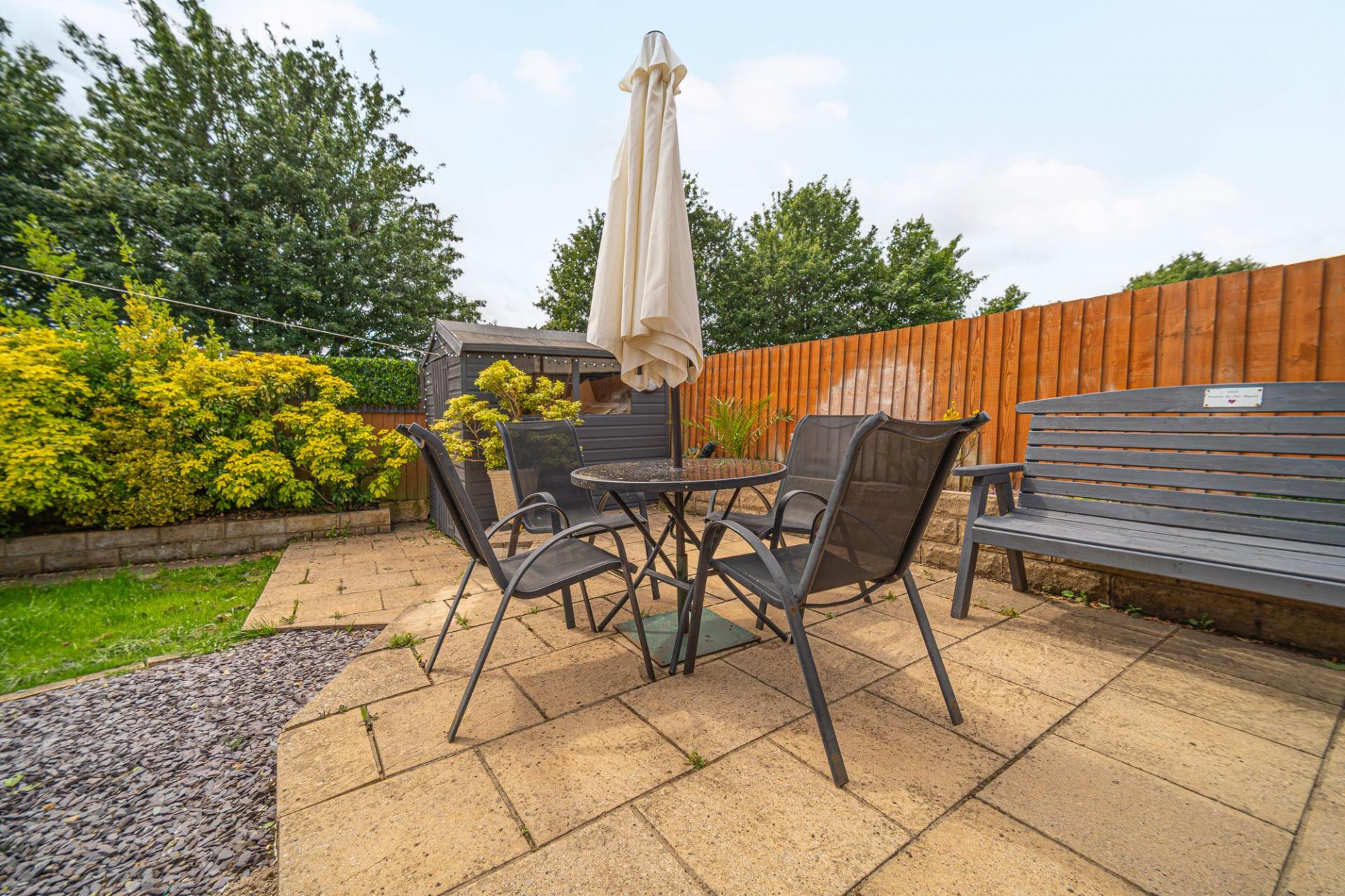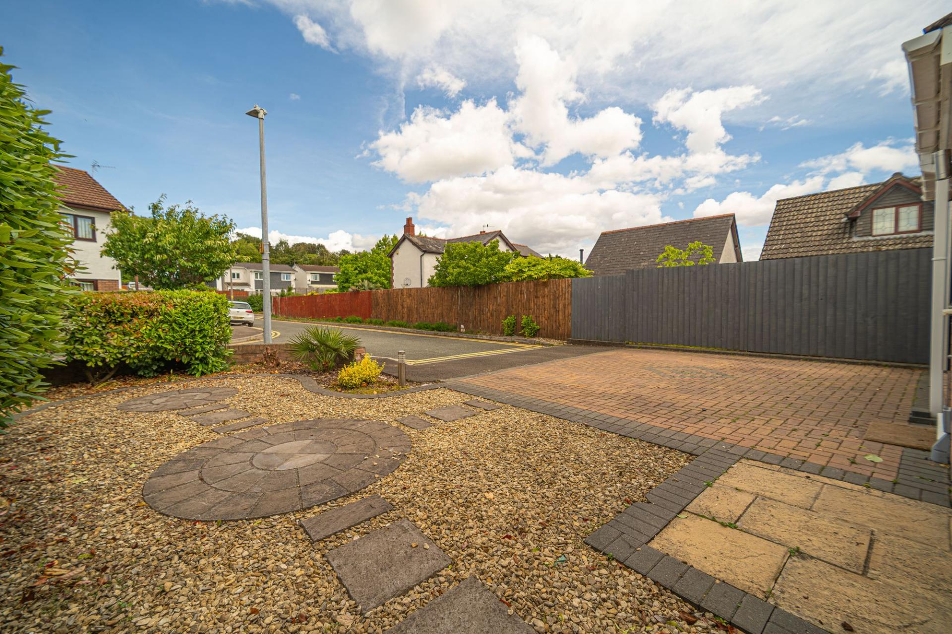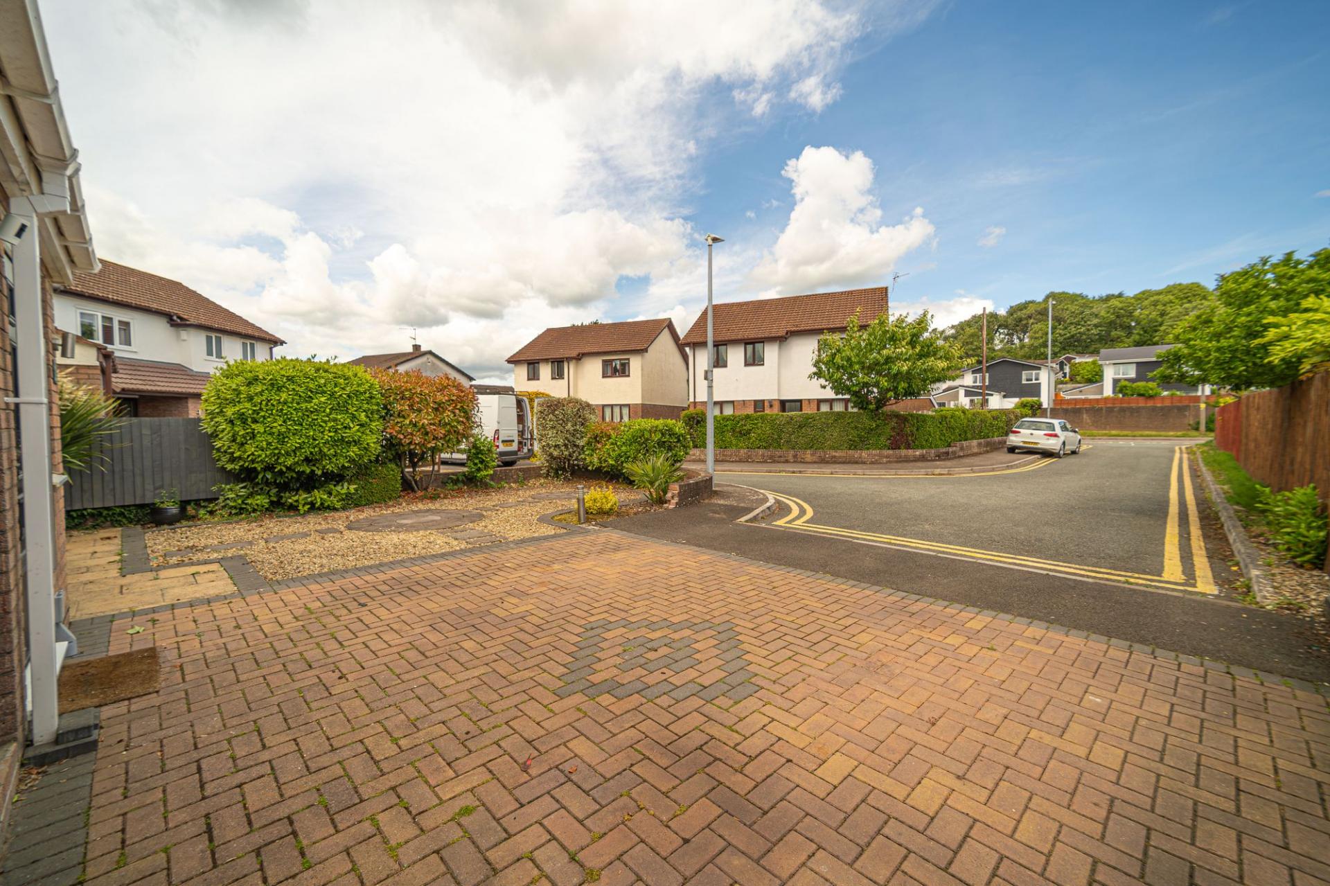 At the front of the house we can find another patio space sitting overlooking the peaceful cul-de-sac, positioned across from the double driveway, which provides convenient parking for the property.