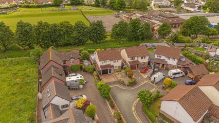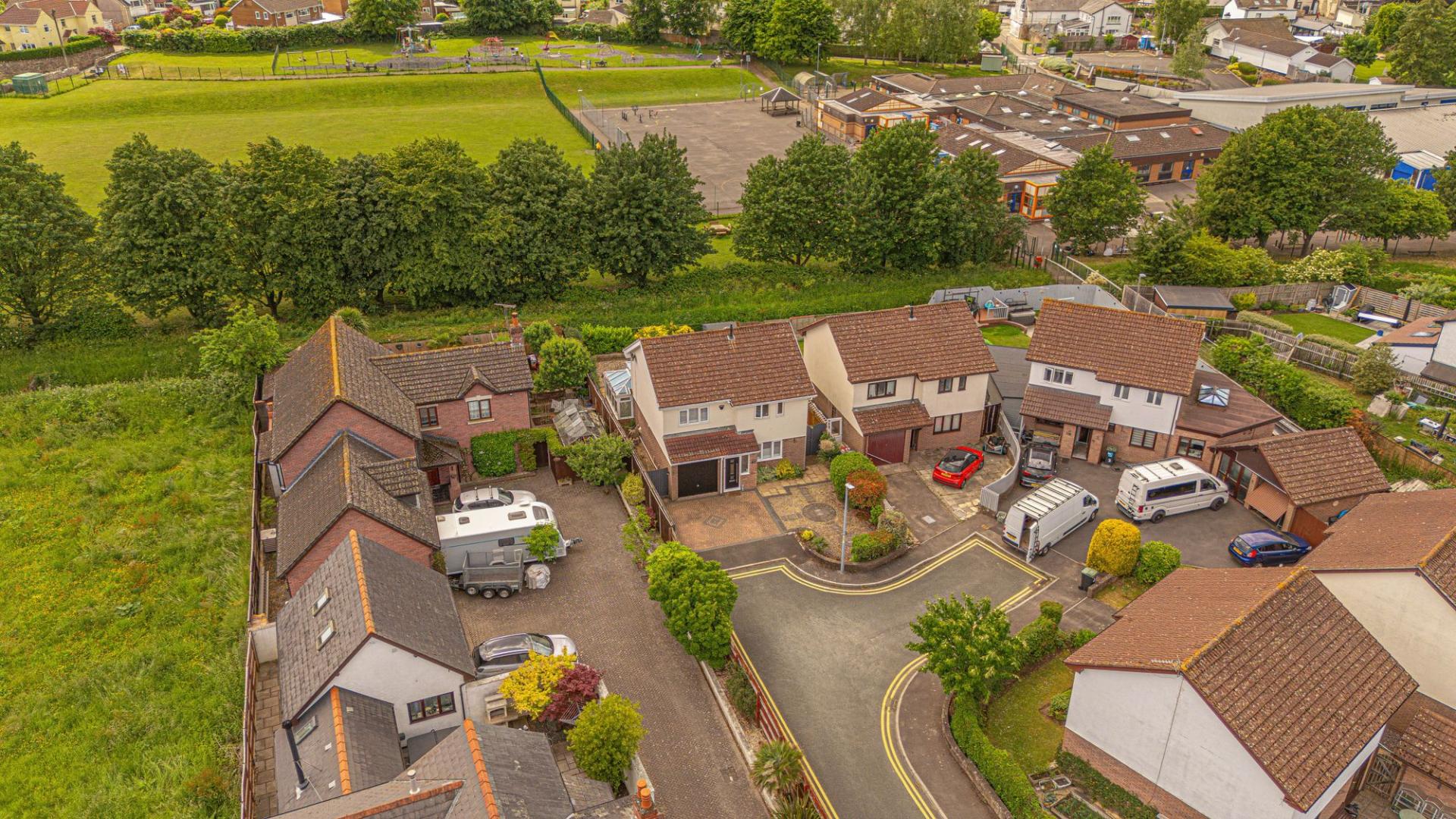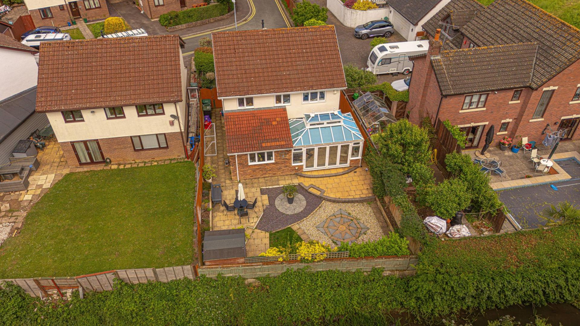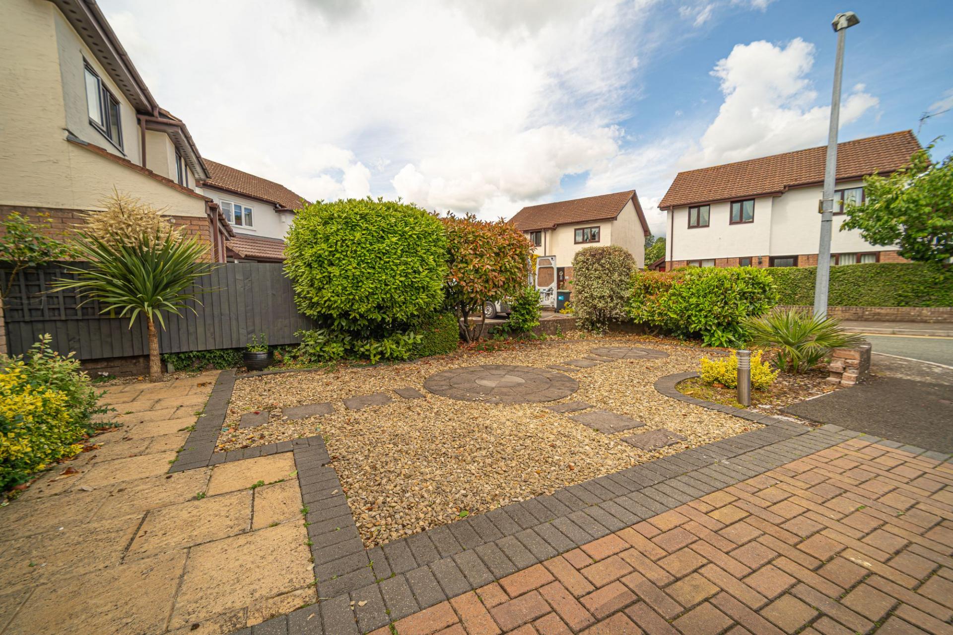 At the front of the house we can find another patio space sitting overlooking the peaceful cul-de-sac, positioned across from the double driveway, which provides convenient parking for the property.