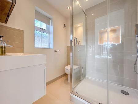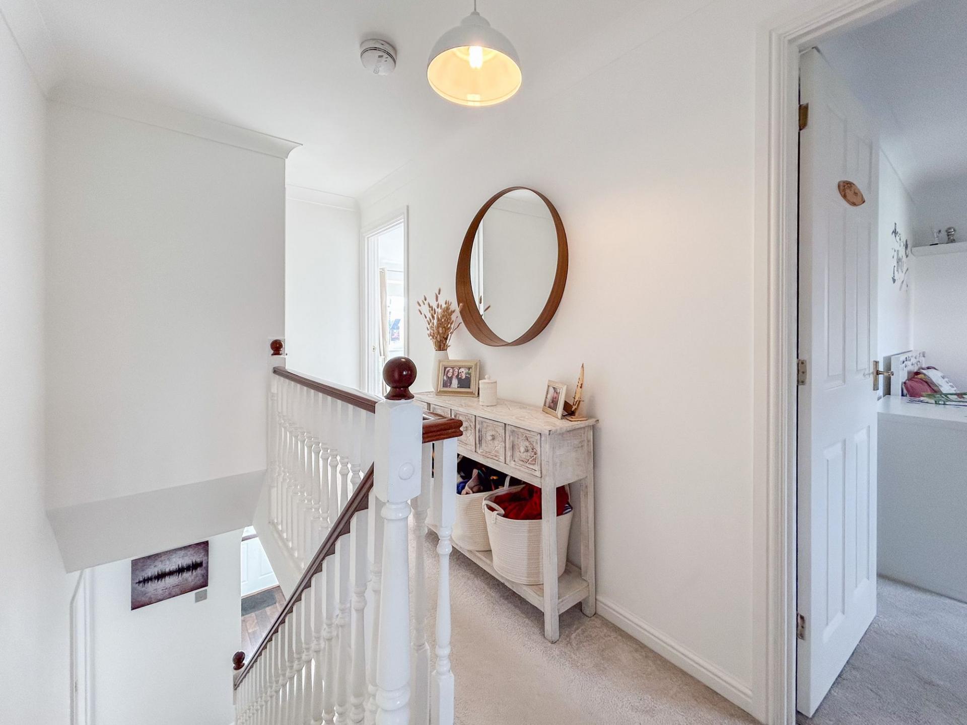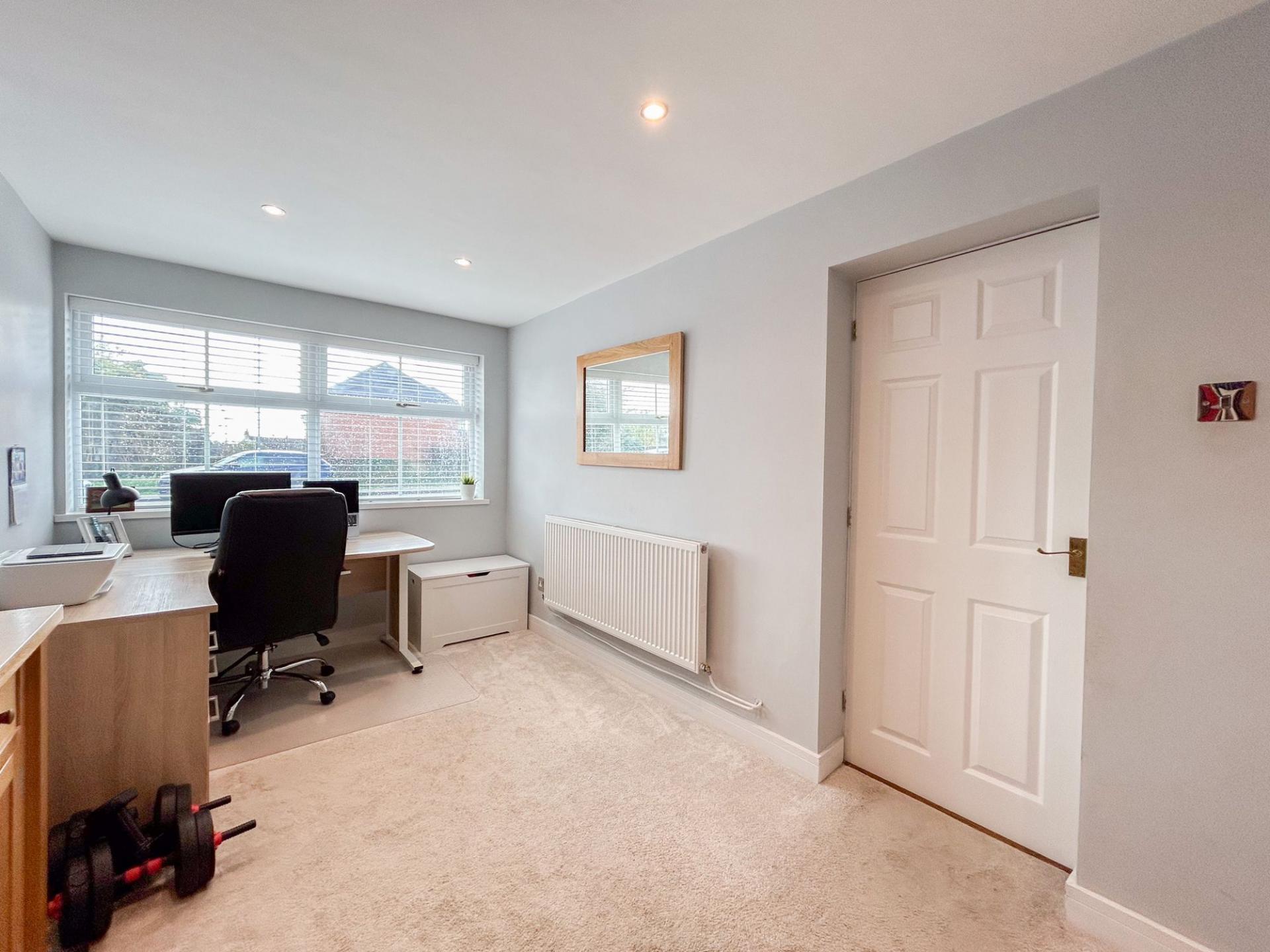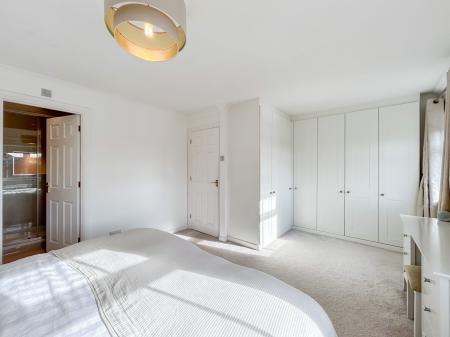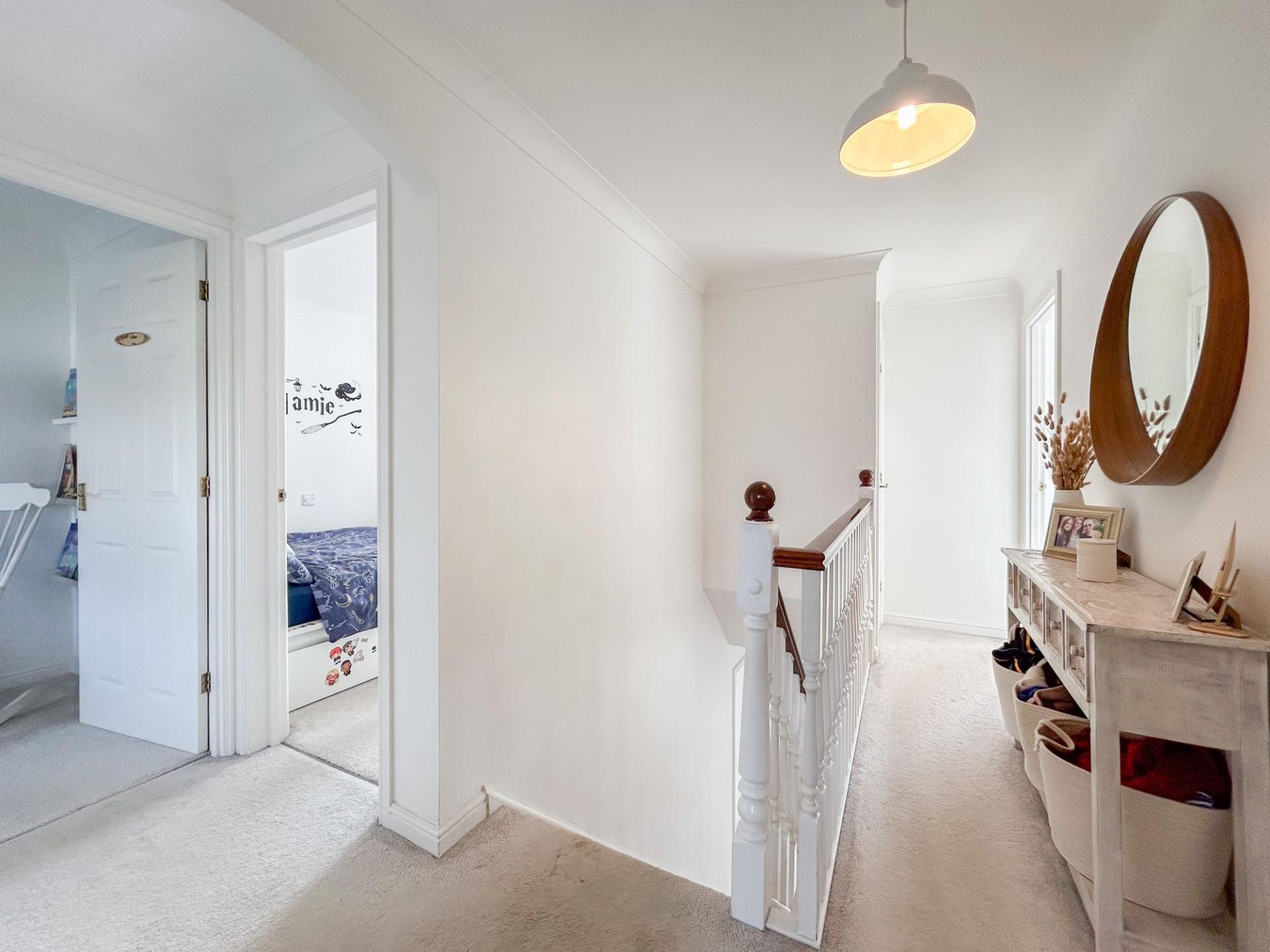 Upstairs, the landing leads to four double bedrooms. The principal bedroom enjoys abundant natural light from two windows and extensive fitted wardrobes. Both the principal and second bedrooms feature modern en-suite shower rooms, with a family bathroom accessible from the landing.