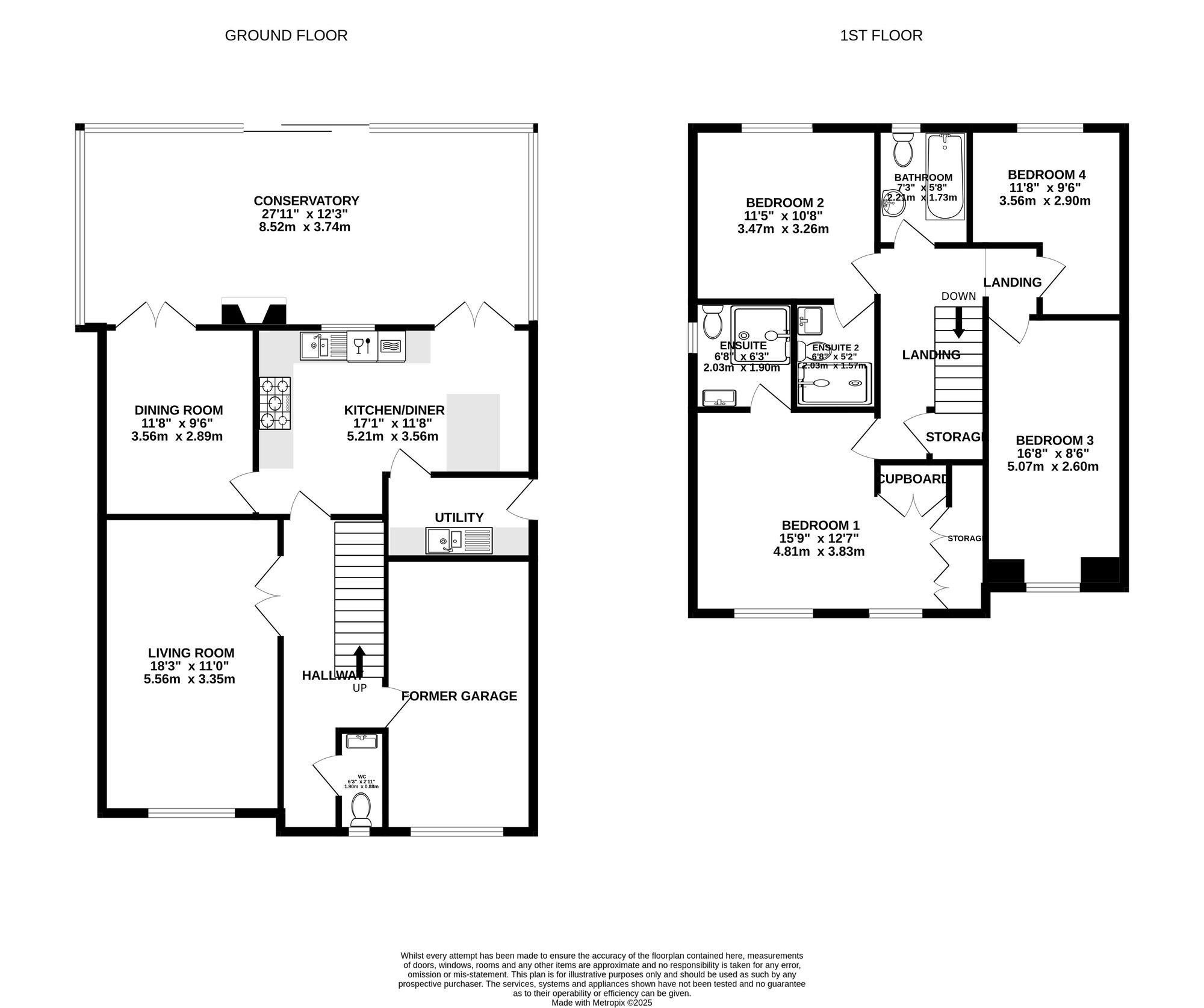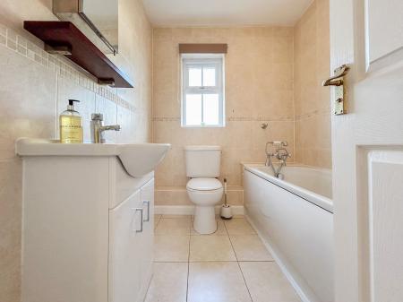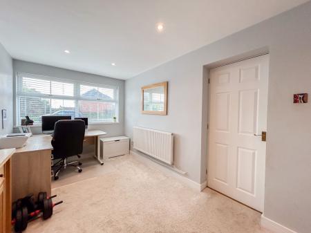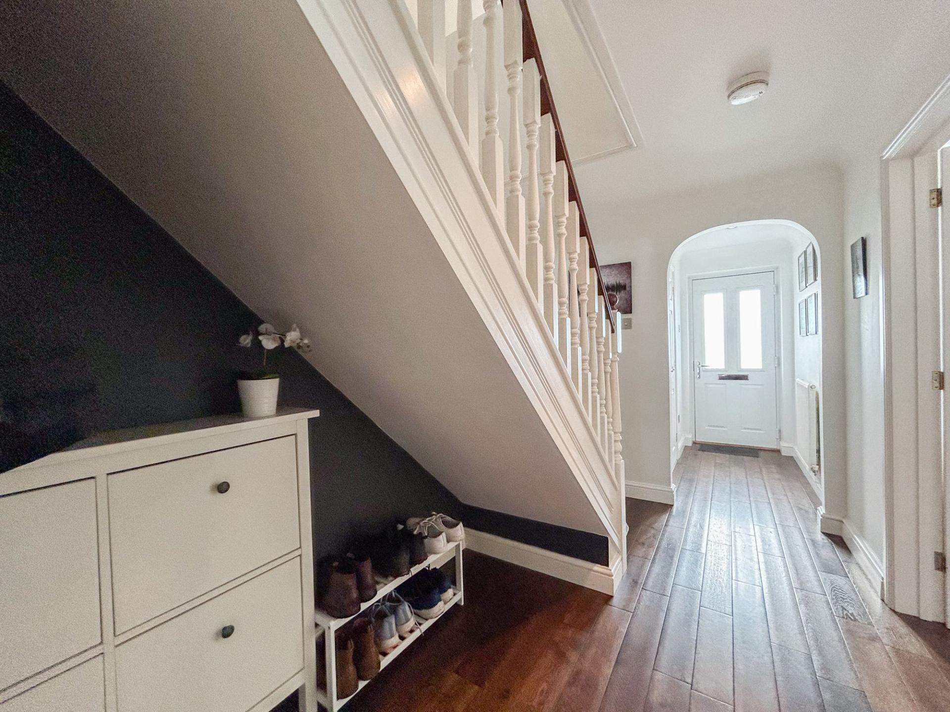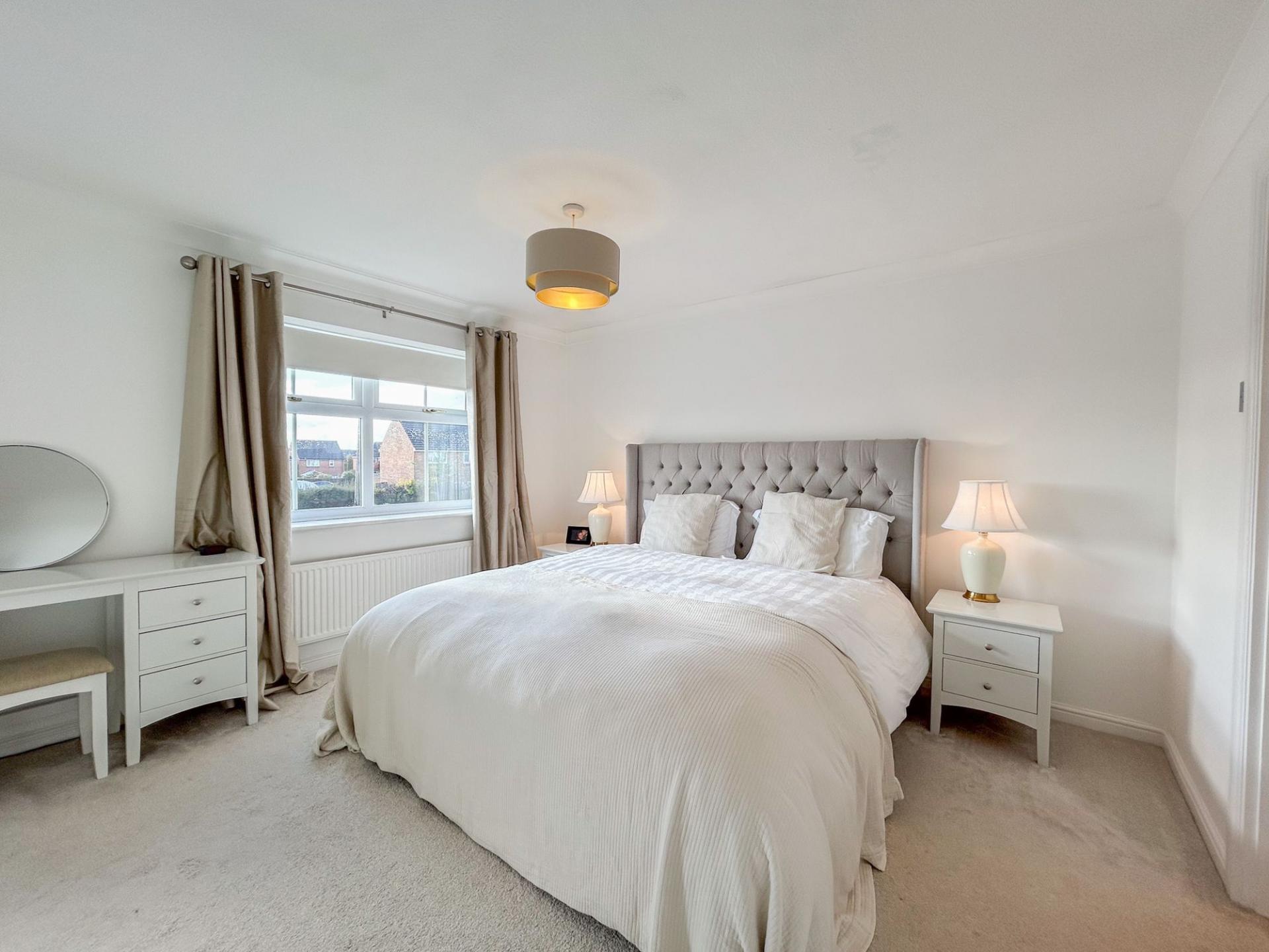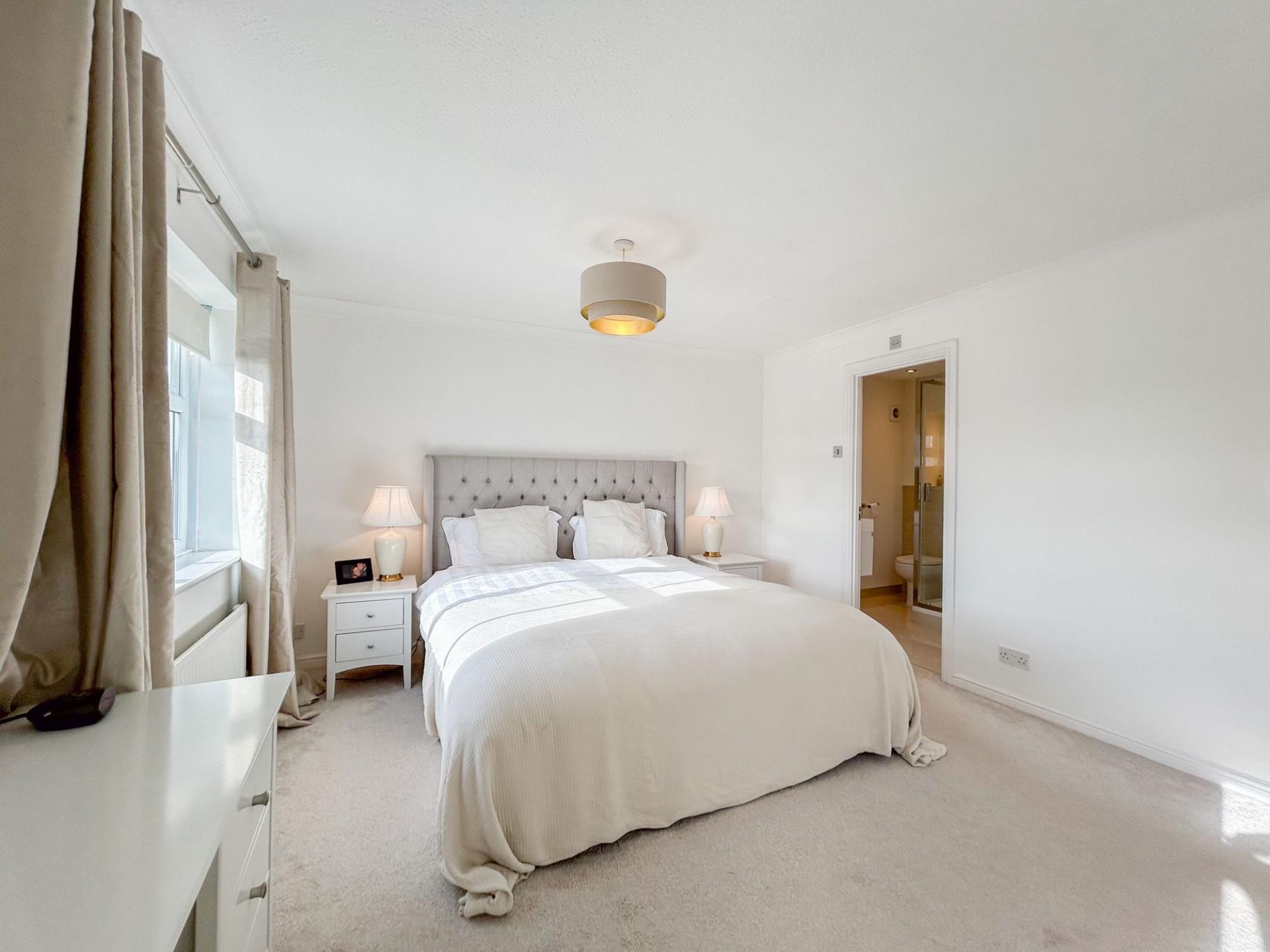 Upstairs, the landing leads to four double bedrooms. The principal bedroom enjoys abundant natural light from two windows and extensive fitted wardrobes. Both the principal and second bedrooms feature modern en-suite shower rooms, with a family bathroom accessible from the landing.