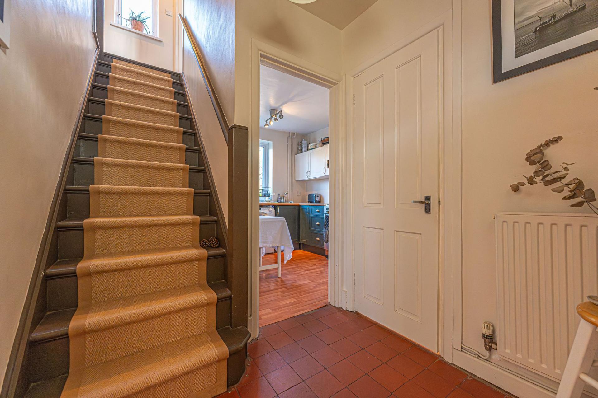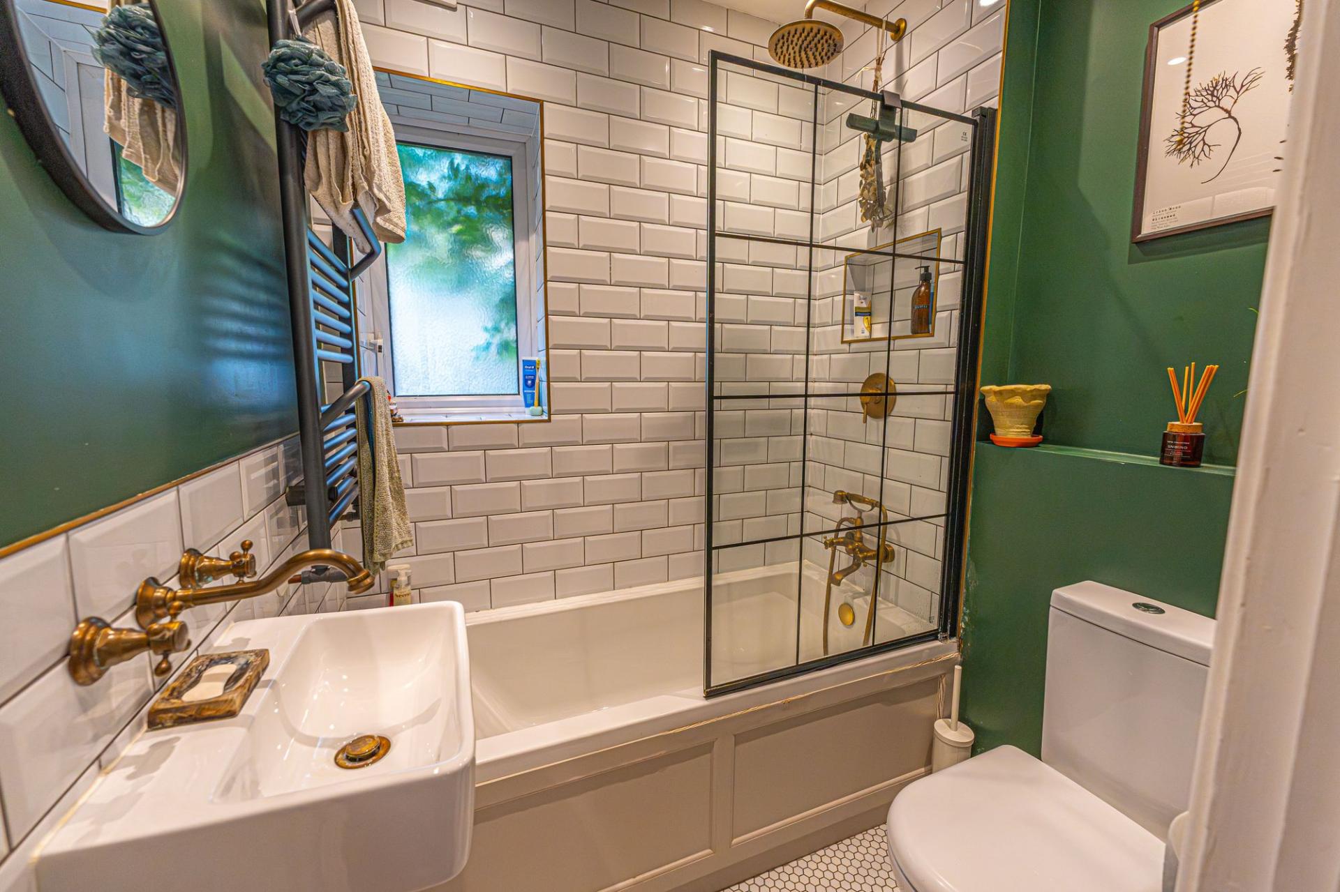 The kitchen is cosy and practical ,with storage options and plenty of room for appliances to join the existing range cooker, while also being able to double up as a dining area or breakfast nook. The kitchen also connects to a helpful understairs cupboard, ideal for storage or utilities, as well as a doorway to the garden. The stylish bathroom is also located on the ground floor, having been recently renovated to offer a sleek modern design, with a bath suite, rainfall shower, and vintage brass fittings to compliment the properties rustic tones.