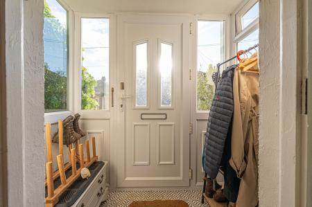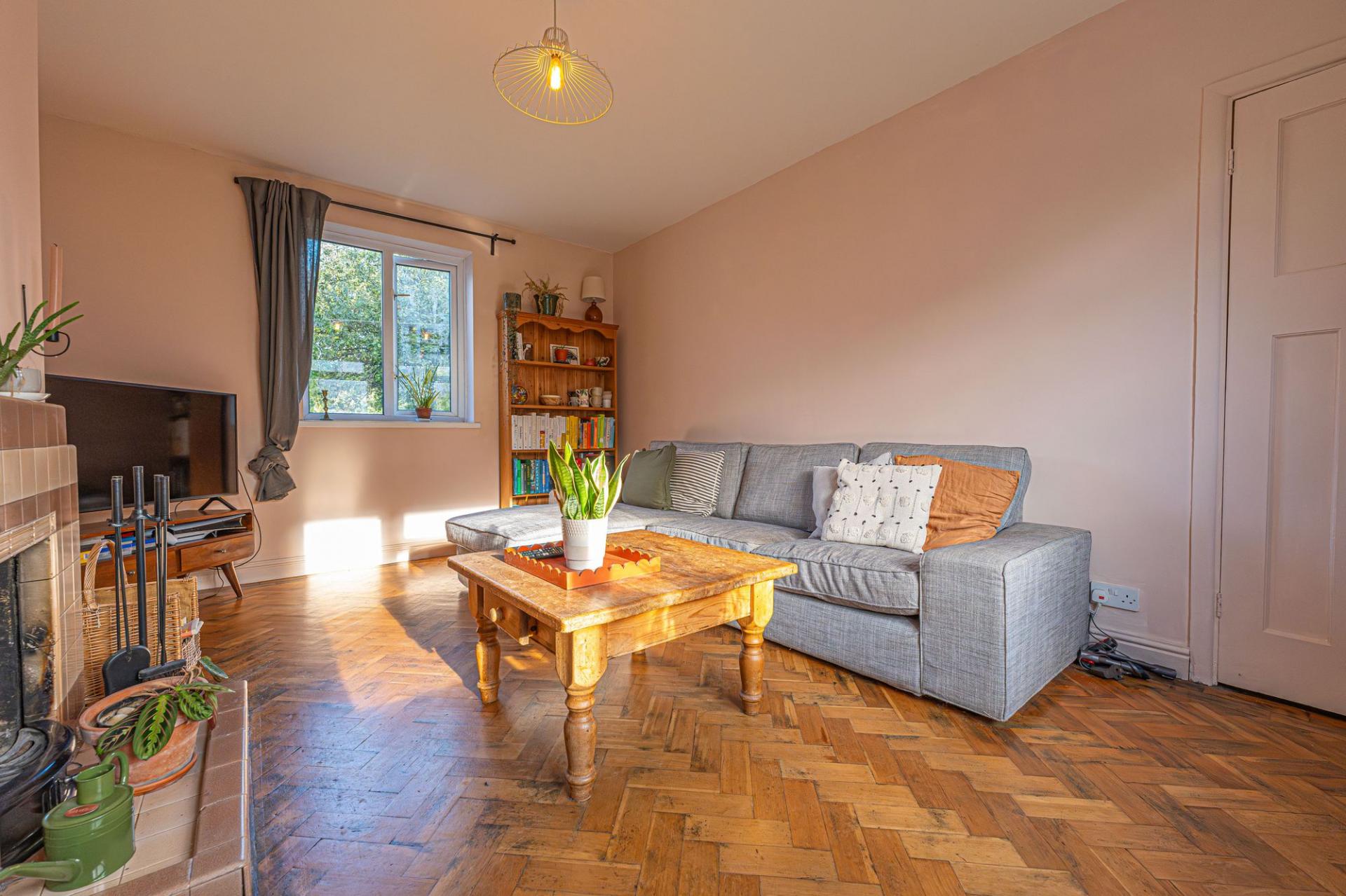 The bright and welcoming entryway introduces the home though the front porch, and into the hallway with stylish decorative tile flooring, both offering practical storage for coats and shoes. The spacious reception room showcases elegant hardwood parquet flooring, a cosy fireplace in full working order, and ample natural light from large windows, creating a warm and inviting atmosphere for relaxation or entertaining guests.