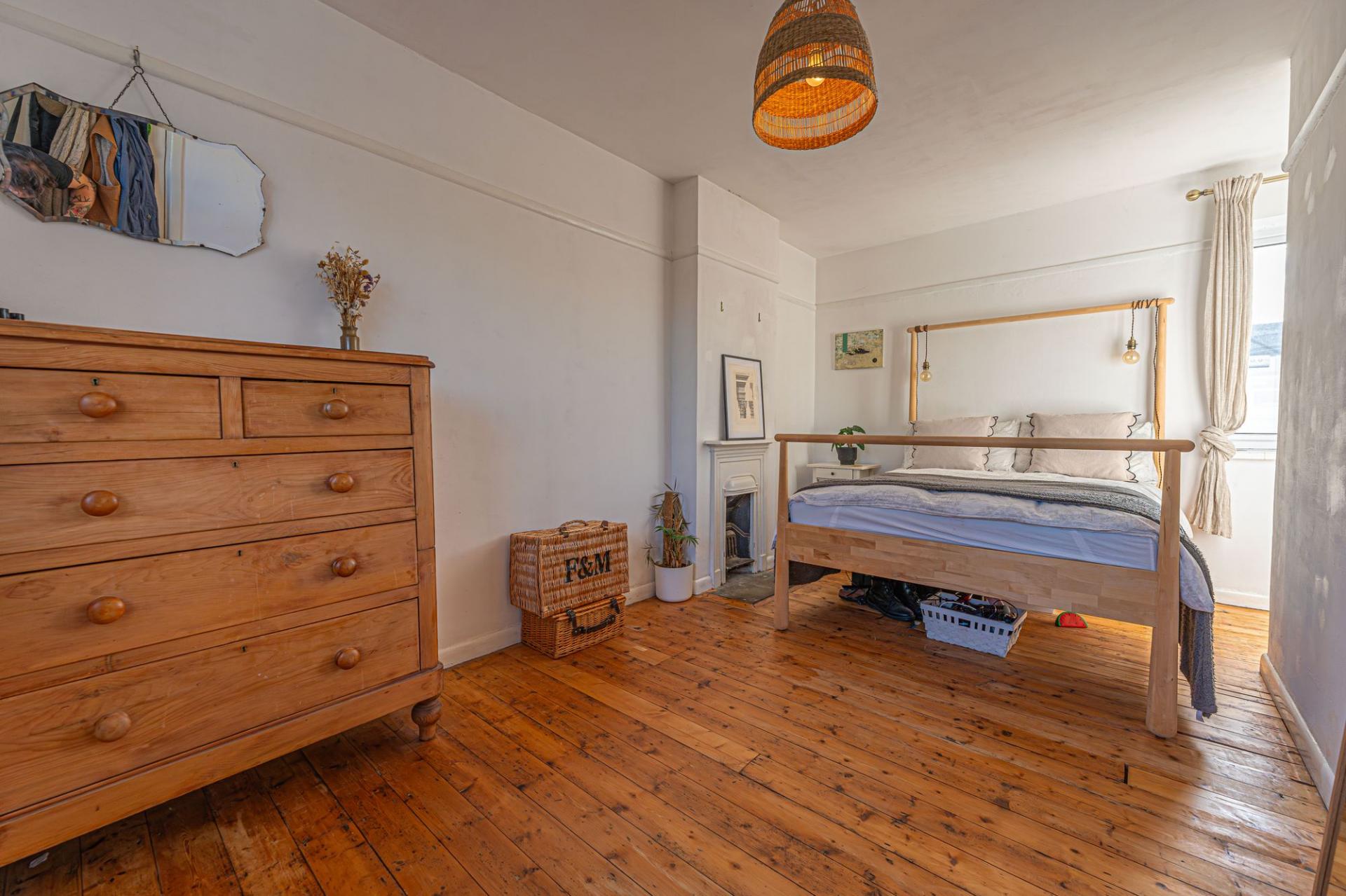 Ascending upstairs we can find the three bedrooms, two of which are well sized double rooms that feature original feature decorative fireplaces that add unique charm. The third bedroom is a comfortable single in size, and is currently in use as a home office, allowing residents a dedicated space for remote work or creative pursuits.
