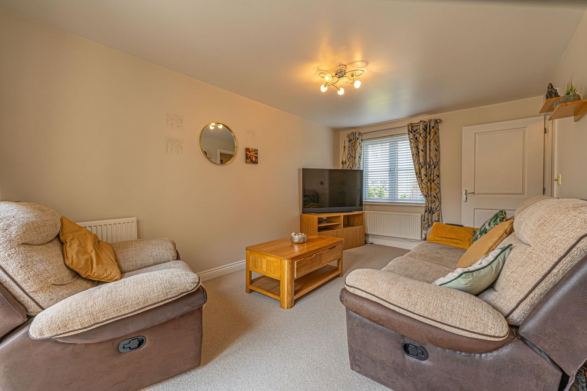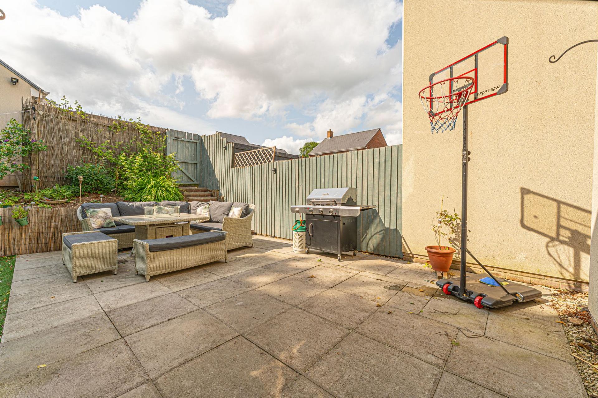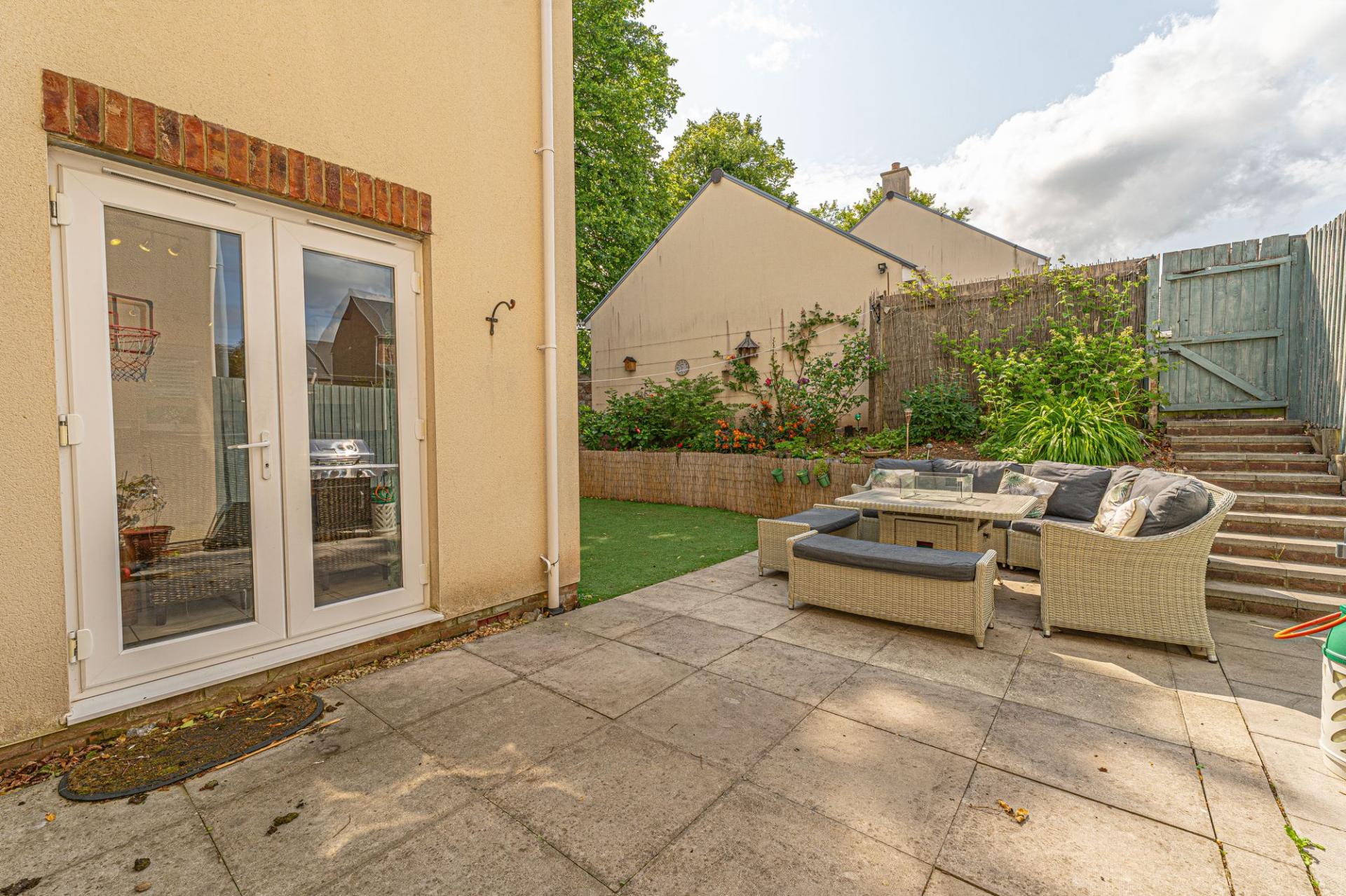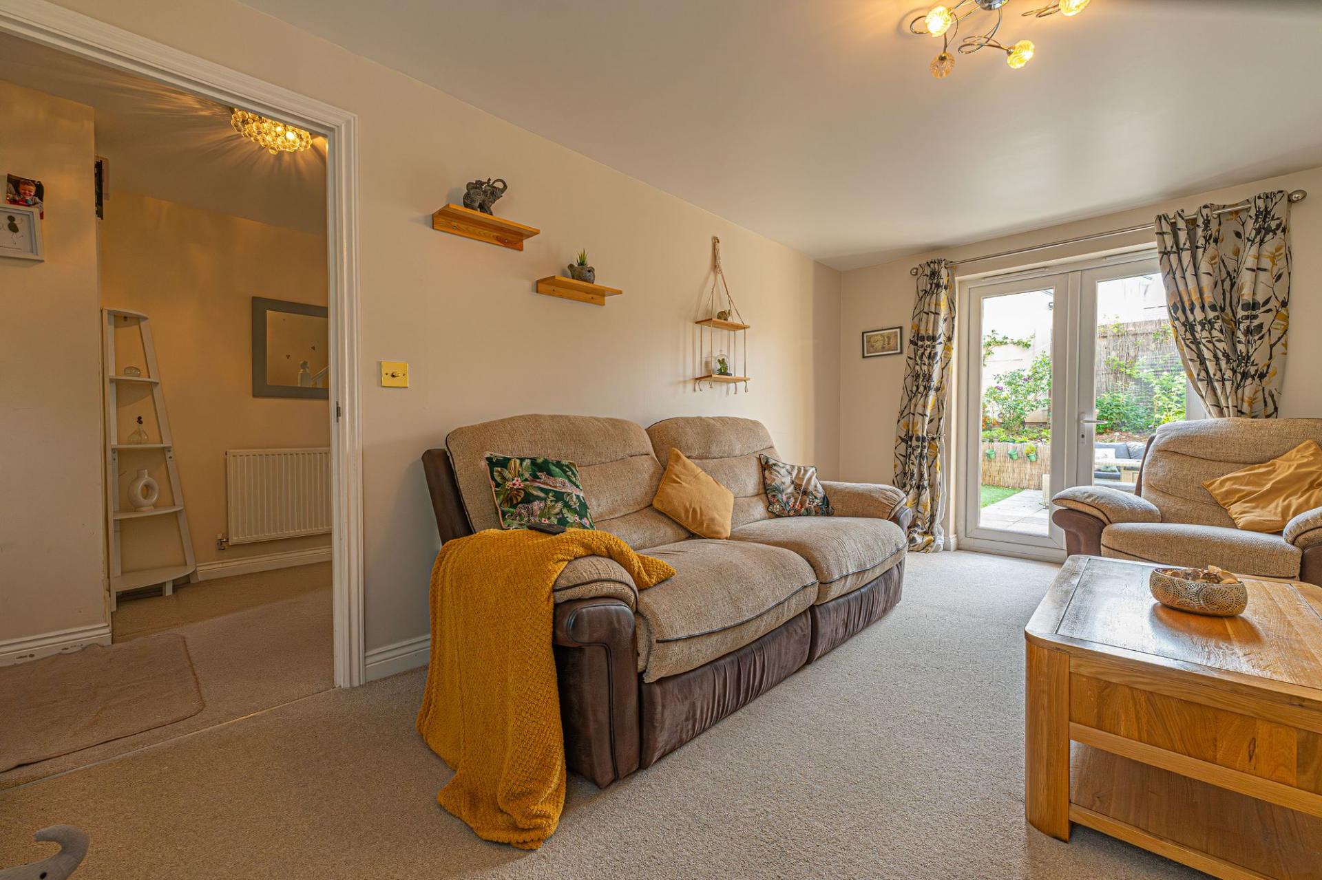 Stepping outside we can find the wonderful rear garden, which is fully enclosed and positioned on the end of the lane, enjoying a corner plot that is minimally overlooked and great for privacy. The garden itself is comprised of a blend of patio and turf lawn, ensuring a great low maintenance finish that is perfect for relaxing in the sunshine and welcoming guests for tea/coffee or dining al-fresco style. A gateway from the garden also connects to the lane behind the house, where we can find the garage and driveway, both of which can offer parking space. At the front of the house a footpath can be accessed for easy connections into the countryside, and a children’s play park found within a few minutes walk.