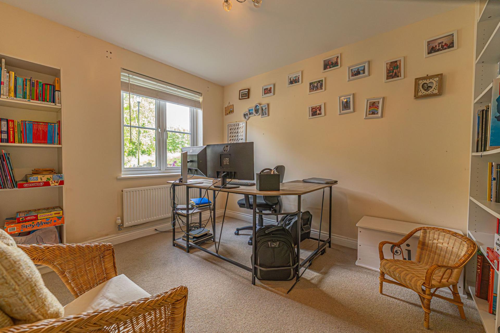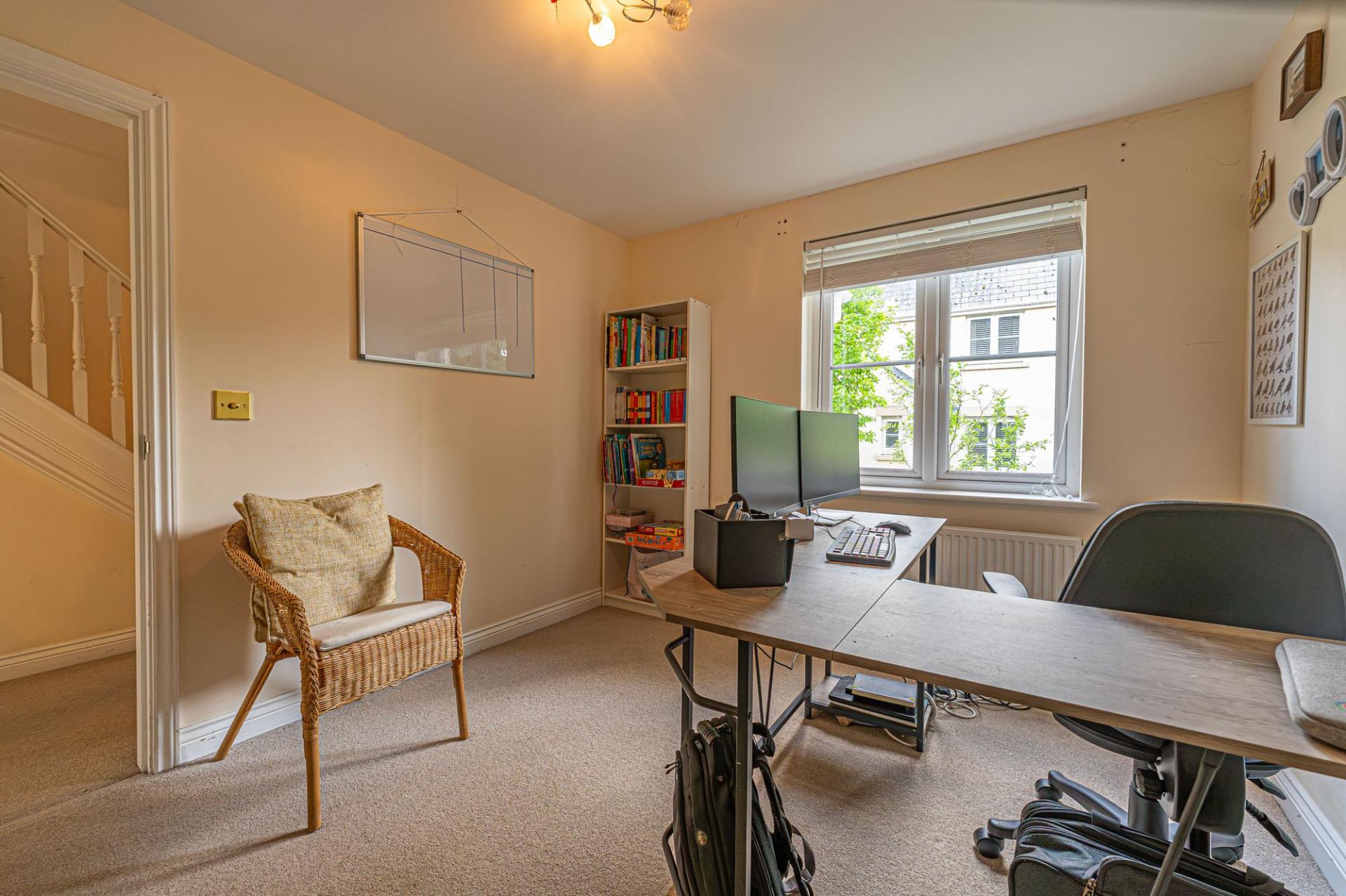 To the first floor we can access the four bedrooms, three of which are well proportioned double rooms, while the fourth is a cosy yet functional single, which has great potential to be reworked into another office space, or even a walk in wardrobe. Fitted wardrobe space can be found in two of the double rooms, including the primary bedroom, which has the added benefit of a private en-suite shower room, while the family bathroom is equipped with a bathtub and can be found from the landing.