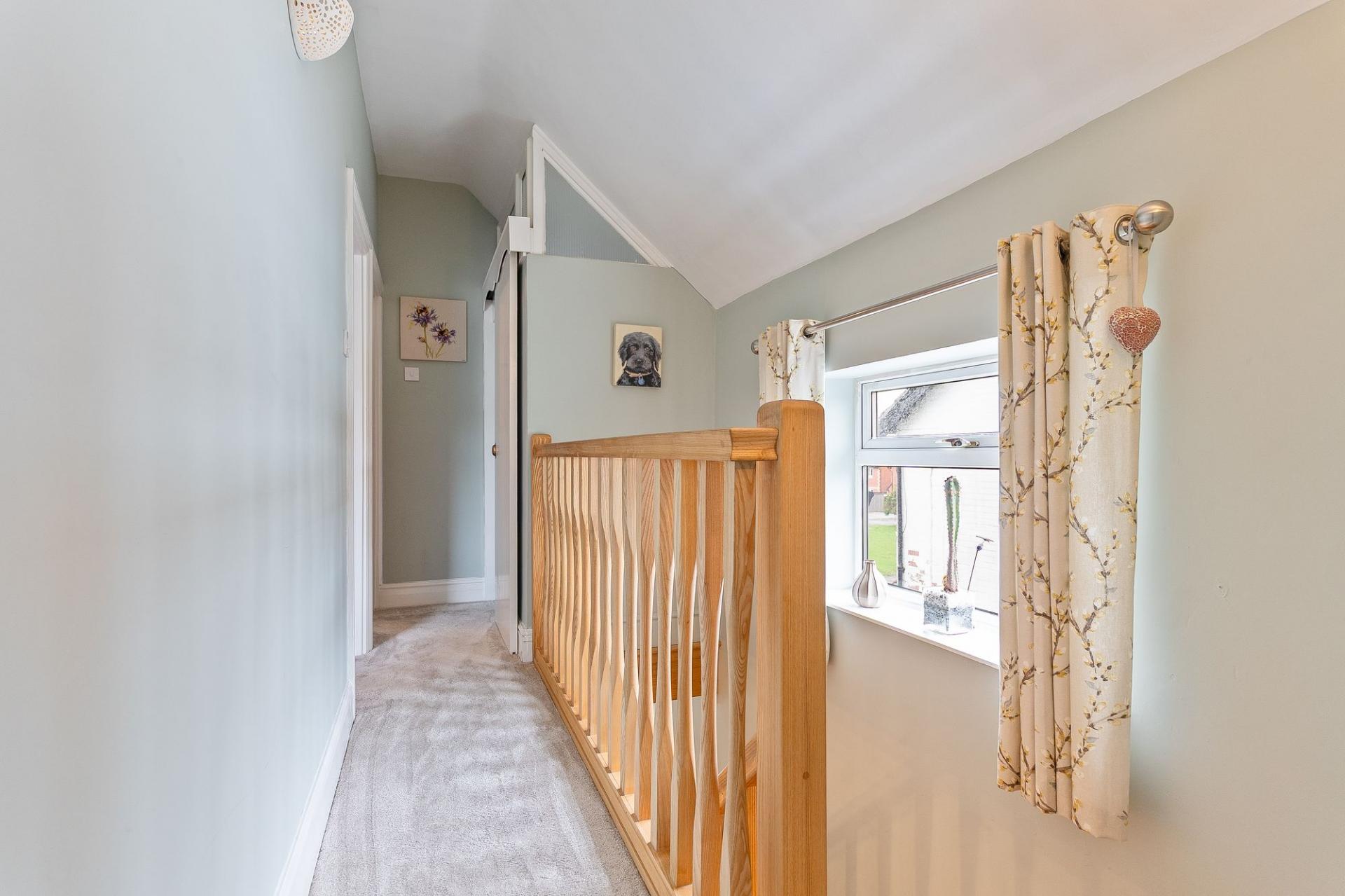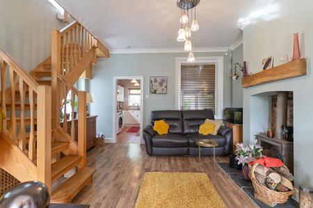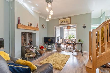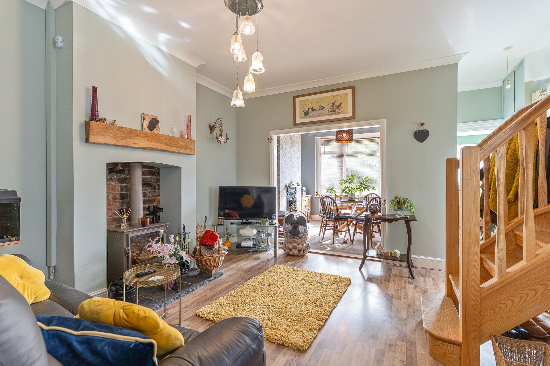 As you enter through the welcoming hallway, you’re immediately drawn into the bright and spacious open-plan lounge and dining area. The bay-fronted window floods the room with natural light, while the original fireplace in the dining area and a cosy log burner in the lounge — framed by a locally sourced oak beam — create a homely atmosphere for relaxing or entertaining. A beautiful ash staircase adds an elegant feature to the space.