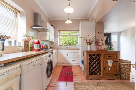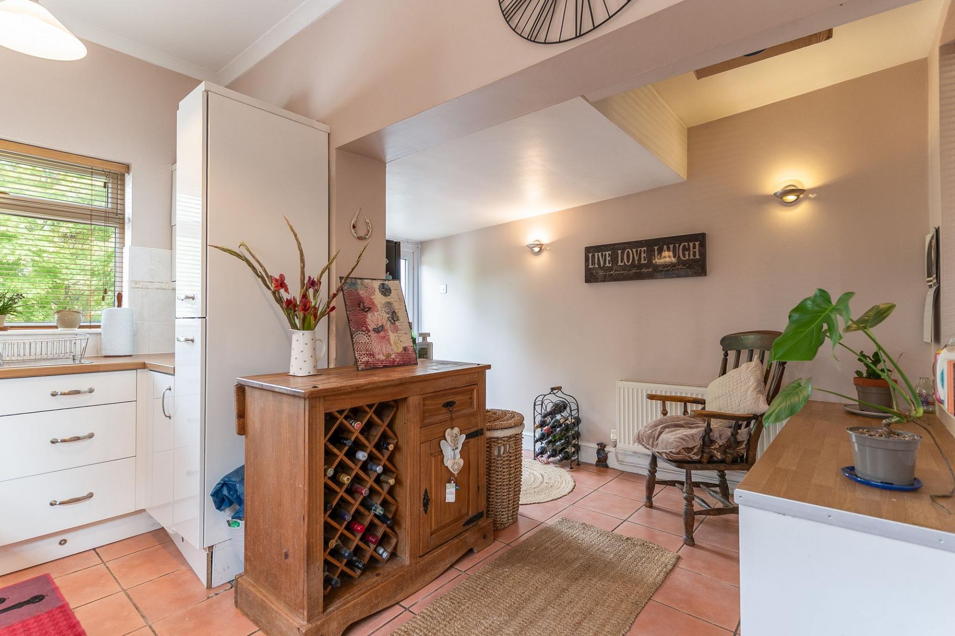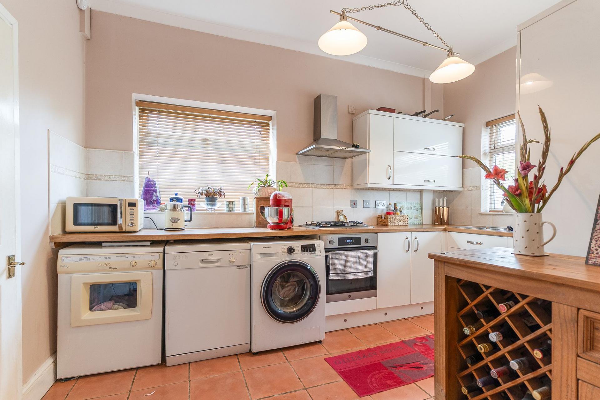 To the rear, the well-appointed kitchen offers ample worktop and storage space and direct access to the garden, making it ideal for those who love to cook and entertain.