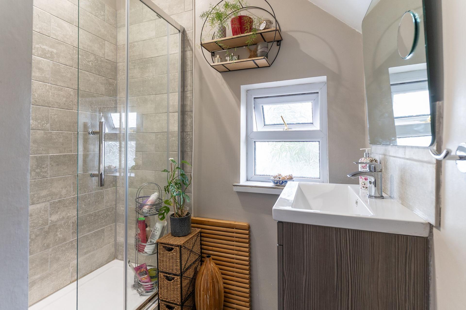 The first floor hosts three generous double bedrooms, each offering comfort and flexibility for family living, guests, or home working. The modern shower room has been finished to a high standard, complete with a large walk-in shower, wash basin, and WC.