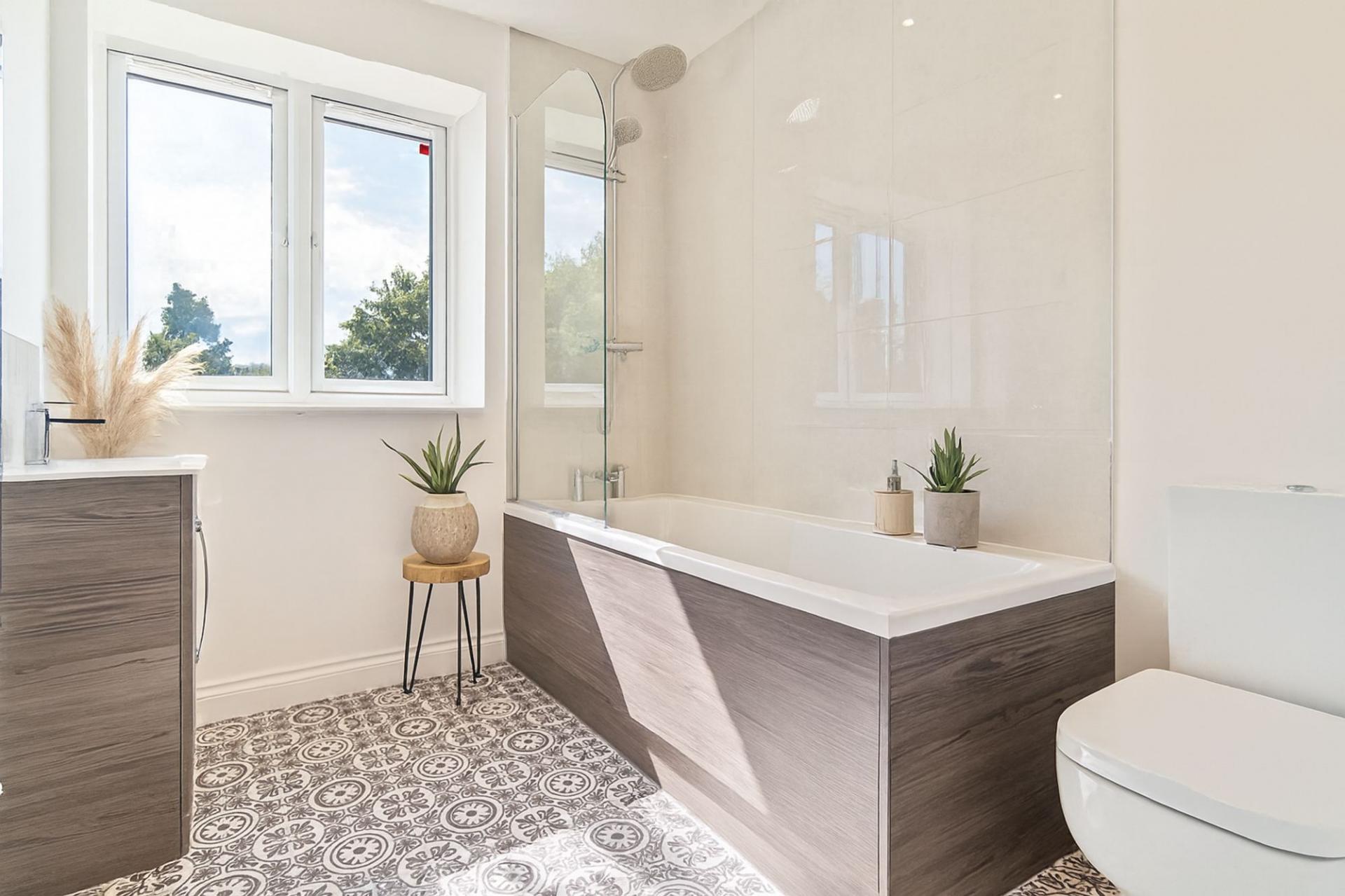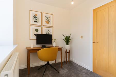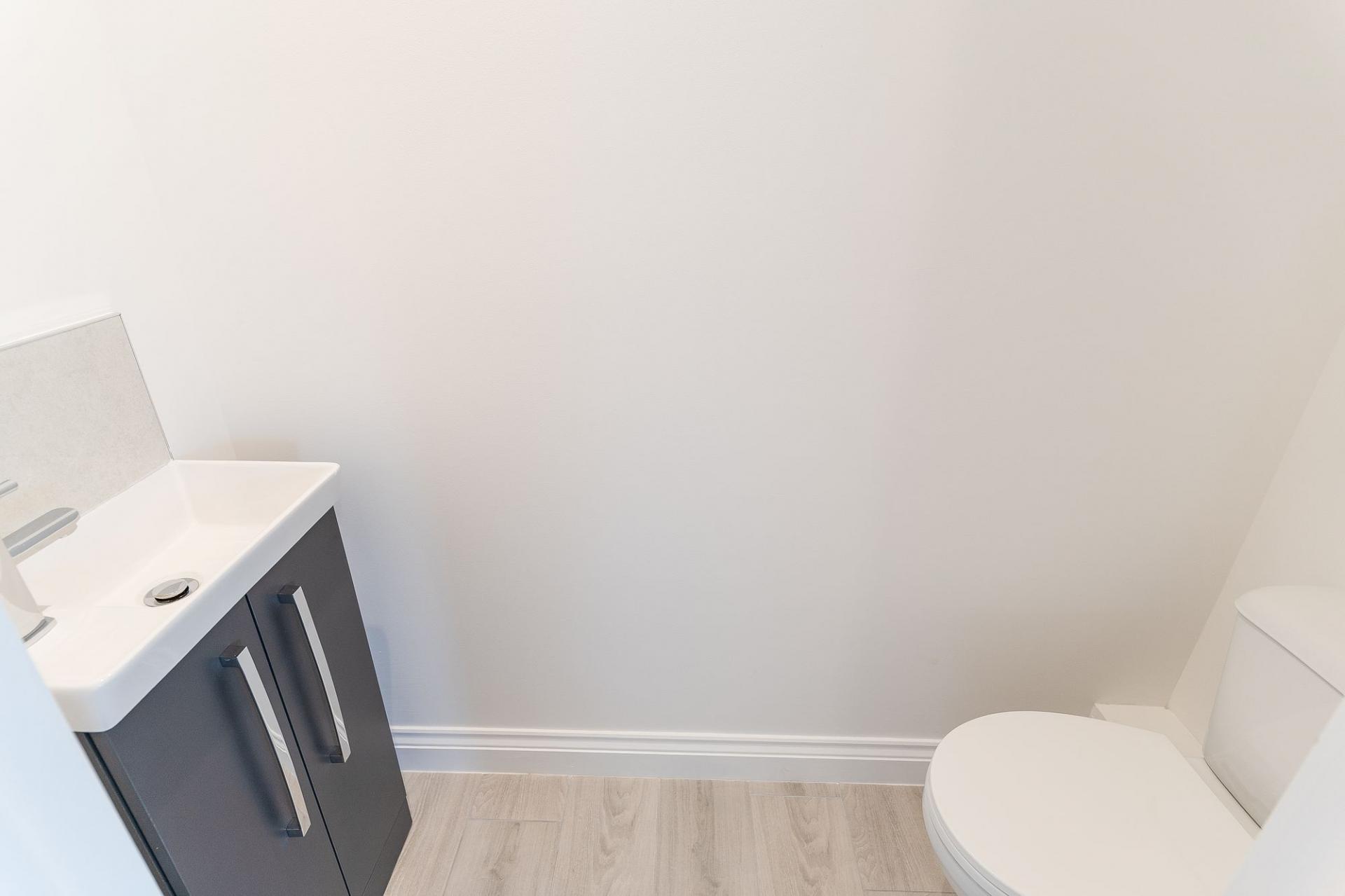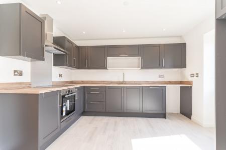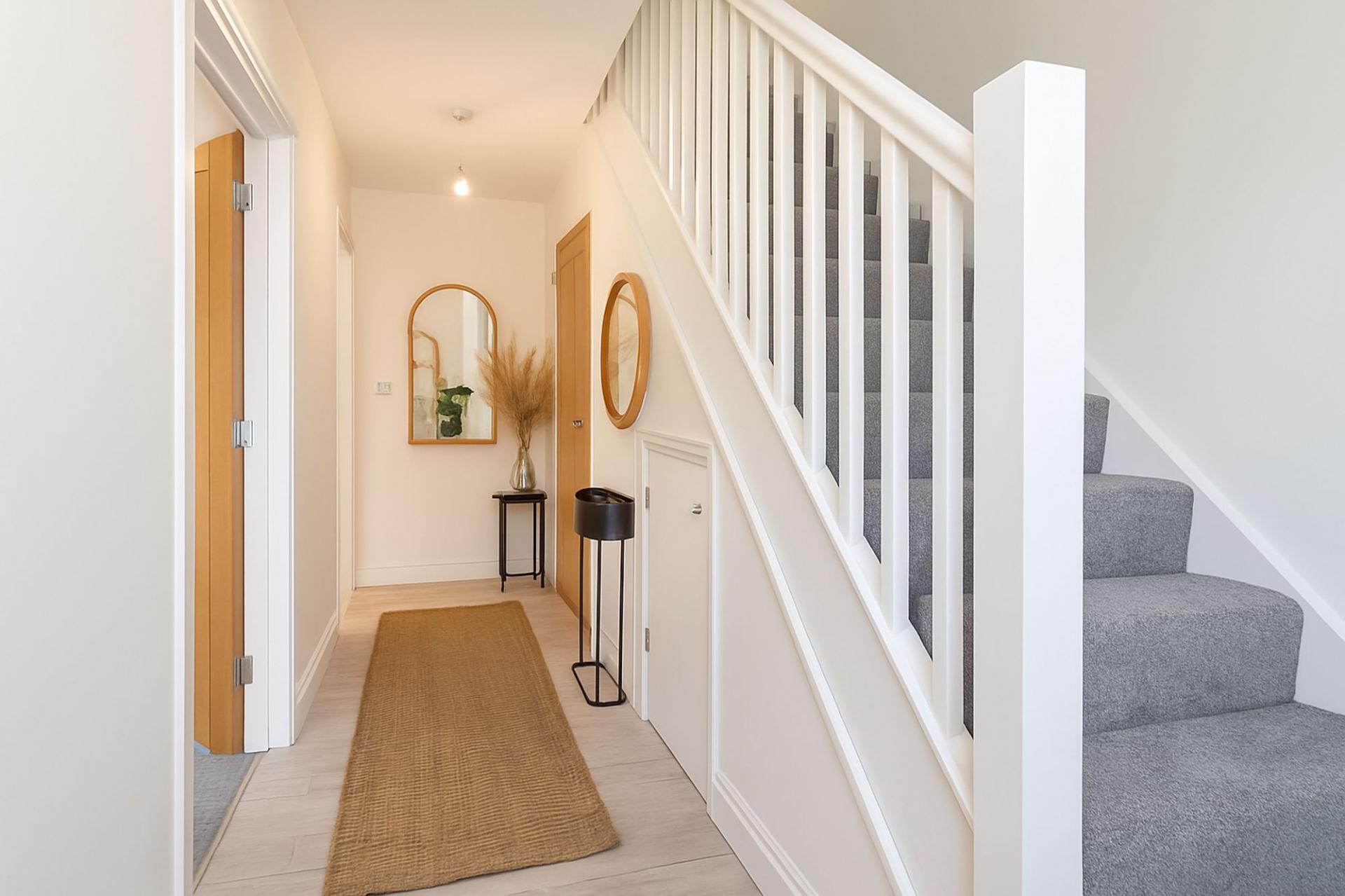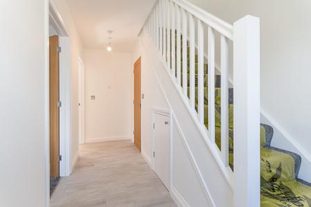 On the ground floor, you are welcomed via the entrance hall, which provides access to the main living spaces, a convenient cloakroom with WC and hand basin, and the staircase to the first floor. To the left, the living room offers a comfortable space to relax, while to the rear of the property lies the bright and modern open-plan kitchen and dining area. This stylish space is perfectly designed for family living and entertaining, with patio doors leading directly out to the garden. Underfloor heating completes the downstairs offering great warmth and comfort.