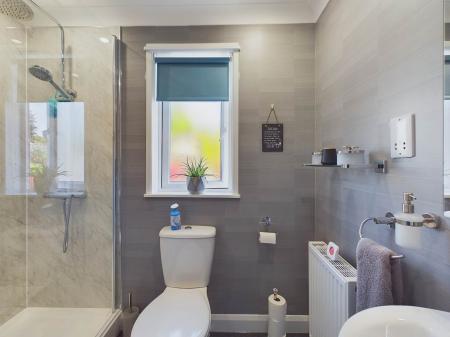 Low level WC, wash hand basin with tiled splashback, shower cubicle with enclosing doors and screens housing the bar shower, aqua waterproof wall covering. Radiator, uPVC double glazed frosted window to the rear elevation, extractor.