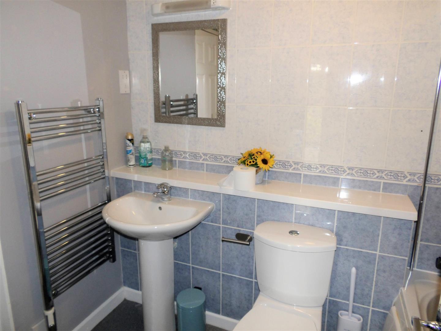 Jack And Jill Bathroom - White suite comprising panelled bath, pedestal wash hand basin, low level WC. Tiled flooring, tiled walls and heated towel rail.