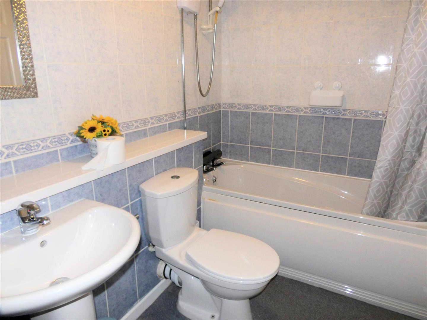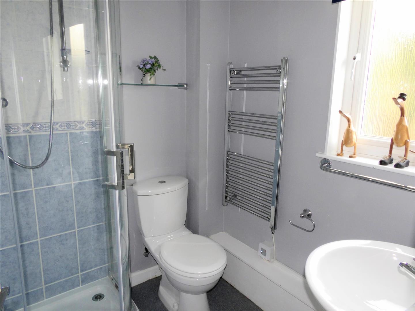 Shower Room - Obscured uPVC double glazed window. Suite comprising corner shower cubicle, sink unit, low level WC, tiled flooring, part tiled walls and heated towel rail.