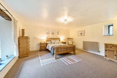 Suite comprising of low level WC, period style vanity unit incorporating the wash hand basin with tiled splash back edged in wood and cabinet beneath. Oak double glazed window to the front elevation with slate sill, shaver light and point. Shower cubicle including a tray, enclosing doors and electric shower. Tiling to the walls, beams, radiator, display niche and tiling to the floor.