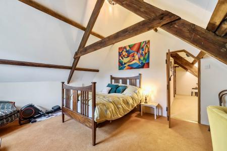 Double bedroom with large double glazed Velux window, radiator. A frame ceiling beams, recessed area suitable for wardrobes and bedroom furniture which has the possibility of being adapted to provide an en suite.