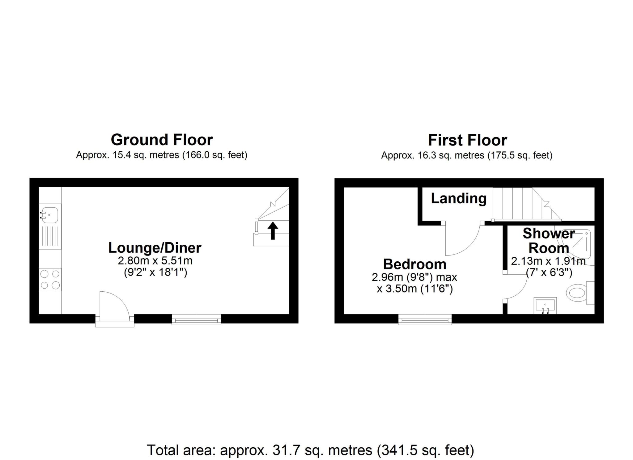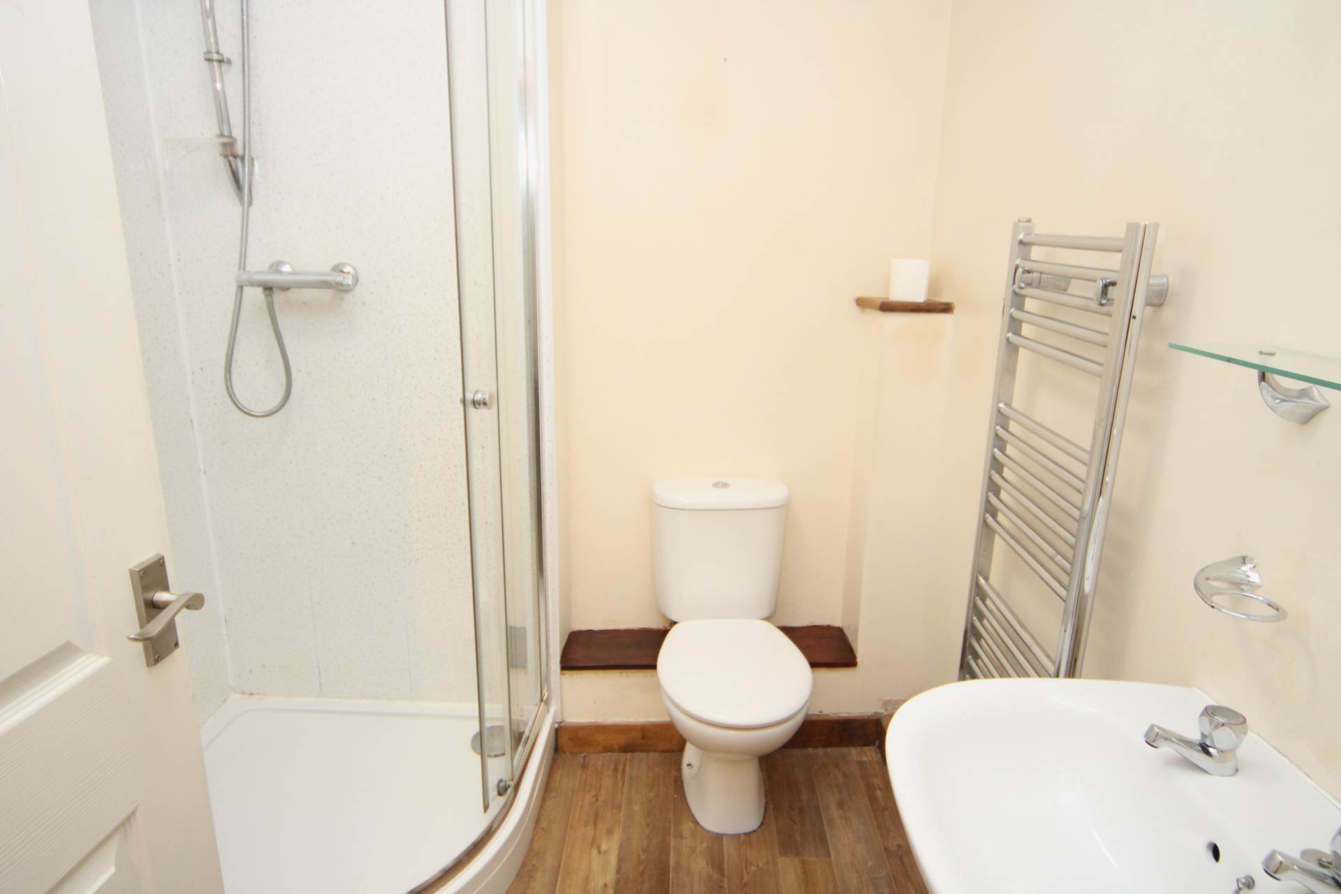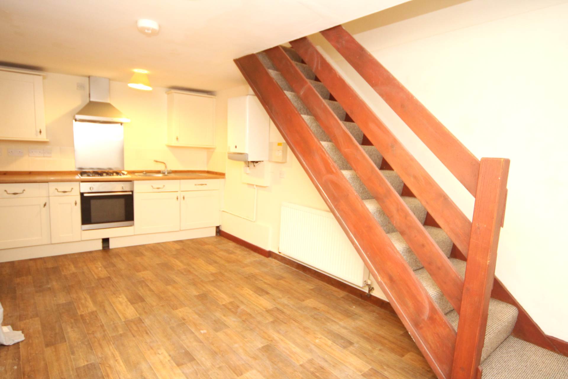 Description:- The front door opens to the open plan Kitchen/Dining/Lounge. The Kitchen area is fitted with a range of wall and base units, roll top work surfaces, four ring gas hob with stainless steel canopy above and there is an oven/grill beneath. Central heating and hot water boiler. The Lounge/Dining area has a radiator space for reception furniture and small dining room table and chairs. Stairs rise to a small Landing on the first floor. The Double Bedroom has Loft access and is nice and light and faces the front The Shower room is fitted with low level WC, wash hand basin, shower cubicle housing the shower with enclosing doors, screen and tray. There is Aqua wall covering, plumbing and space for a washing machine, heated towel rail, shaver light and point.