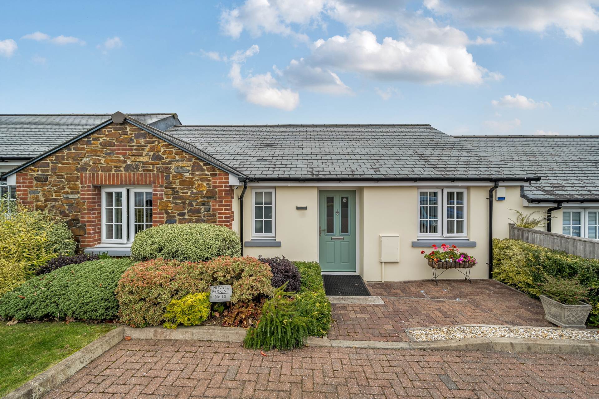 To the front there is a paved area and parking for one vehicle. Matching paved pathway and granite step leads down to the entrance and to there are shrub beds to the left hand side. There is also visitors parking within the development.