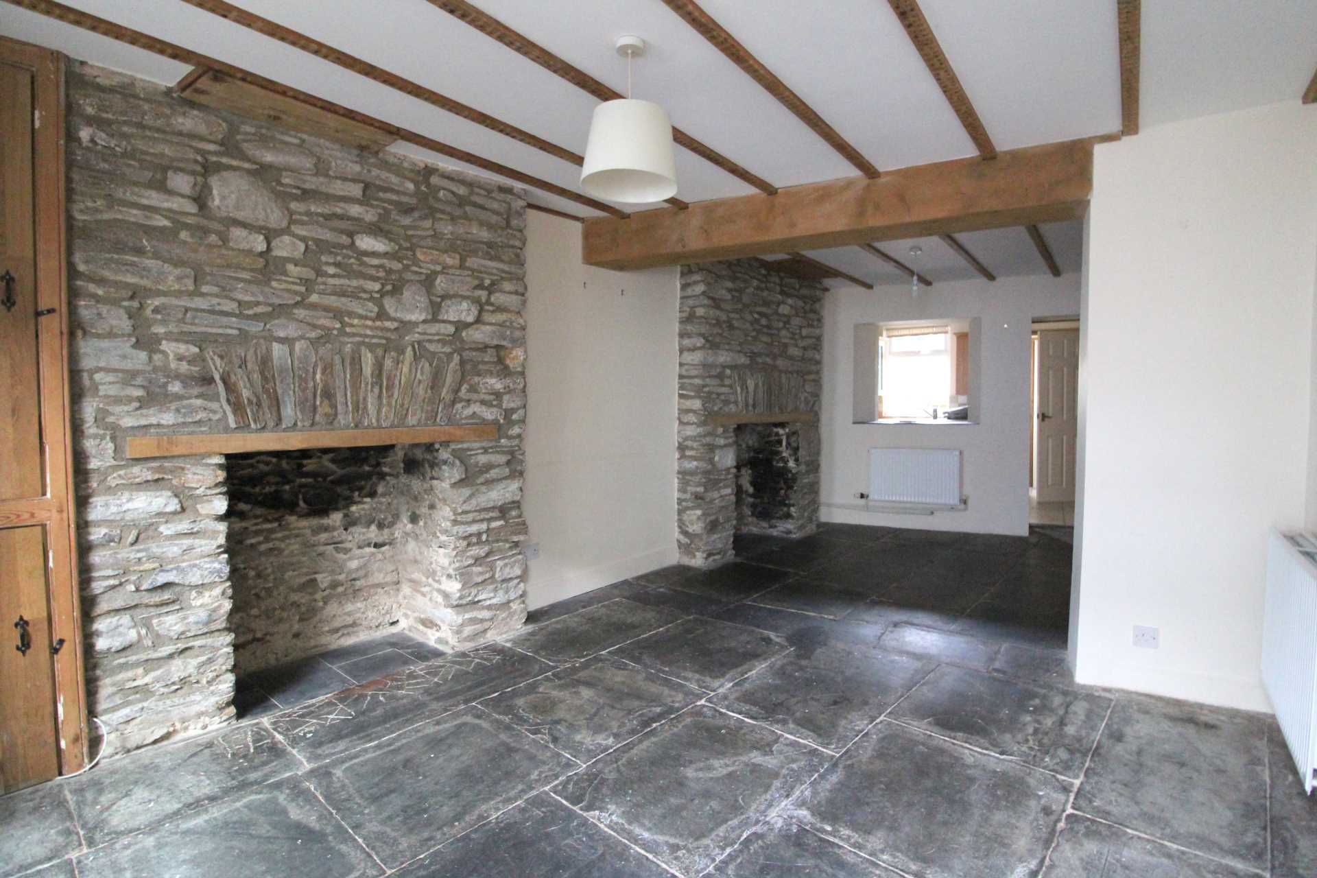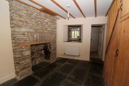 Open plan staircase with shaped balustrade and fitted carpet rising to the first floor landing. Full height exposed slate feature fireplace with wooden mantle. Double doors give access to built-in under stairs cupboard with further storage cupboard over. Ornamental exposed beamed ceiling, telephone point, radiator and original slate flagged flooring. Open recess through to the kitchen.