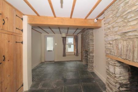 Front aspect uPVC double glazed window with exposed original wood panelling and window seat beneath. Granite exposed full height Inglenook feature fireplace with wooden mantle. Oak built-in cupboards to recess where the gas meter and electricity consumer unit can be found. Ornamental exposed beam ceiling, aerial connection, double panelled radiator and original flagged slate flooring.