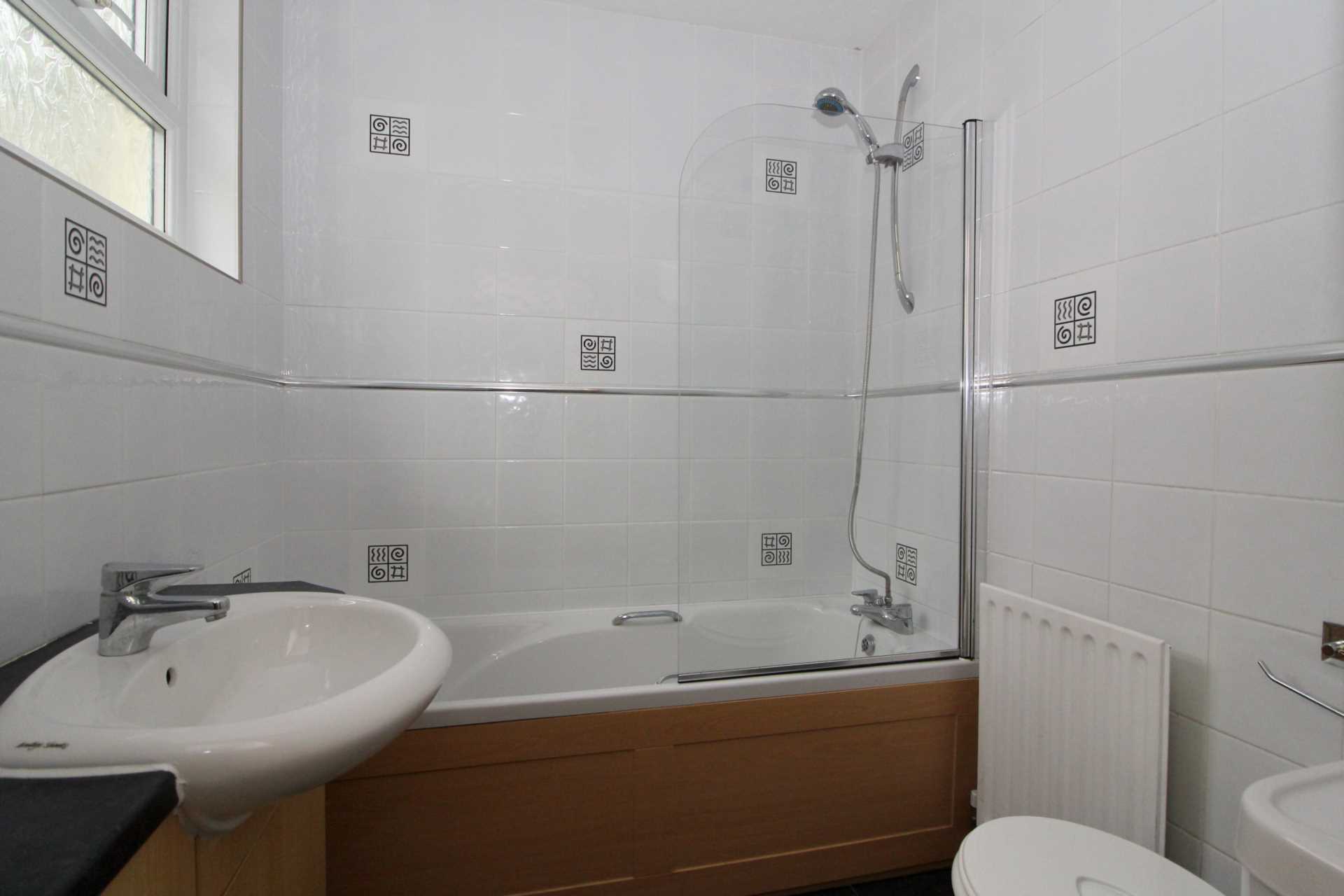 Side aspect uPVC double glazed window with opaque glass. Modern bathroom suite in white comprising of low level W.C., vanity wash hand basin with built-in cupboard space and panelled bath with mixer tap and shower attachment. Wall mounted extractor fan, radiator and ceramic floor tiling. The room has been fully tiled with a decorative white and stainless steel effect feature.