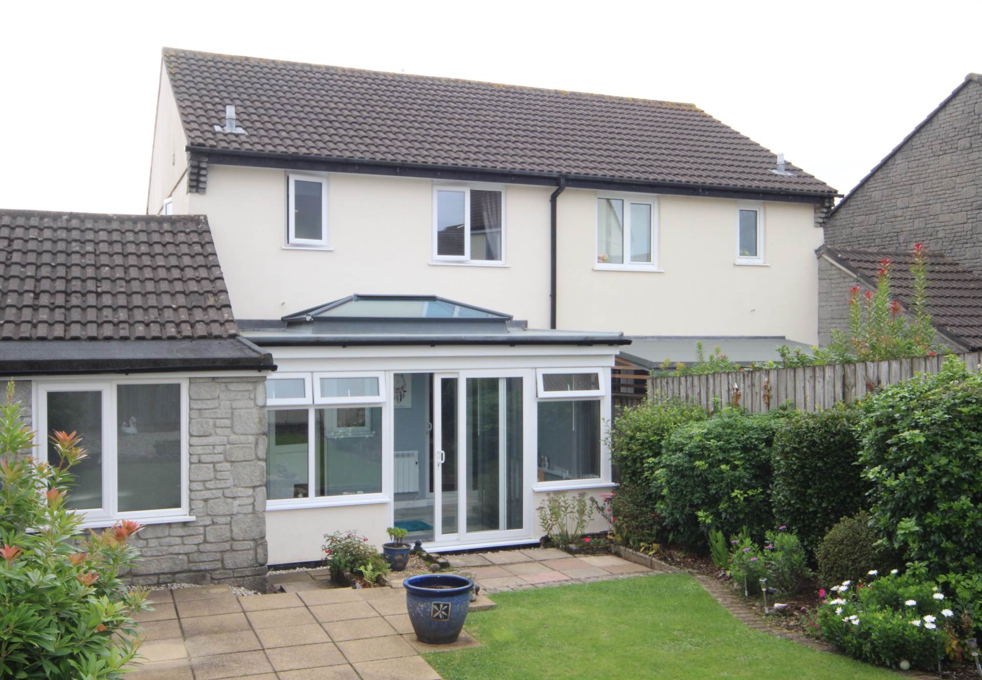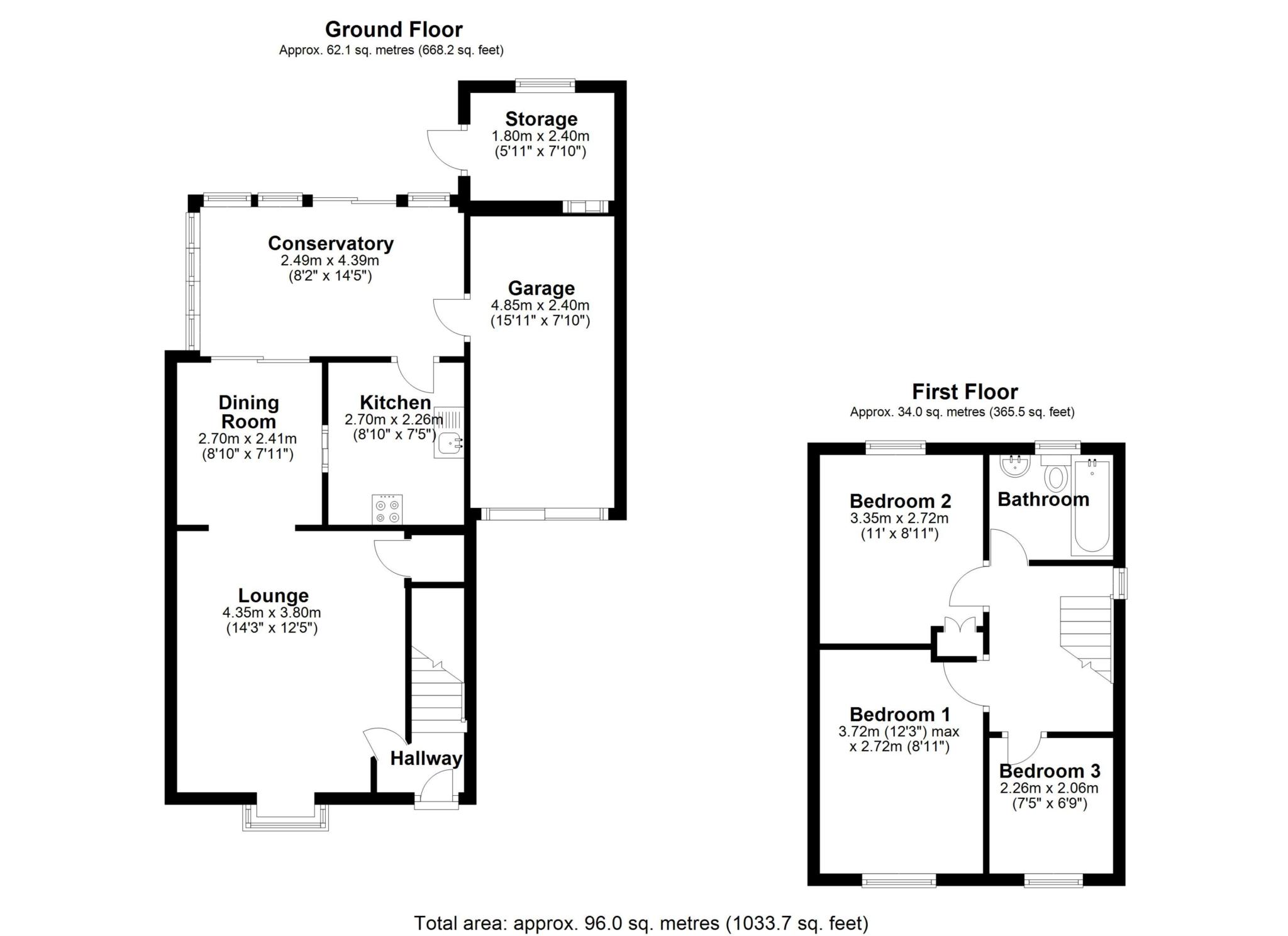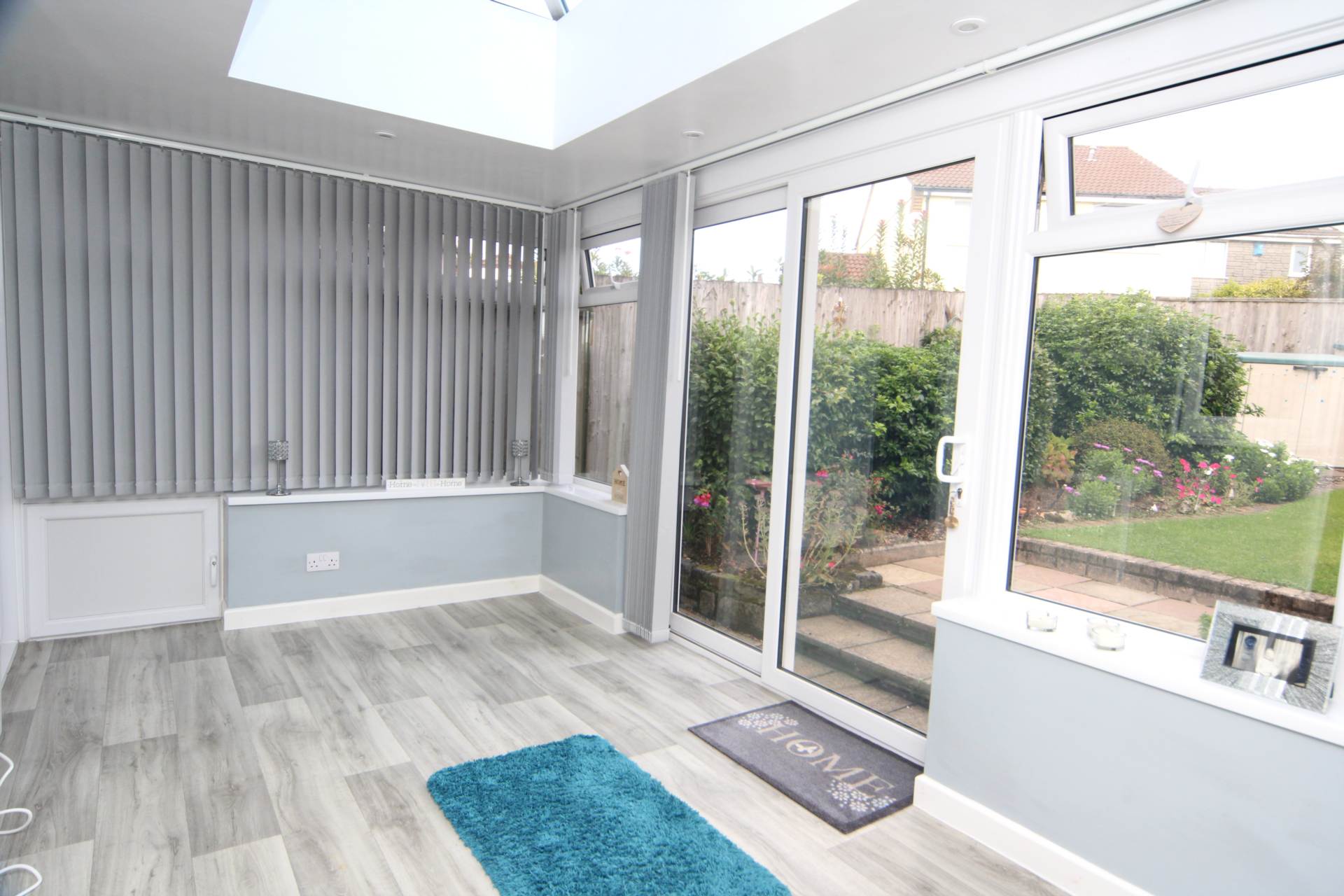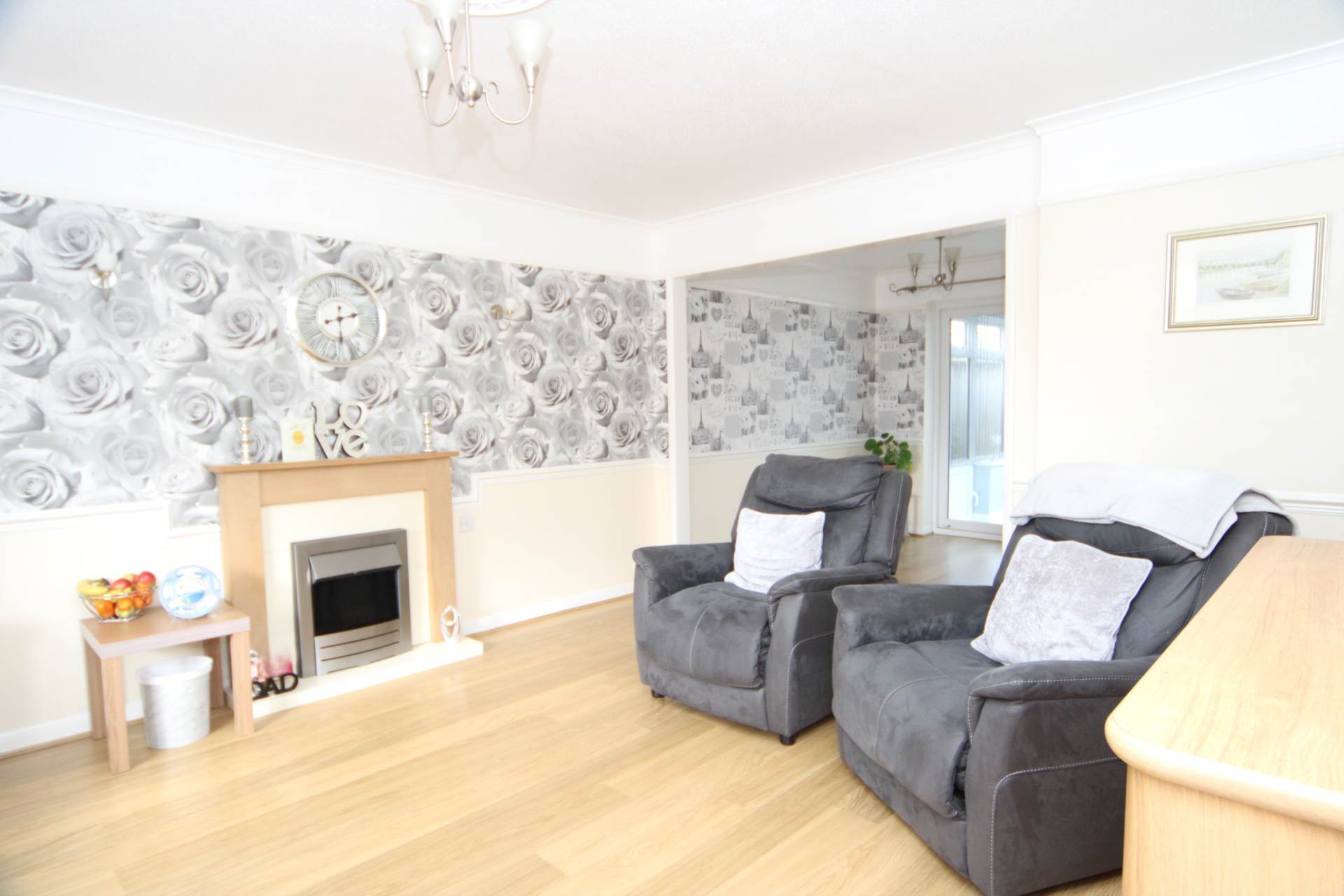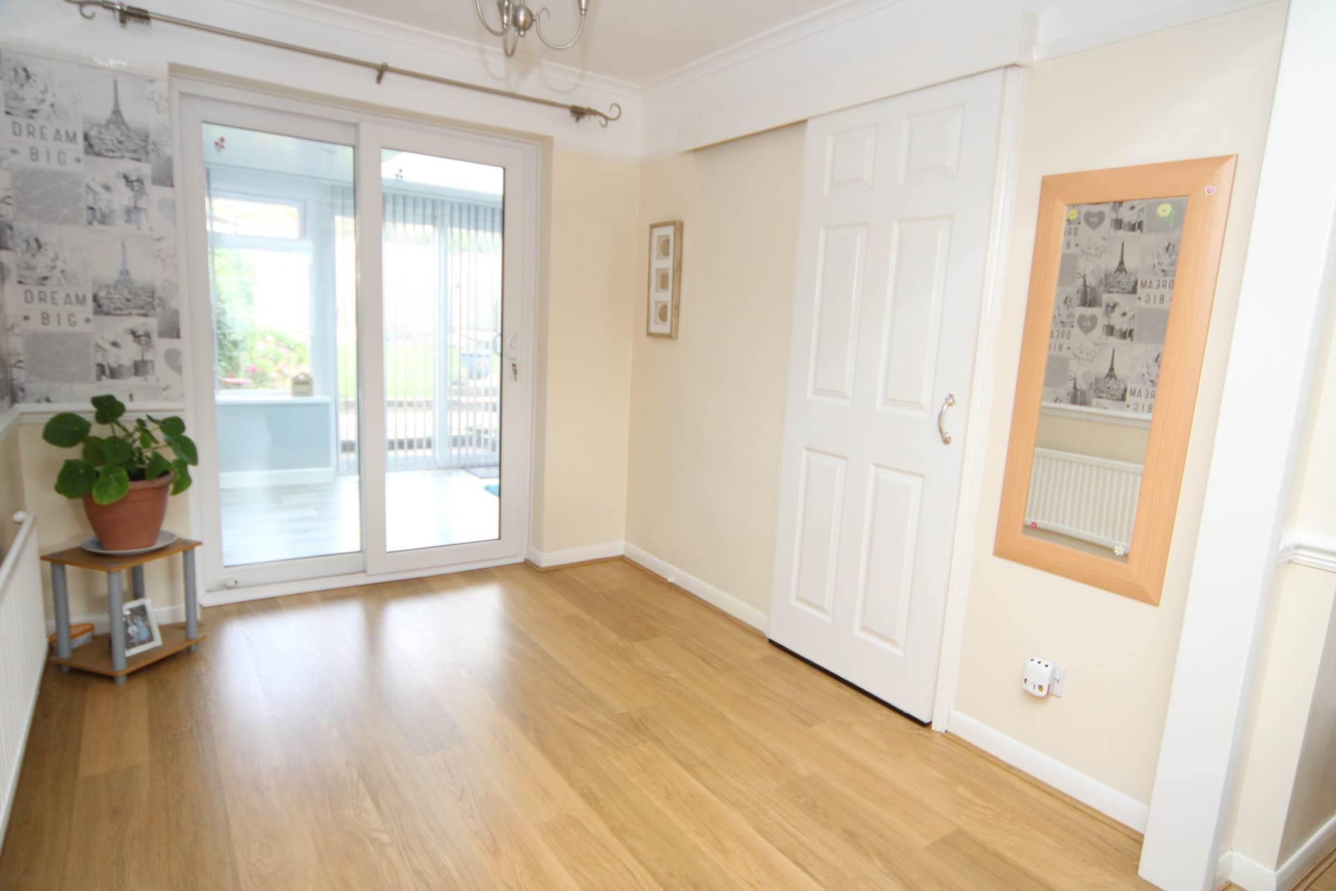 A pathway leads up to the front entrance door allowing access to the Hallway, with stairs rising to the first floor. The good sized Lounge has a living flame electric fire with a surround and mantel set on a hearth. There is a large bay window which lets a lot of light in to room and a useful under stairs storage cupboard. A square archway leads through to the Dining room; which has sliding patio doors leading to the conservatory. The modern kitchen is fitted with a range of wall and base units, glass fronted display units and a built in dishwasher. A door leads out to the large Conservatory which has an orangery style glass roof and sliding patio doors which open in to the attractive rear garden. From here a door leads to the Garage and the Storage room. On the first floor there is a Landing which gives access to the bedrooms and bathroom and provides access to the loft. There are three bedrooms, Bedroom one faces to the front and is a double bedroom. Bedroom two is a double bedroom facing to the rear and overlooking the garden. It has a wardrobe with a cupboard above. The third Bedroom is a single room facing to the front. The Bathroom has a suite which includes low level WC, wash hand basin and a bath with a Mira shower over. The property has the benefit of Gas central heating and uPVC double glazing.