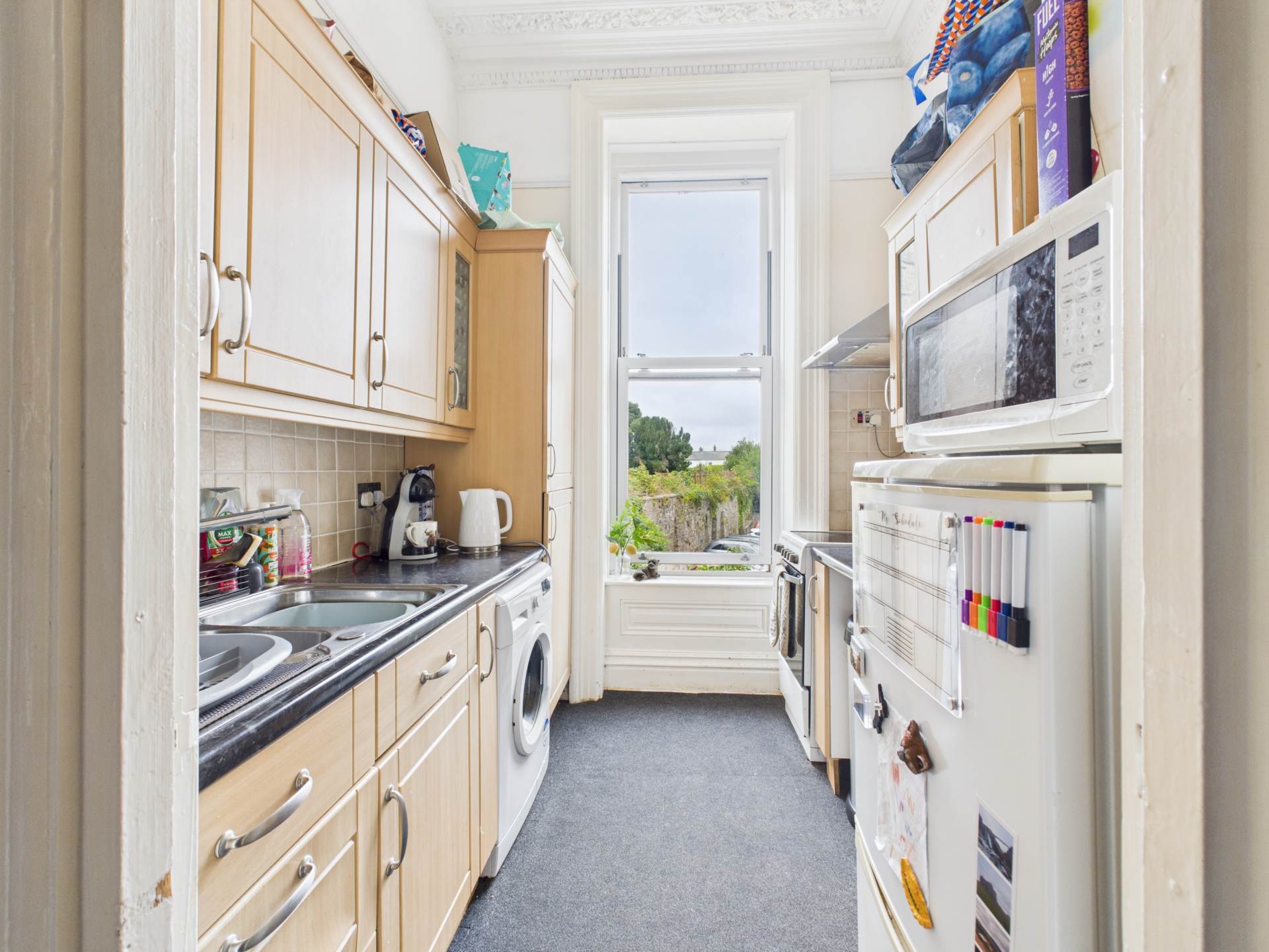 Description:- You first enter the building by the main entrance door which opens to the communal hall. Stairs rise the the first floor and the entrance to Flat 2. A door gives access to the spacious Hallway having enough space to store coats and shoes. The light and airy Lounge/Dining room has ample space for reception and dining furniture, large feature bay window and modern electric heater. The Kitchen is fitted with a range of wall and base units, work top surfaces, space for upright fridge/freezer, plumbing for washing machine and space for cooker. There is a large Double Bedroom again with a feature bay window and modern electric heater. The Bathroom completes the accommodation. CASH BUYERS ONLY DUE TO LENGTH OF LEASE.