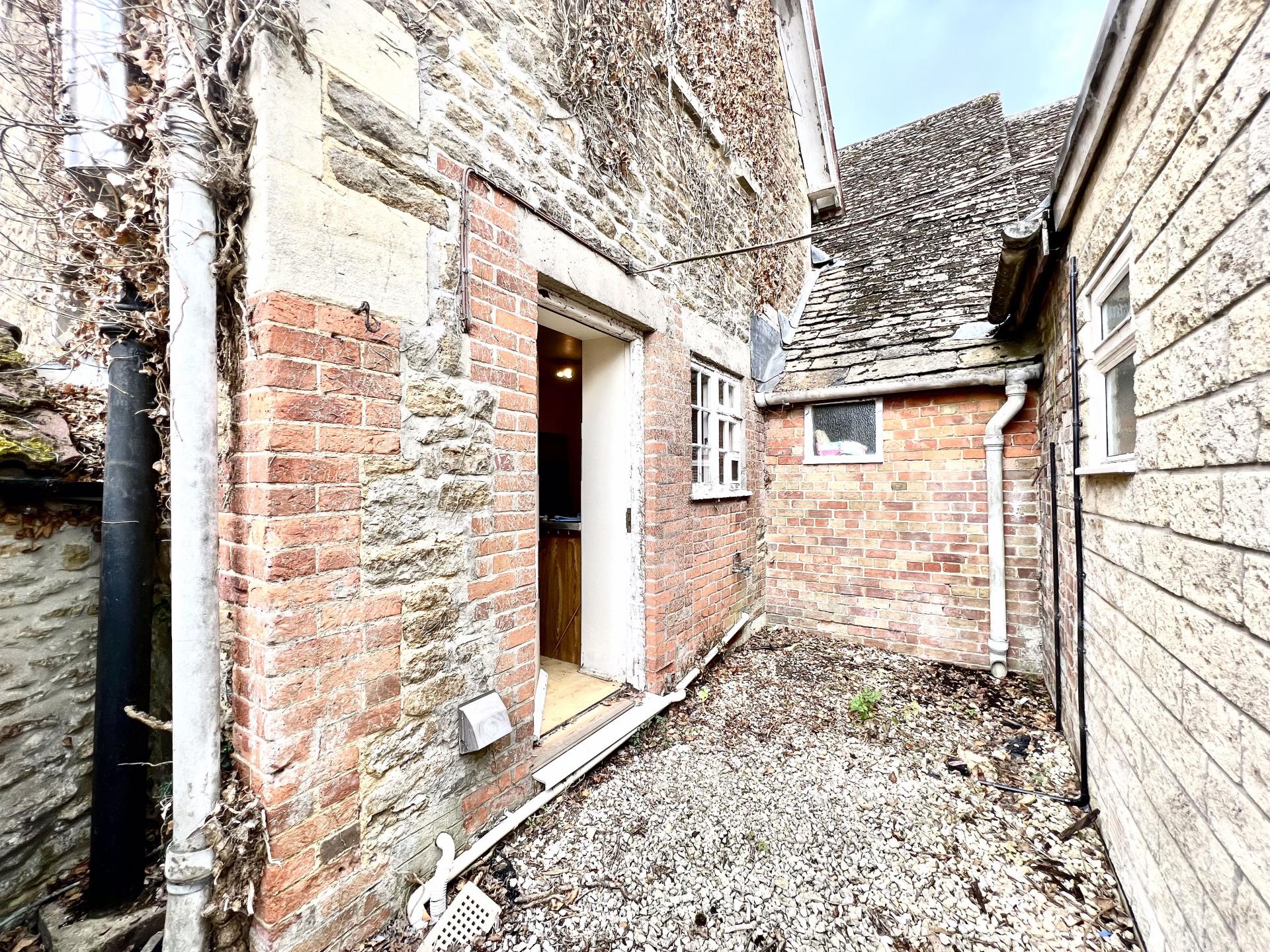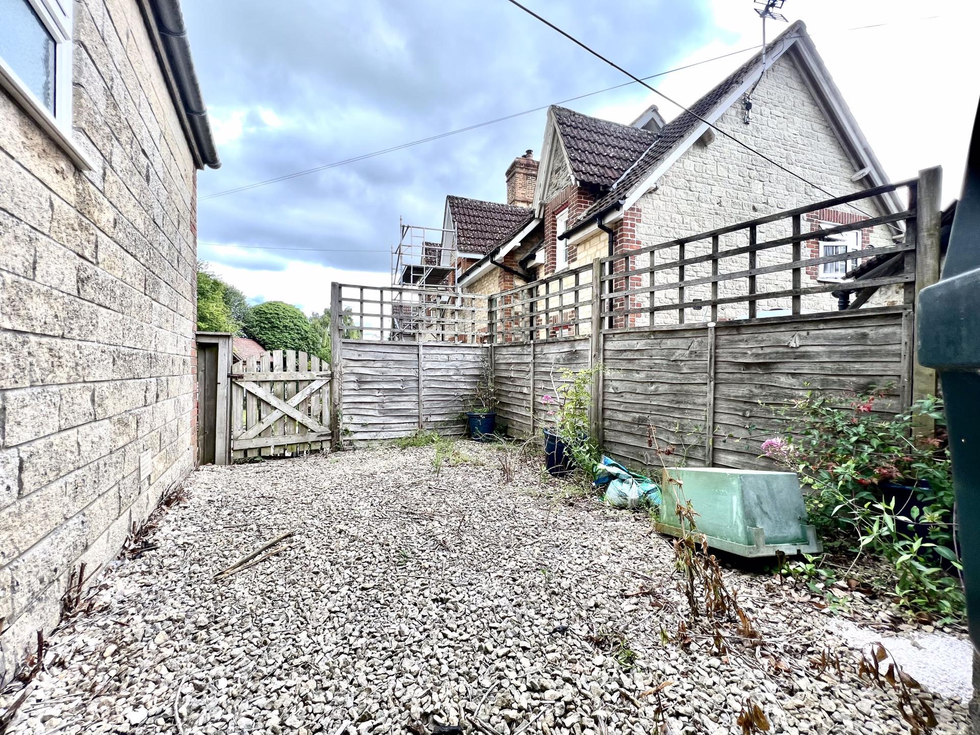 A courtyard with oil storage tank and pedestrian access gate to the rear.
